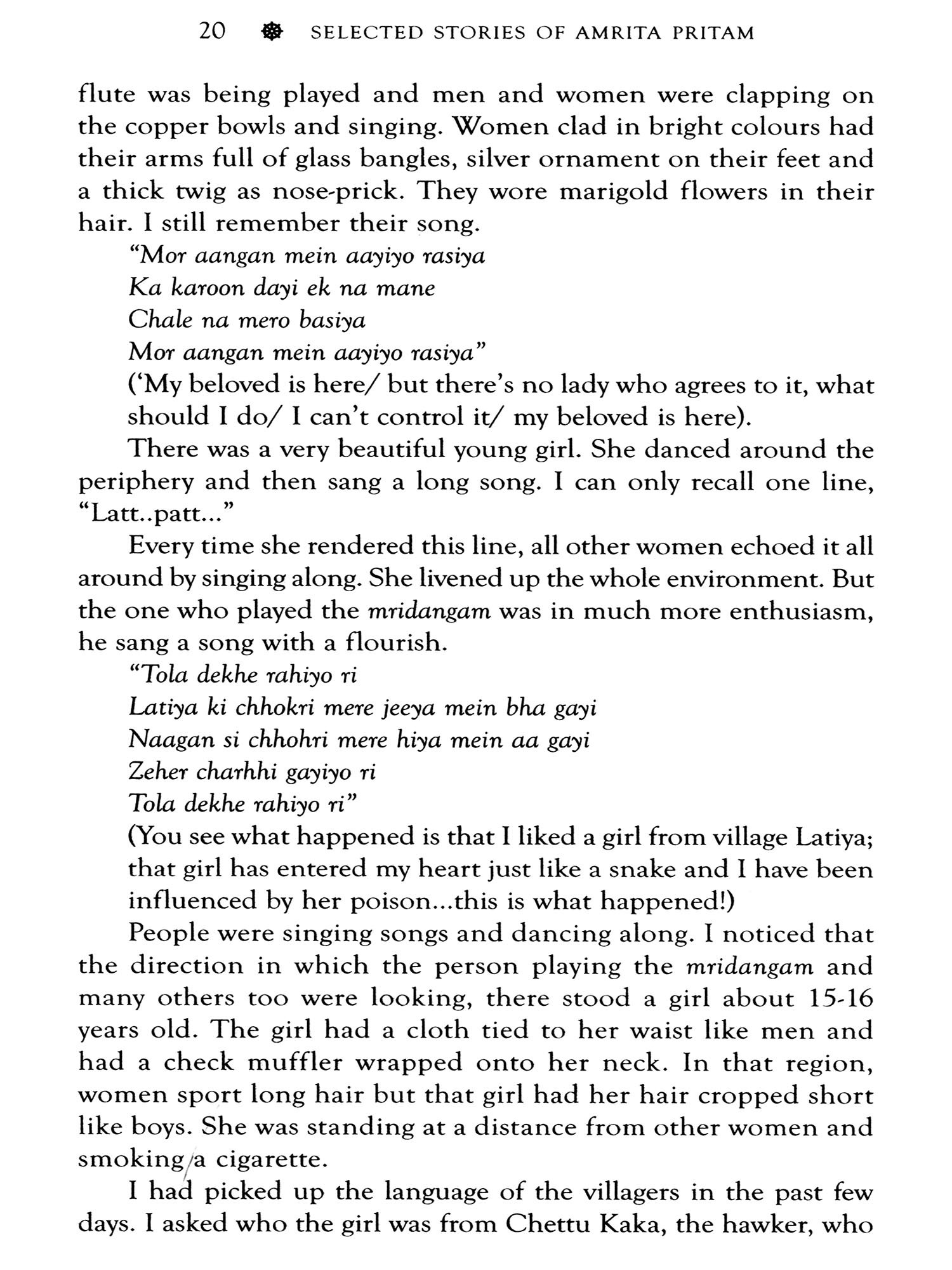 Amrita Pritam is a woman, a poet, a creator and an artist. She knows the nuances of depicting emotions. The conversational style is the achievement of her short stories. She has the expertise of using words most appropriately. Amrita Pritam is actually a poetess. She herself admits that, "It was my imagination or experience that made me write stories, while I was writing only poetry." (26 vare Baad-1943)