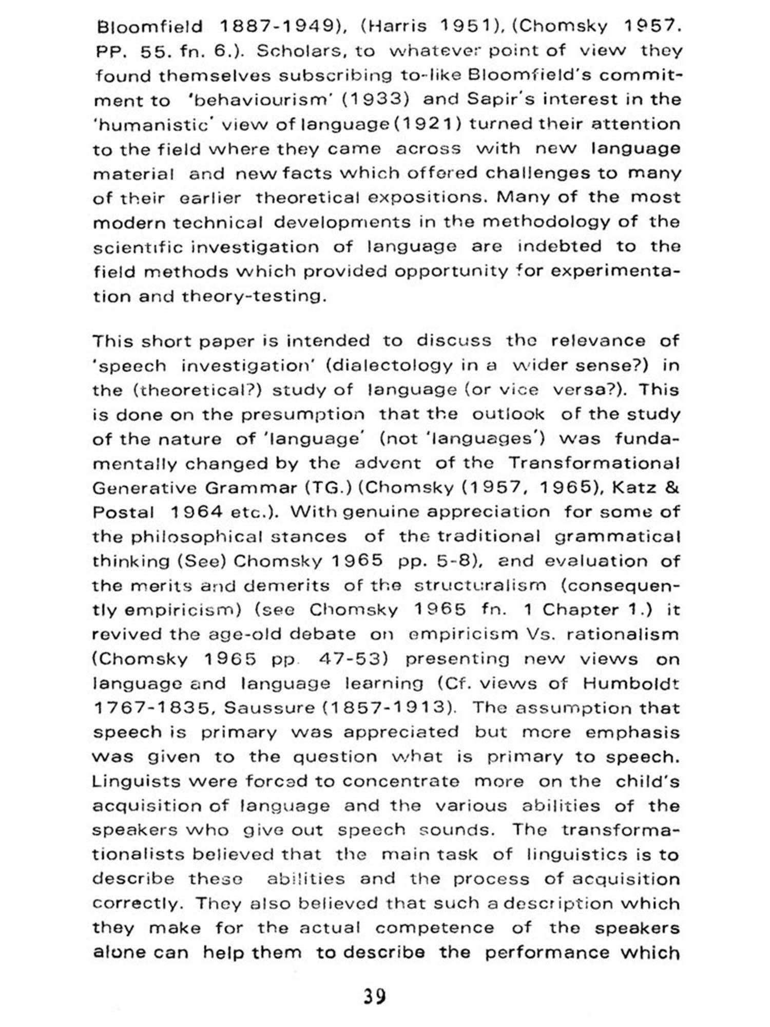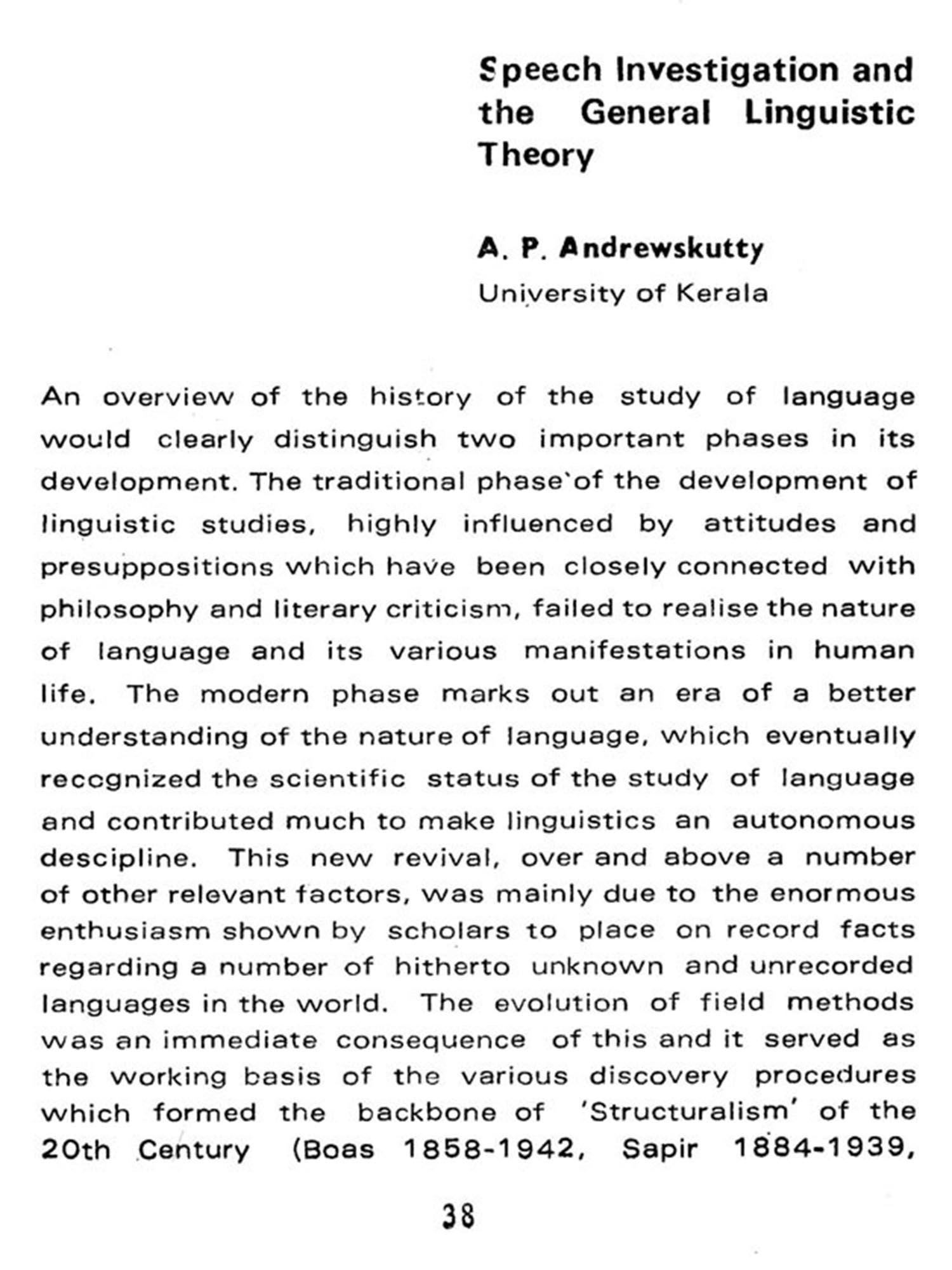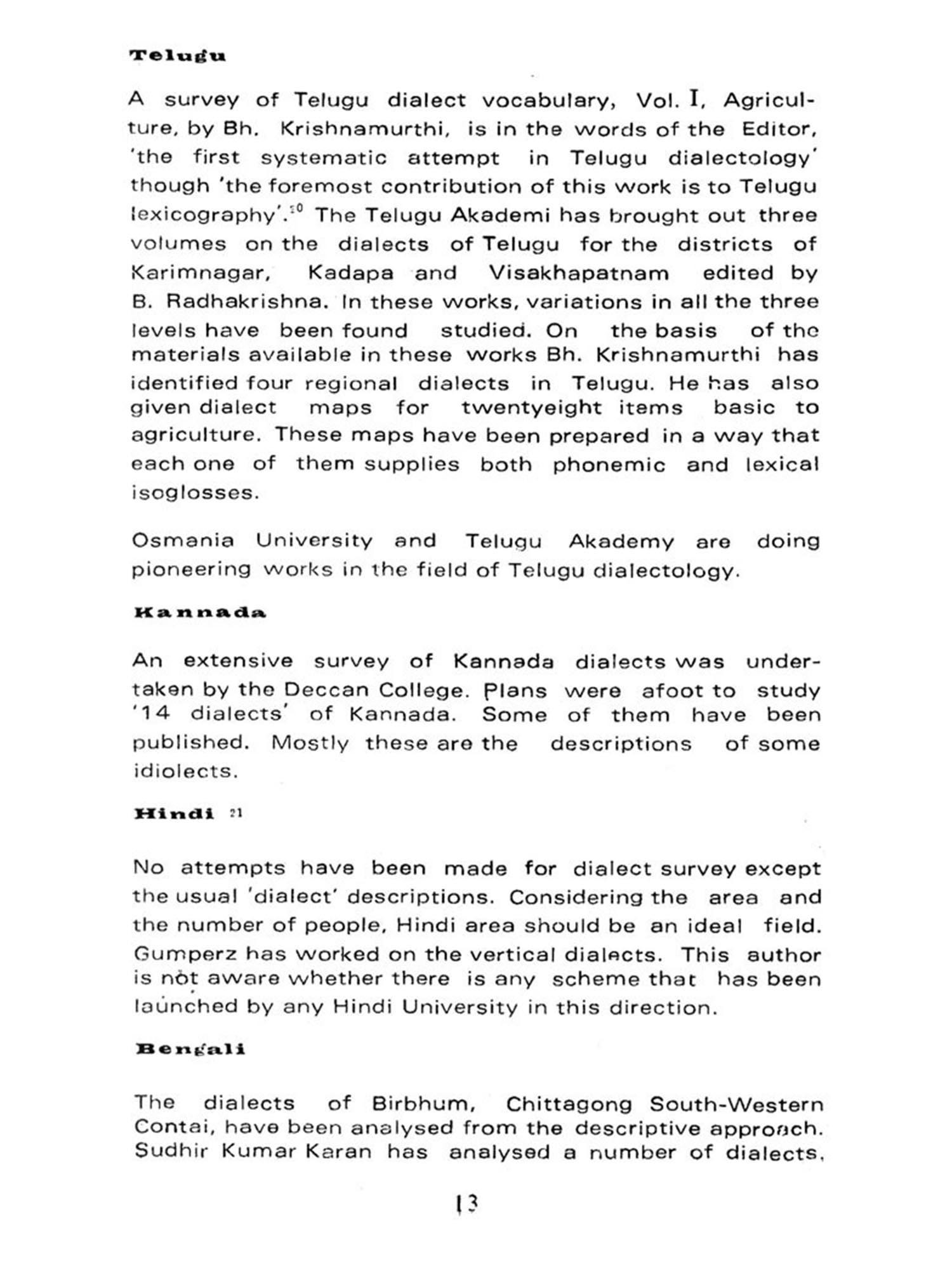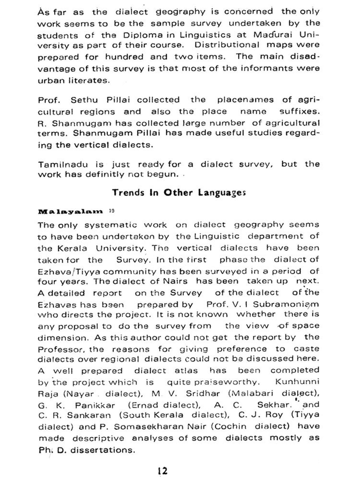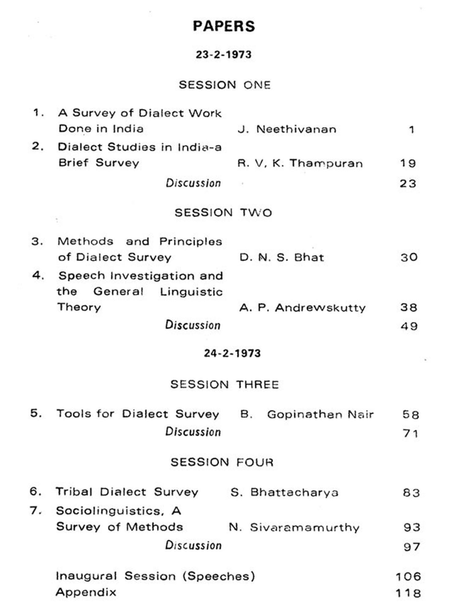 The observations and suggestions noted in this book are relevant even today. It is interesting to note that a couple of scholars who attended the seminar are very much active in the furtherance of Dialectological studies either as researchers or as free-lance investigators. Every language, if it is spoken in a vast area certainly will have several dialects. They can be classified and studied in several levels such as regional, caste related or professional. Dialectology though an advanced discipline in Linguistics, in India the dialect studies does not seem to have made commendable progress except a few surveys and studies conducted by the Linguistic Departments such as that of the University of Kerala. Due to globalization and advancement in intercommunication facilities regional and caste dialects are gradually fading out. So every effort should be taken to preserve dialectical variations of languages for the use of coming generations.