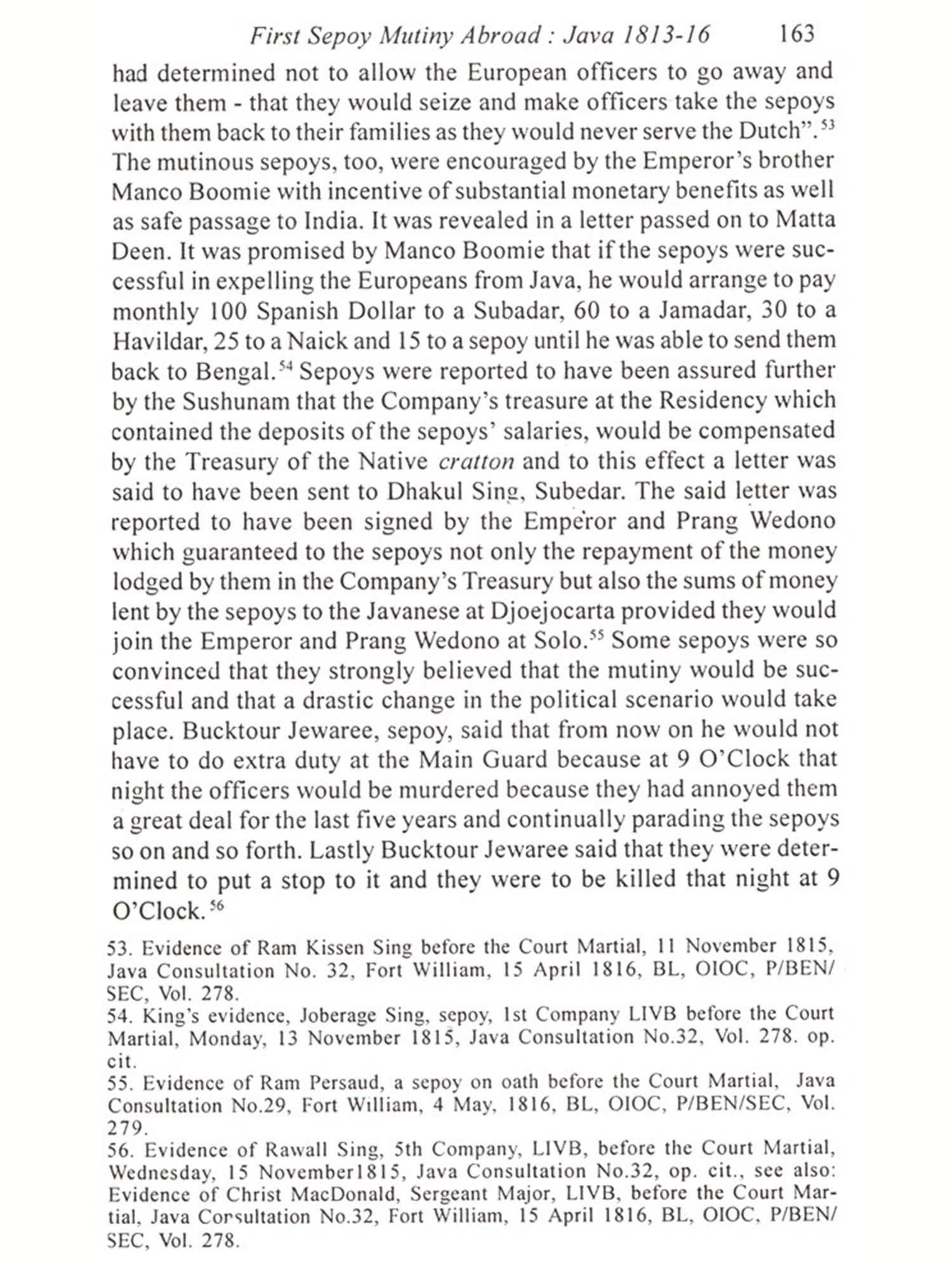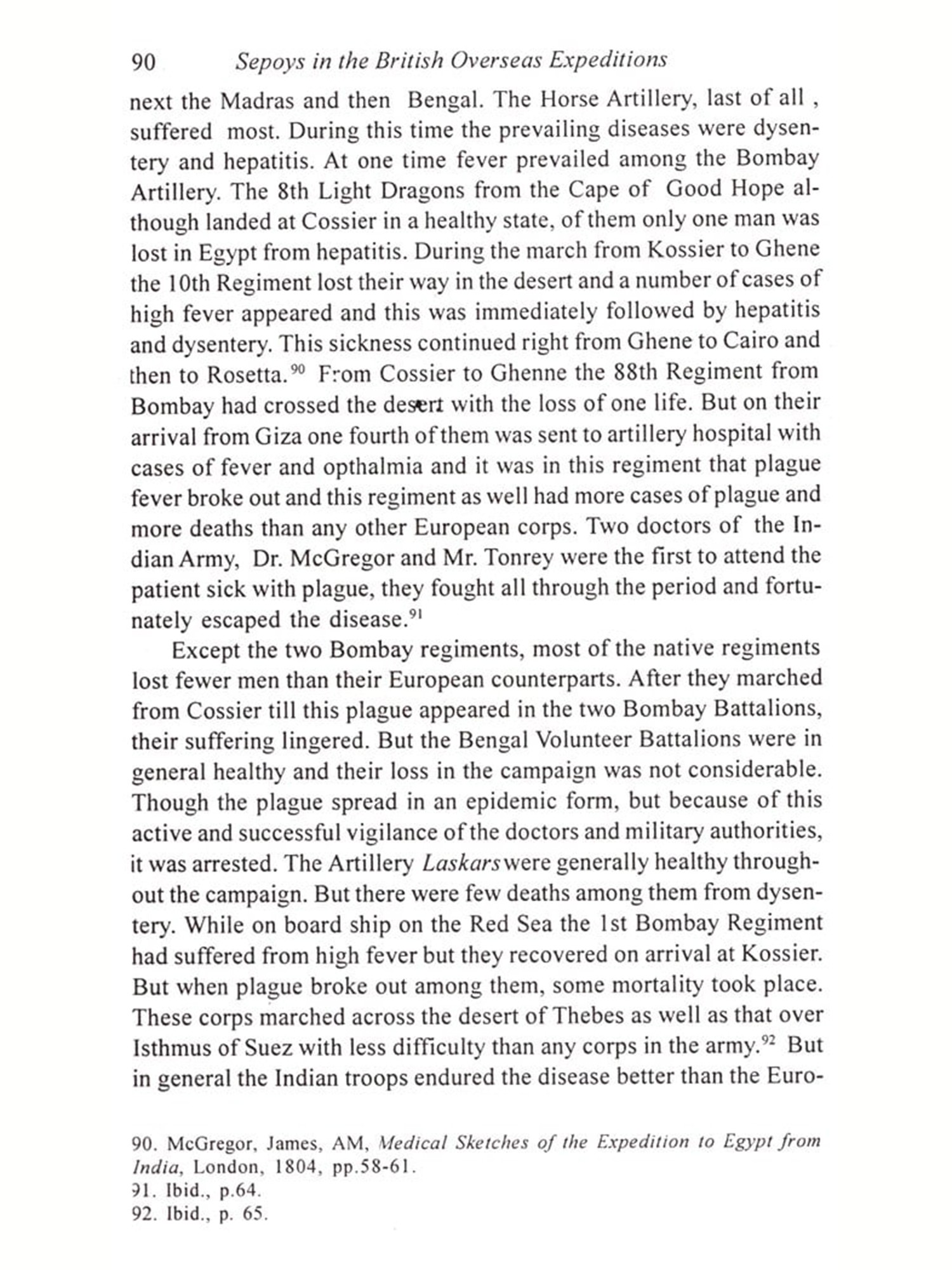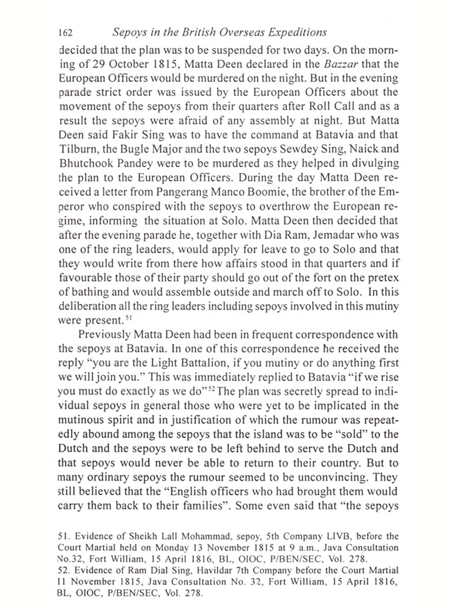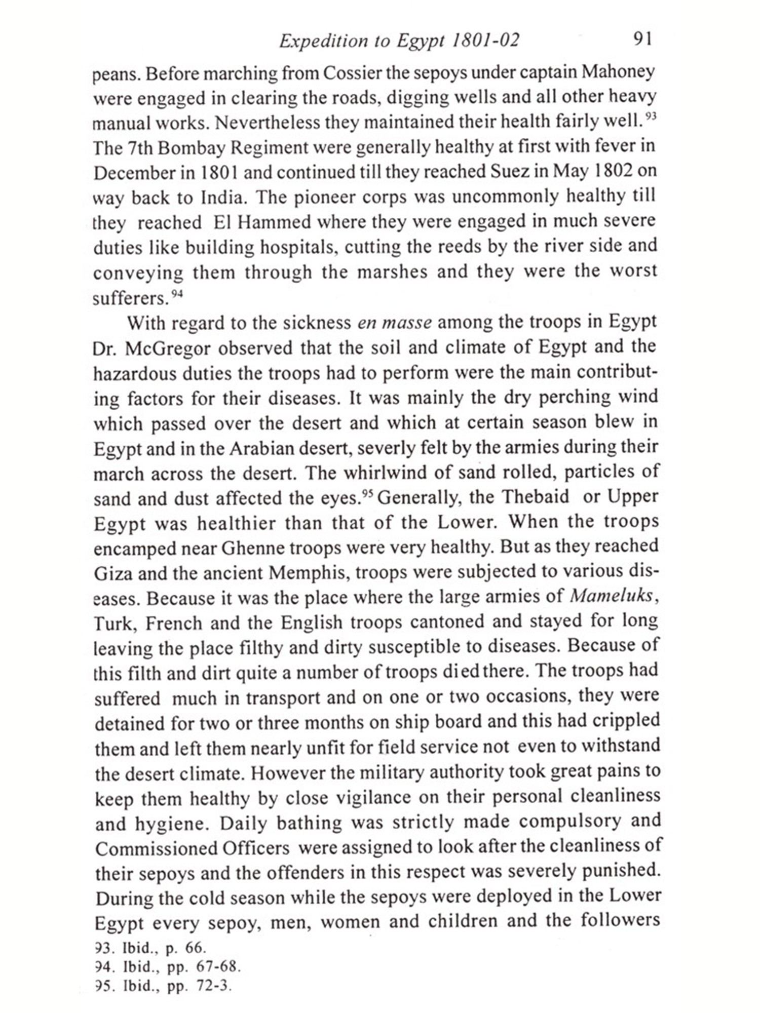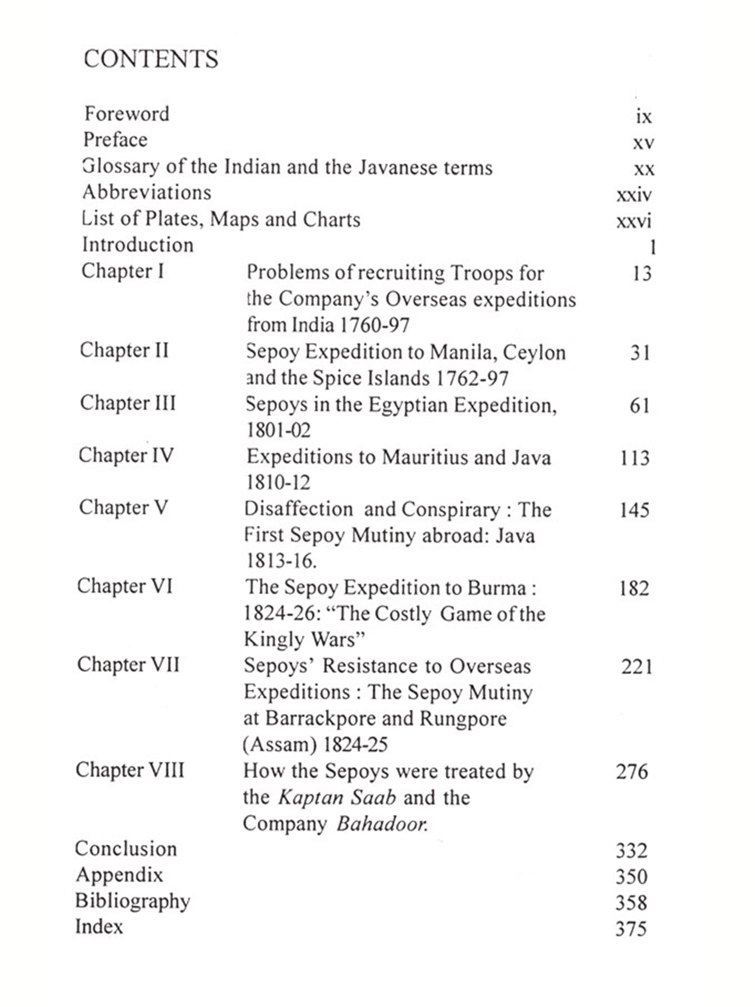 Perhaps we can identify four major components in the narrative which unfolds in these pages. First, the story of imperial expansion, Manila (1762-66), Sri Lanka or Ceylon and the Spice Islands (1781-97), Egypt (1801-02), Mauritius and Java (1810-11), Burma (1821-26). Second, a thread running through the entire narrative is the depiction of the human condition, the life of the Indian soldiers in barracks and battlefields. Third, there is the story of the sepoy's resistance on certain occasions to the exploitation they were subjected to - a story that restores our faith in the human spirit, fighting back despite of the odds against resistance. Fourth, there is also the chronicle of the system of deception which put the financial burden of England's imperial wars on the Indian tax payers, leading to argumentation of the 'drain of wealth from India.