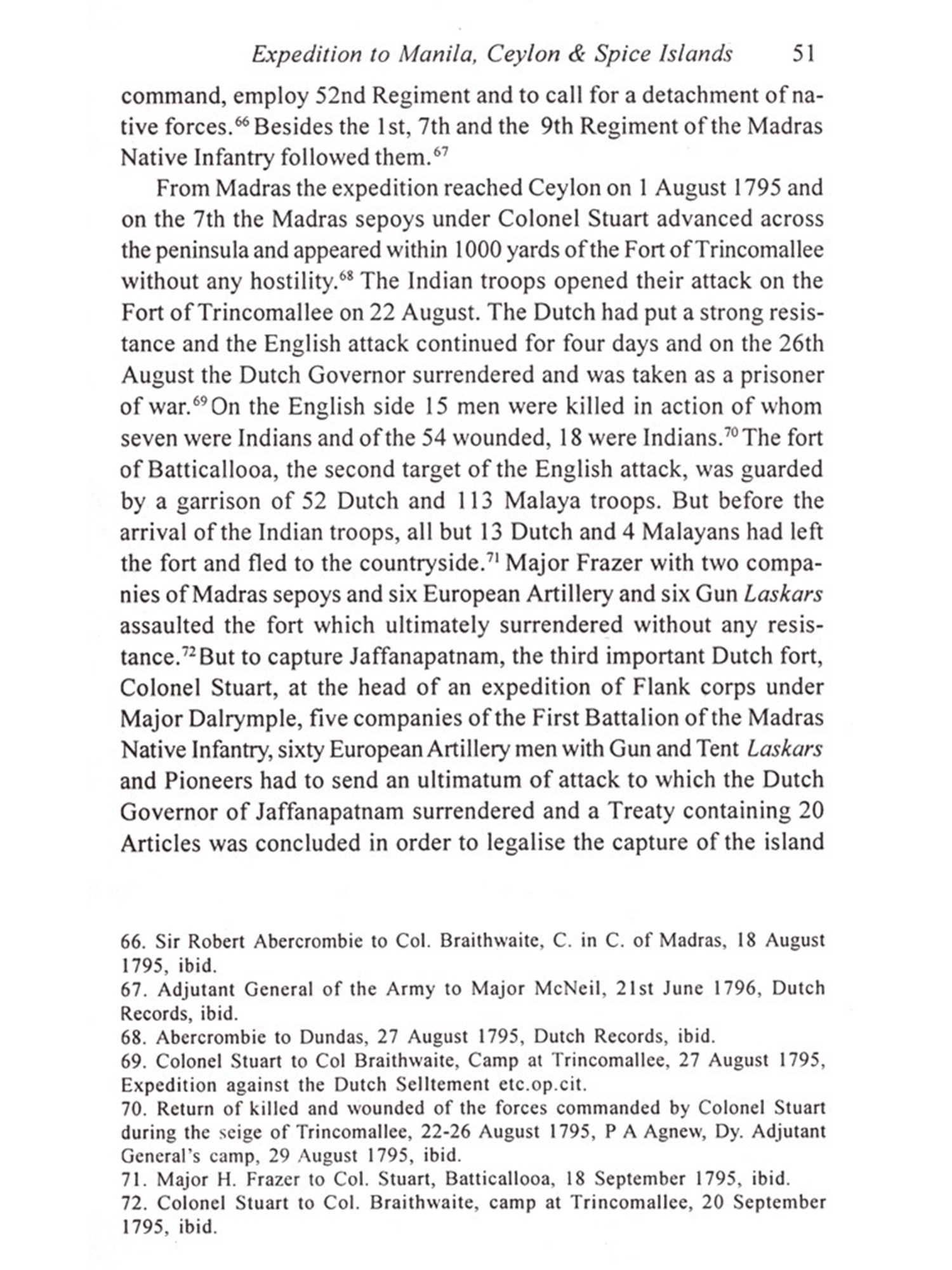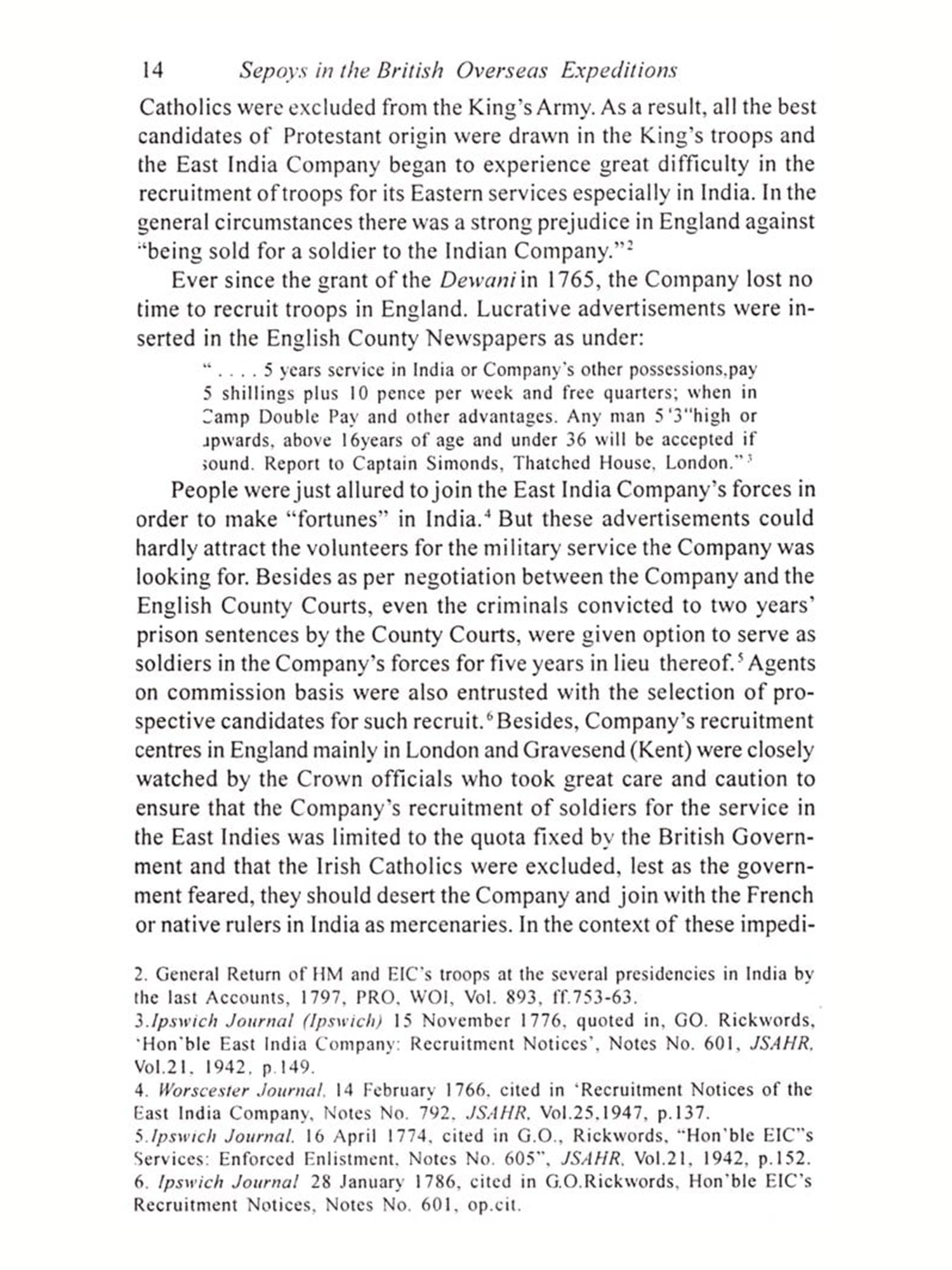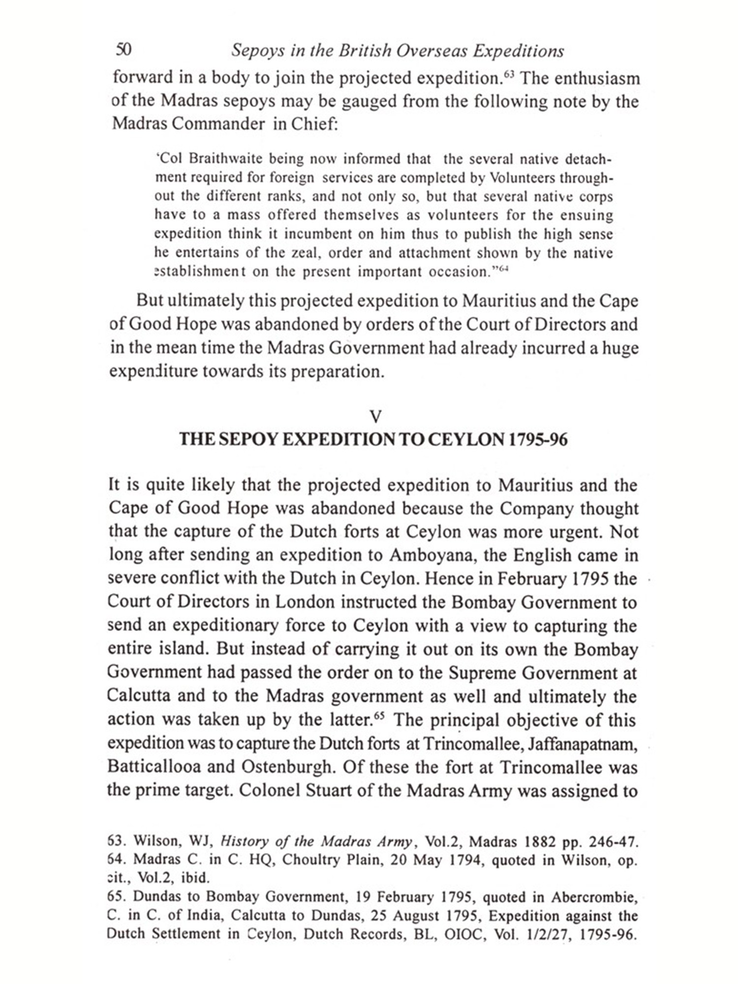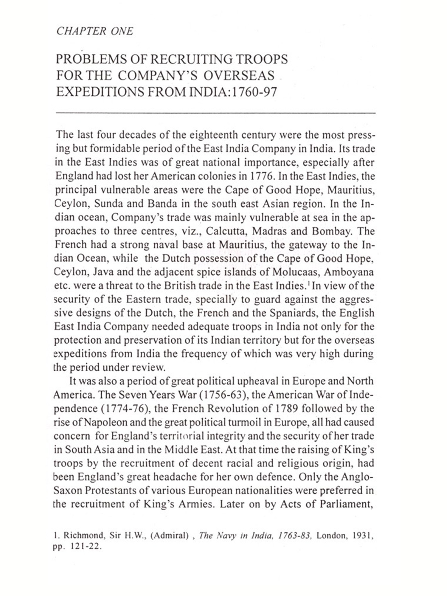 In fact the sepoy expeditions from Calcutta, Bombay and Madras to Company's various overseas settlements against the French, the Dutch and the Spaniards date back to 1762 when for the first time the Madrassi sepoys were despatched to Manila against the Spaniards which was a part of the Seven Years War in Europe (1756-63) and since then throughout the second half of the 18th and the whole of the 19th centuries sepoys were continued to be despatched to over-seas at the call of the War Office in England and at the cost of the Company's Government in India. All the time the War Office in England kept on promising to defray the cost to the Government of India but never fully or partly complied with. But towards the end of the 19th century politically the issue died down and no academic interest has yet been taken to undertake any empirical research work on this subject. Hence from the beginning my attraction has been first to explore the human aspect of the fate of sepoys who had participated during the period of a century and a half, their pay, pension, prize money batta, ration, their grievances, disease and mortality and the general and special, if any, treatment they received in the discharge of their imperial duties overseas.