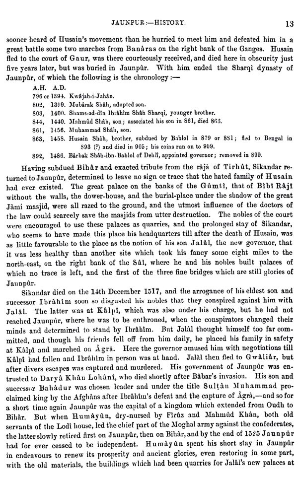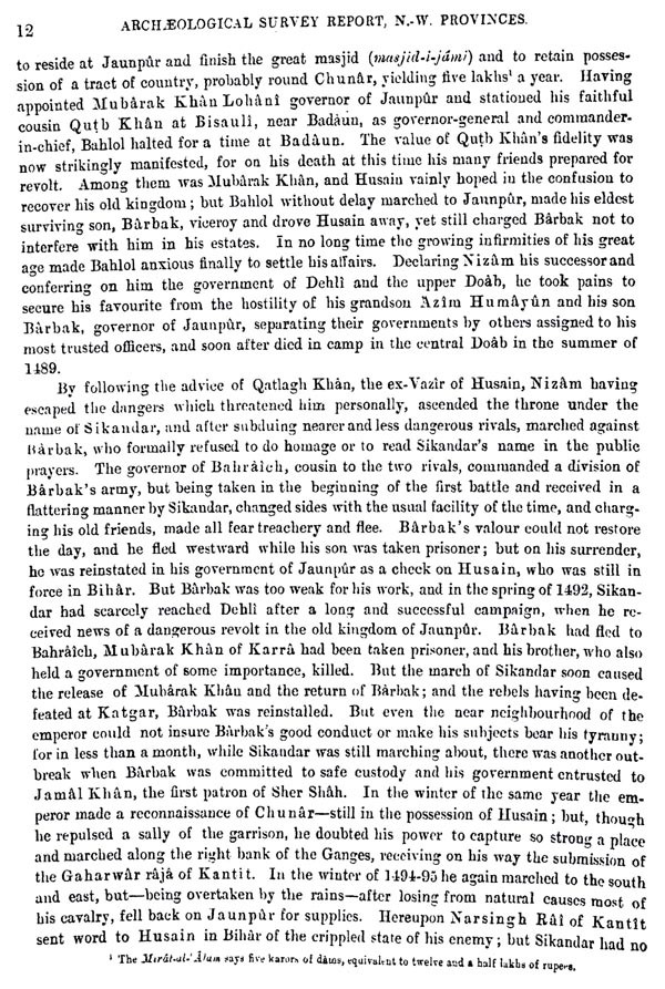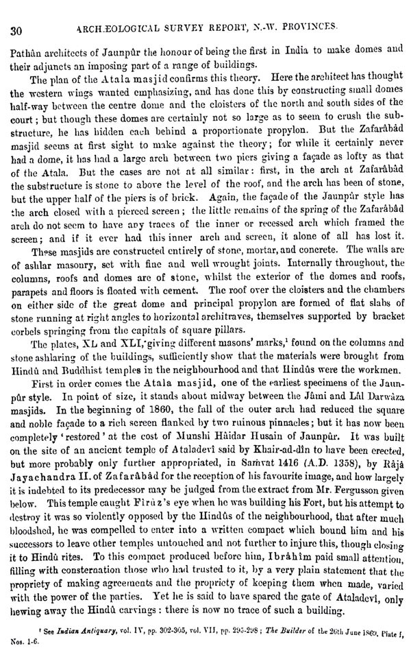 volume is the first of the new series of Reports, begun after the re-Archeological directing these surveys, my aim has been to have the Report volumes, as far as practicable, exhaustive and final on the subjects treated of in each. Much of course will be discovered everywhere in the future; but the monumental archæology can be fully dealt with, and a report-consisting chiefly of cursory notes on places visited on a flying tour, with rough drawings and photo-graphs of the more notable buildings and sculptures met with, and specula-tions on matters on which the surveyor does not possess the materials for anything better than a mere hypothesis more curious than scientific-is not what ought to be considered satisfactory. Government has wisely forbidden the indulgence of the propensity to start such profitless speculations by the surveyors in their reports; and this volume will be found to be a plain state-ment of historical facts based on original sources of information relating to the places and buildings described, with careful and accurate representations of the monuments and their details sufficient to illustrate them-if not in every detail, yet quite as fully as is needed to give a complete idea of their archi-tecture. As Provincial Archæological Surveys had been conducted, at consider-able expense, both in the Panjab and North-Western Provinces, by officers of the Public Works Department, for several years previous to 1885, and as it had been devoted chiefly to the great monuments in Ağrâ, Jaunpûr, Dehli, Lahor, &c., I had hoped to be able to utilize and publish much of the material thus collected, and so make it accessible to the general public. On obtaining from Government a loan of these drawings, however, it was disappointing to find that, though numerous, technically well finished, and to large scales, the details-on which so much of the real character and style of architectural art is dependent-had not been measured and drawn with necessary care. Many of the smaller measurements were largely in error, and the proportions of ornamental work, mouldings, &c., overlooked. To have published such drawings would have been to produce untruthful in-pressions on the minds of such as should study them. Instead of the work at Jaunpur, therefore, being only to supply such additional details as had been overlooked in this extensive series of drawings, and write the desirable letter-press to accompany them, it was soon found that the whole must be re-measured and re-drawn, if the representations were to be accurate in all detalls, Mr. Ed. W. Smith, the Architectural Assistant, only joined the stafr in February 1886, and without any qualified draftsman to asist him. In the short period available till the hot season set in, he completed the work on the Atala and Lil Darwaza Masjids Next cold weather he was engaged in Bundelkhand and elsewhere, and only returned to Jaunpür in October 1887, when, with the native draftamen he had been training, he made the drawings now published of the Jami Masjid. This Report had been prepared in October 1886 and went to the press in 1887, but the earlier plates had not been nearly all printed off when the later ones were received to complete the work. The bulk of the letter-press is by Dr. Führer, whose trained and varied scholarship is a sufficient guarantee for its accuracy and research. The architectural descriptions of the buildings were prepared by Mr. Smith. My work has been to unite these into one connected account, to supervise the printing, and pass the drawings through the press. To the MS. of his report Dr. Führer added a bulky appendix of forty-six inscriptions collected during his tour between 14th February and 31st March 1886. These were in Arabic, Persian and Sanskrit, many of which were unknown before. Some of these inscriptions, Dr. Führer mentions, 'are of great historical importance, espe-cially in settling the question of the time of the first appropriation of the ancient Buddhist and Hindû temples by the Musalmans. The Arabic and Persian inscriptions, being mostly short, and belonging directly to the buildings described, have been engrossed in the text: the longer Sanskrit ones, as directed by Government, have been kept for separate publication in the Epigraphia Indica. Besides the monograph on the Sharqi architecture of Jaunpûr, the report contains notes on the archeological remains at Zafarâbâd, Bhulla-Tâl, Ayodhya, and Sahet-Mahet, which places Dr. Führer visited in the course of his tour The plates have been reproduced by photo-lithographic processes at the Survey of India Office in Calcutta, but on account of other and more pressing demands, to which these plates had often to give way, the work has been much protracted. Nothing, however, could exceed the ready attention and interest bestowed from first to last upon it by Colonel Waterhouse, to whose care much of their excellence is due, and for which my best thanks are owing They alone form a most important contribution to Indian monumental archæology, and will, apart from all description or comment, be found of much interest by the architect, the artist, and the historian of Indian archi-tecture.