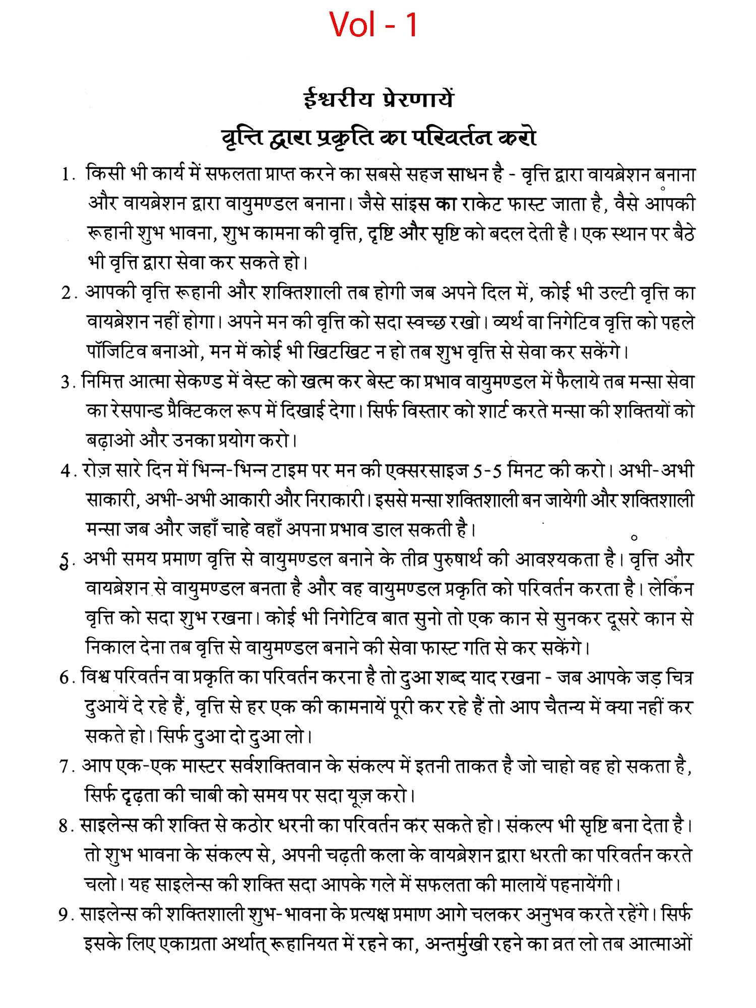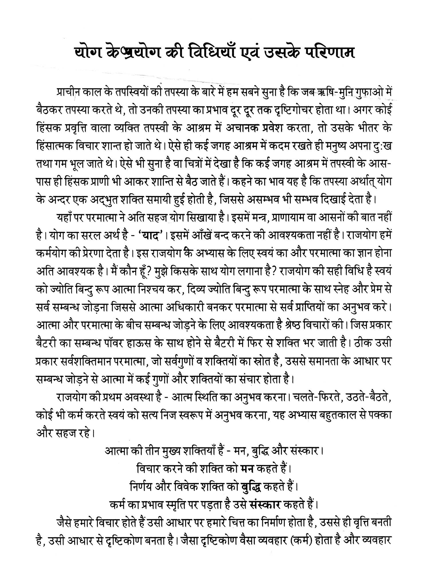 परमपिता परमात्मा, जो इस सृष्टि के आदि मध्य अन्त के ज्ञाता, ज्ञान के सागर, सुख शान्ति के दाता हैं. अपने बच्चों को पुनः राजयोग सिखलाकर उनकी मनोवृत्तियों में परिवर्तन ला रहे हैं। उनकी श्रेष्ठ मत है-"बच्चे अपने स्वरूप को पहचानो, स्वधर्म में स्थित होकर मुझ ज्ञान सूर्य पिता परमात्मा के साथ अपना बुद्धियोग जोड़ लो तो मेरी शक्तियां आपके संकल्पों को शक्ति सम्पन्न बना देंगी। फिर आपके शुद्ध श्रेष्ठ संकल्प हर सिद्धि को प्राप्त करेंगे। असम्भव भी सम्भव हो जायेगा। यह कोई चमत्कार नहीं लेकिन यह आध्यात्मिक कृषि विज्ञान है। इसमें परमात्म शक्ति और आत्म शक्ति के संकल्पों का श्रेष्ठतम प्रयोग है, जो शुद्ध श्रेष्ठ शक्तिशाली भावनाओं के प्रकम्पन द्वारा सम्पन्न हो सकता है।"