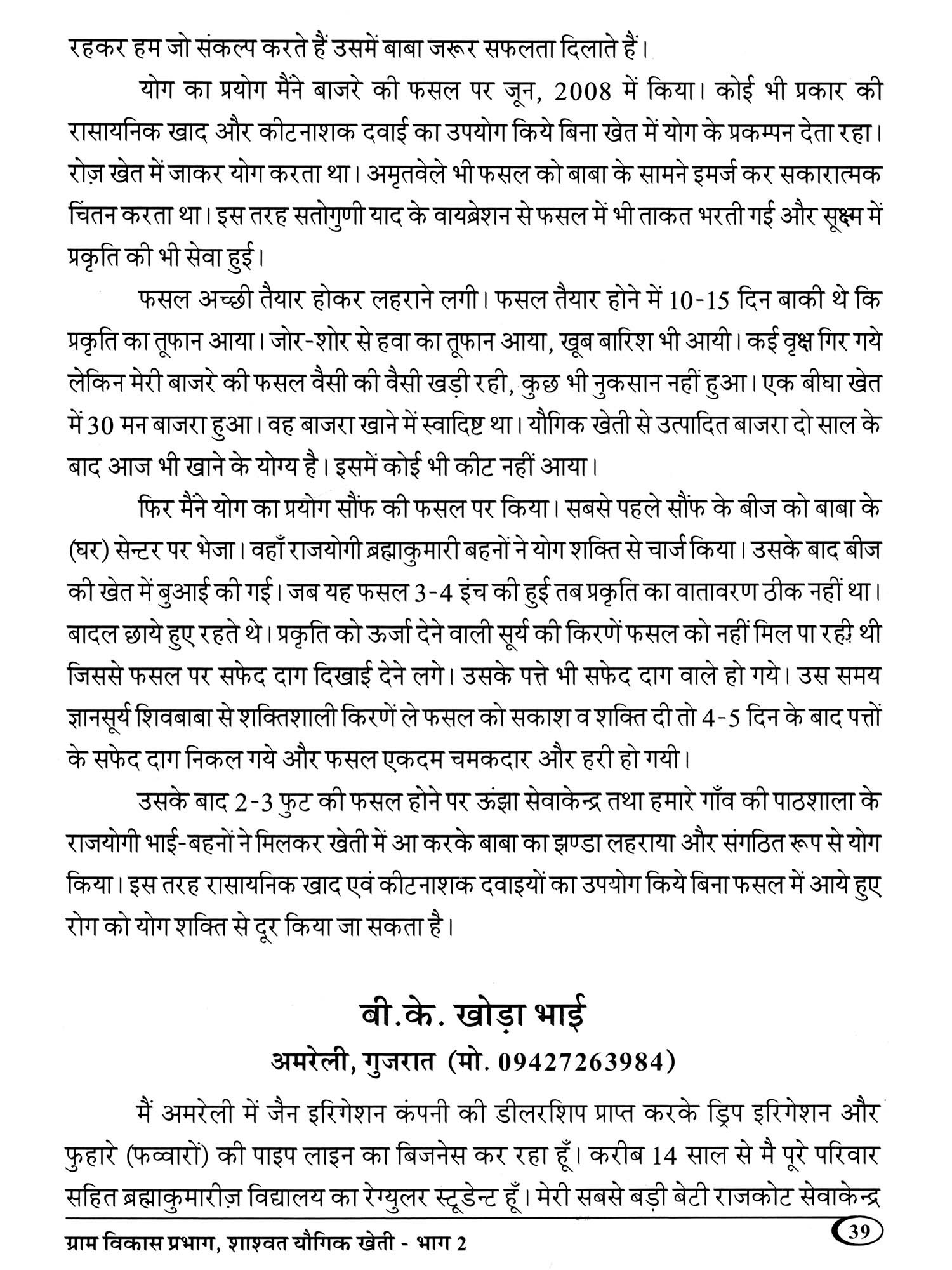 अतः अब समय आ गया है अपने अन्नदाता किसानों को जागृत करने का। वे अपने श्रेष्ठ स्वमान और शक्ति को पहचानें। शुभ भावना है कि सर्वप्रथम किसान वर्ग राजयोग की विधि सीखकर अपनी खेती के कुछ भाग में उसका प्रयोग करके सफलता सम्पन्न अनुभवी बनें। उसमें किसी भी प्रकार की रासायनिक खाद वा कीटनाशक जहरीली दवाओं का प्रयोग किये बिना घर में तैयार की हुई जैविक खाद द्वारा खेती को सशक्त बनायें फिर उसमे योग की सकाश का, आत्मा के सातों गुणों का एकाग्रता और दृढ़ता के साथ प्रयोग करके अपने निजी उपयोग में आने वाले शुद्ध, सात्विक, अन्न, फल वा सब्जियां उपजायें। इसमें सफलता प्राप्त करने के पश्चात् अपने सम्बन्ध सम्पर्क में आने वाले किसान भाई बहिनों को भी प्रेरणा दें ताकि हर एक आध्यात्मिक शक्तियों को पहचाने और सम्पूर्ण विश्व एवं भारत देश पुनः धनधान्य सम्पन्न वन विश्व गुरु की पदवी प्राप्त करे तथा परमात्म कार्य की प्रत्यक्षता हो।