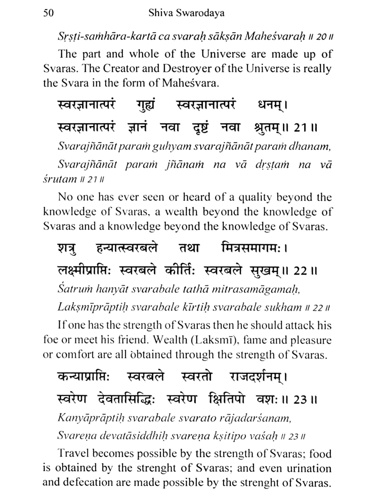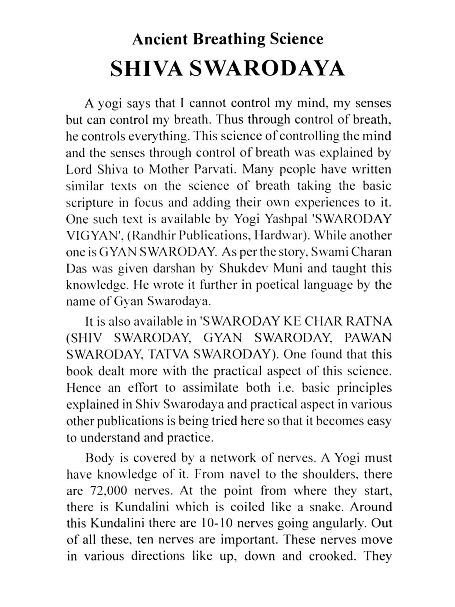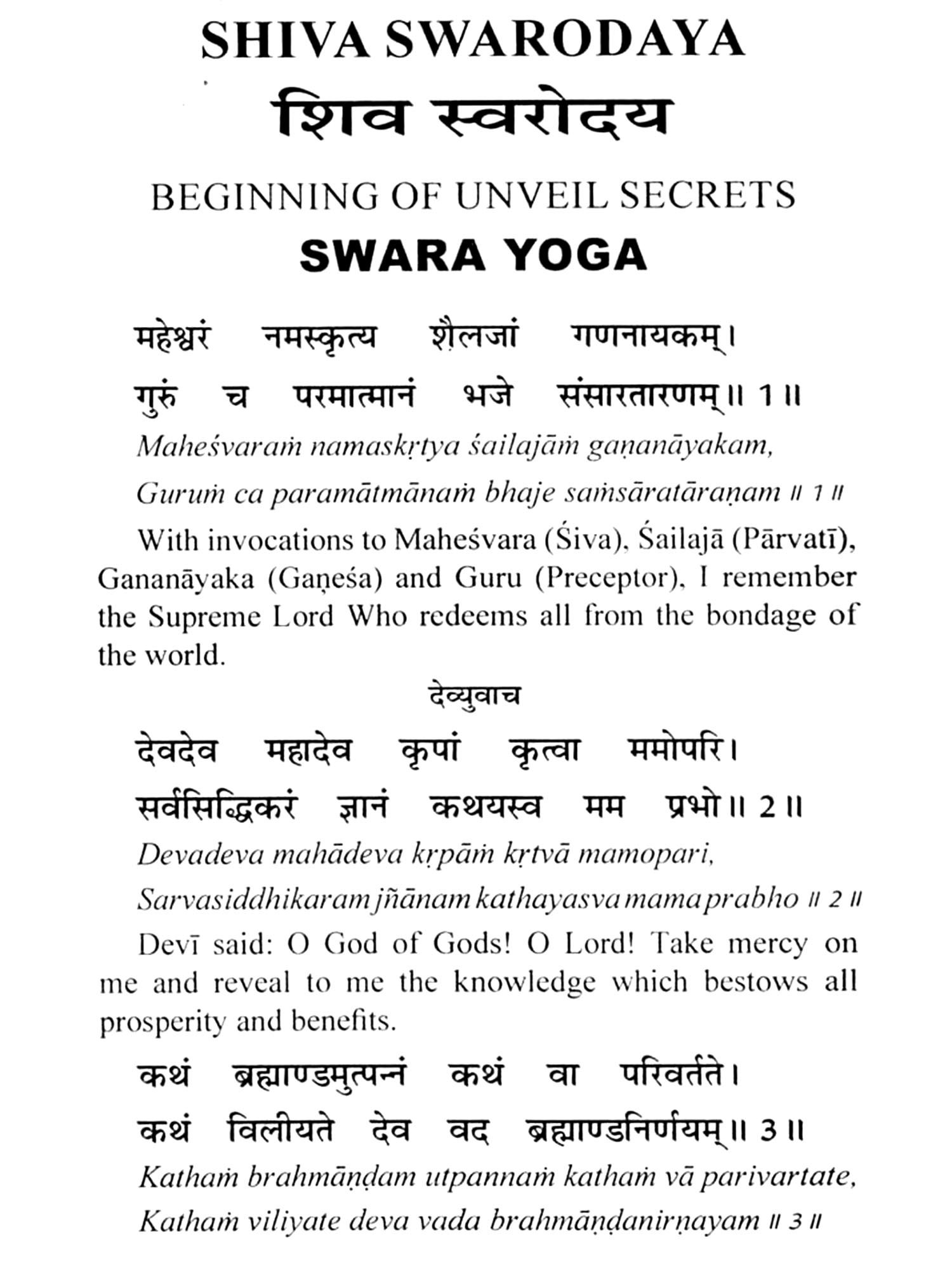 Shiva Swarodaya, herein presented with an English Translation together with Roman version of the Sanskrit text. This is the only one authentic extant which define the Science of predicting auspicious and inauspicious results based on the flow of breathing through one or the other nostril. Lord Shiva revealed this secred to his divine consort Parvati with specific instructions to keep it a closely guarded, revealed only to those who deserved.