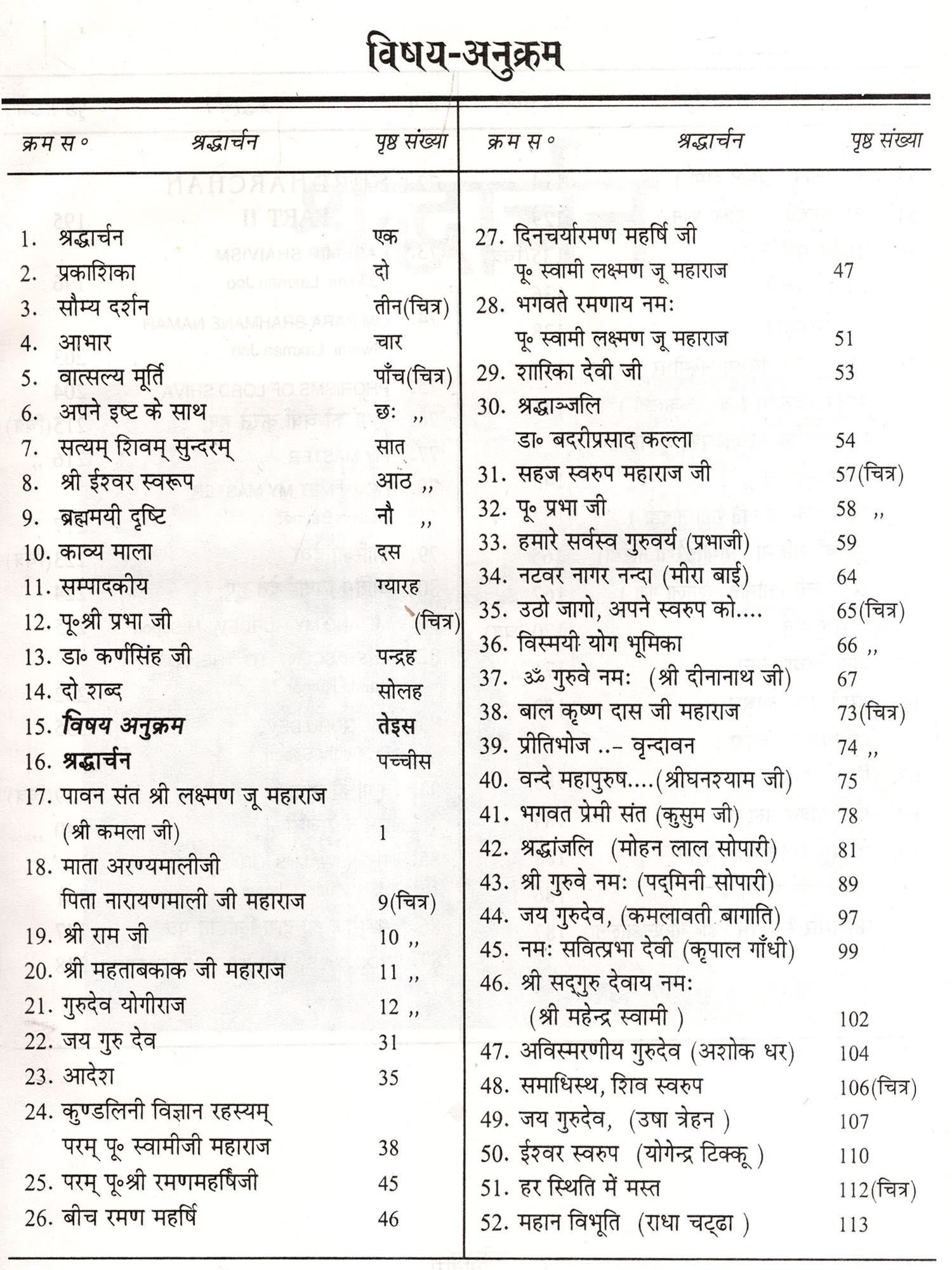 इसके अतिरिक्त श्री लाल जी चढ्ढ़ा ने इस ग्रन्थ में स्वामी जी महाराज के कई भावों से खचित चित्रों को देकर बहुत ही प्रशंसनीय काम किया है। इतना ही नहीं स्वामी जी महाराज की प्रधान शिष्या सुश्री शारिका देवी जी जिनका स्वर्गारोहण अपने गुरुदेव से पूर्व छः मास, फाल्गुन कृष्णपक्ष तृतीया को हुआ था, उनके मनोमोहक चित्रों को भी इस ग्रन्थ में स्थान दिया है। देवी जी, बाल-ब्रह्मचारिणी, तपस्वी गुरु-सेवा में रत, त्याग और सहन शक्ति की प्रत्यक्ष साकार मूर्ति थी। कश्मीर की प्रायः सभी जनता उनका दर्शन करके अपने आपको कृत-कृत्य समझती थी। वृन्दावनवासी महाराज जी के शिष्य भी उनका हृदय से आदर करते थे। उनके विषय में भी कई महानुभावकों ने उनके जीवन में घटित घटनाओं का उल्लेख इस ग्रन्थ में किया है। उन सज्जनों के प्रति हम हृदय से आभार प्रकट कर रहे है।