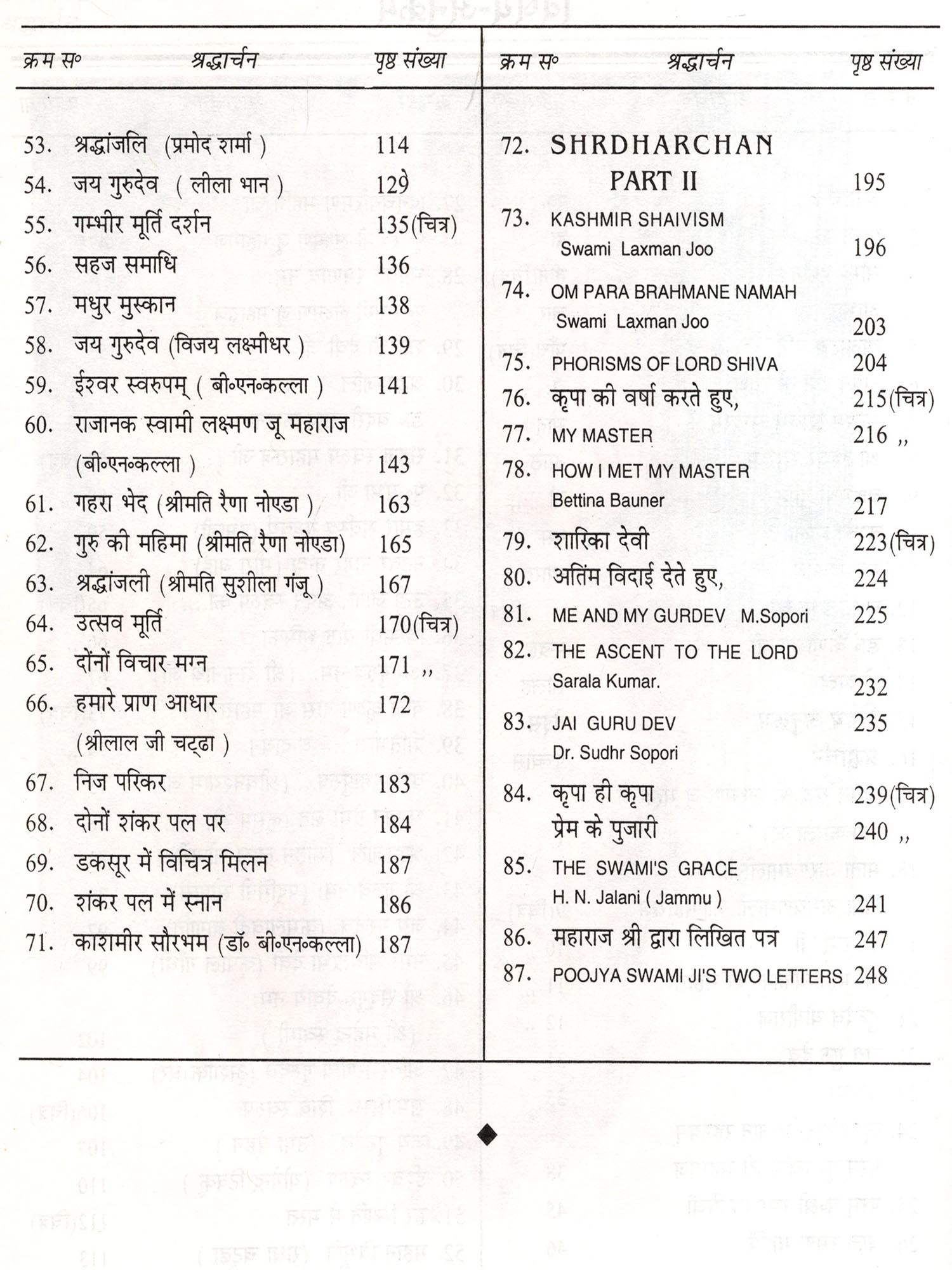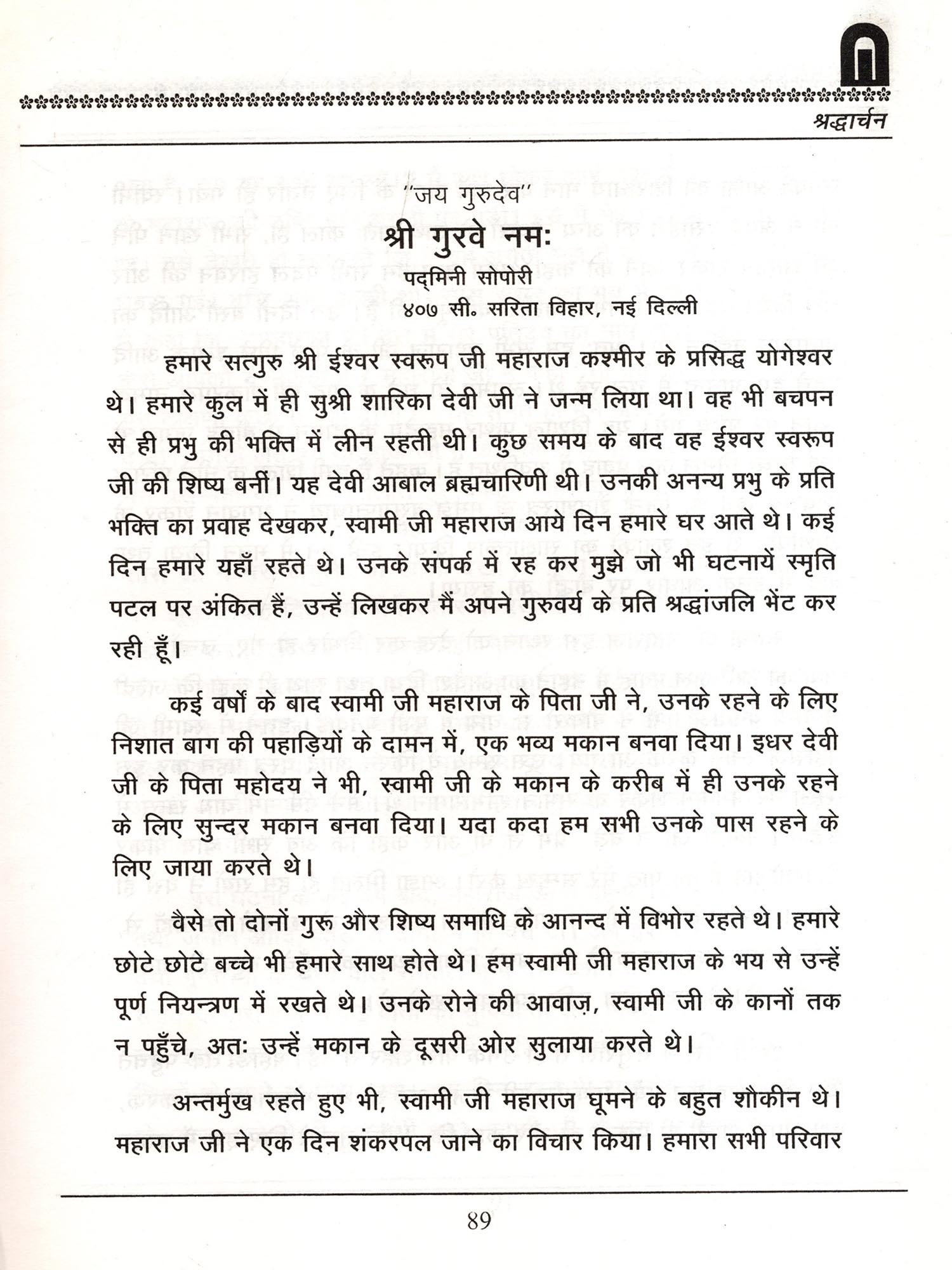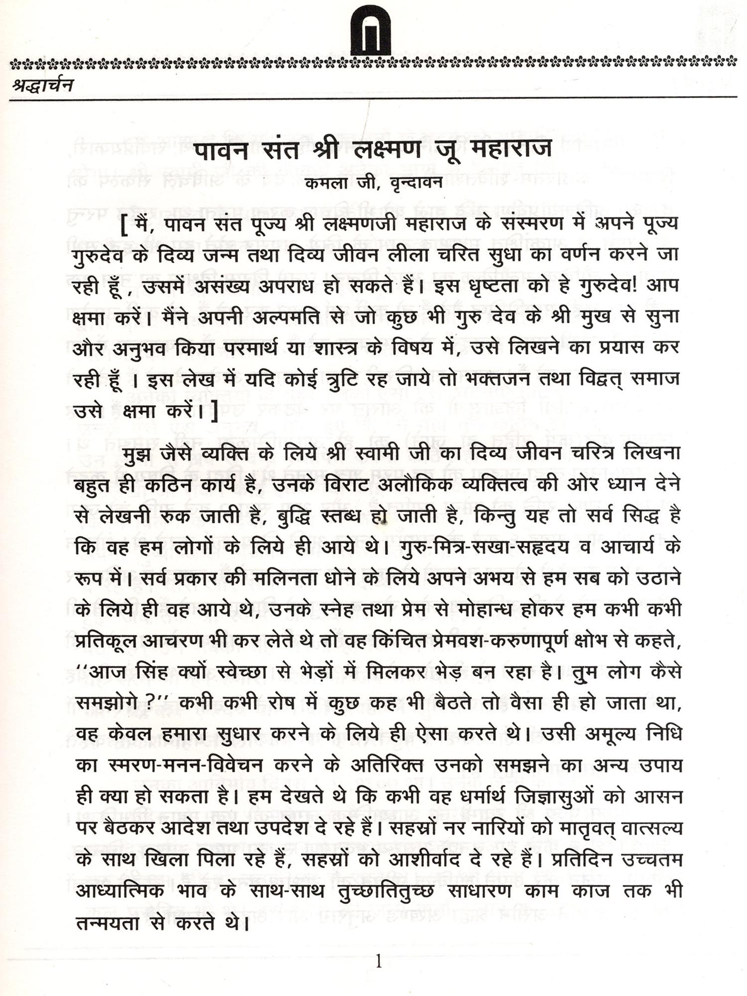 कृष्ण-भक्ति-रस का रसास्वादन करने में आजीवन तत्पर बने हुए सन्त महामना पूज्य बालकृष्ण जी महाराज से कौन वृन्दावनवासी परिचित न होगा। ई० सन् १९९६ में उनके गोलोक में जाने पर उनकी पुण्य-स्मृति में उनके भक्त लोगों ने 'रसार्चन' नामक पुस्तक की रचना की। इस पुस्तक को देखकर मन अति प्रभावित हुआ। हमारी आदरणीय गुरु बहिन सुश्री कमला जी बावा का मन इस पुस्तक को देखकर अति हर्षित हुआ। फल यह हुआ उनके मन में अपने गुरुदेव श्री ईश्वर-स्वरूप जी महाराज, स्वामी लक्ष्मण जी के प्रति भी इसी प्रकार का ग्रन्थ प्रकाशित करने का संस्कार अंकुरित हुआ। उन्होंने अपने मन का शुभ-संकल्प अपने आराध्यदेव परलोकवासी गुरु महाराज के चरणों में समर्पित किया। गुरुदेव आशुतोष तो थे ही, उन्होंने इस संकल्प को फलित बनने की स्वतः सुविधा प्रदान की। श्री लाल जी चढ्ढ़ा जो श्रीईश्वर स्वरूप जी महाराज के परम स्नेह के पात्र है, कमला जी ने यह शुभ कार्य उनके हाथ में सौंपा। सौभाग्वश मै श्रीनगर से दिल्ली दिसम्बर के मास में आई। लाल जी ने मुझ तक यह शुभ बात पहुँचाई। गुरु-कृपा से मैंने अपनी ओर से तो सभी गुरु भाइयों और गुरु-बहनों से इस कार्य में योग-दान देने के लिए कहा, किंतु कइयों ने तो बात हंस के टाल दी, पर गुरु-शक्तिपात से आघ्रात कई भक्तों ने, अपने मानसिक उद्गार जो उनका गुरुवर्यों के प्रति था, उन का बड़े परिश्रम, भक्ति तथा अनन्य स्नेह में विभोर होकर हम तक लिखकर पहुँचाया। इस का मुख्य कारण यह भी था कि अपनी जन्म भूमि से मूलतः वियुक्त होकर गुरुदेव की शीतल छाया से भी वंचित हो जाने से इनका हृदय छलनी हो चुका था, इसी हेतु अपने हृदय की मरहम-पट्टी करने का सुअवसर देखकर इन महानुभावों ने जो कुछ भी अपने गुरुवर्य के प्रति लिखा, उसके लिए कमला जी व हम सब उनके आभारी हैं।