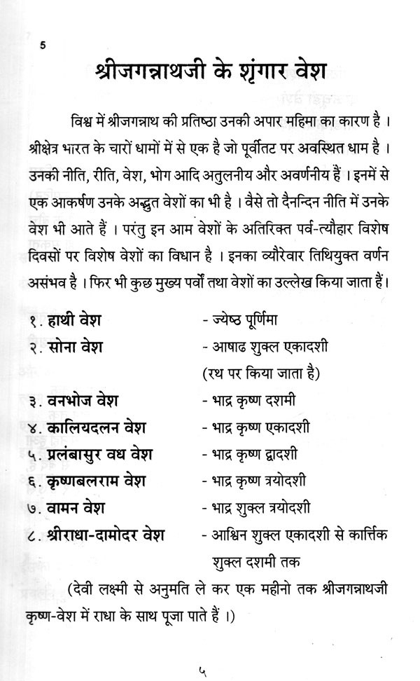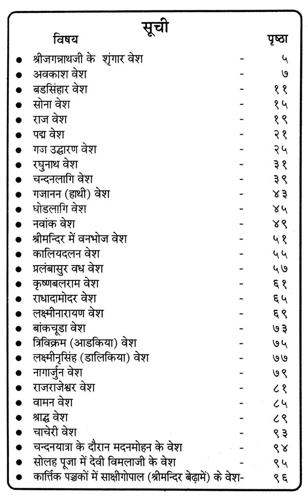 पुरुषोत्तम जगन्नाथजी आज भी अत्यन्त रहस्यमय बने हुये हैं। जितना जान पाते हैं उतना ही रहस्य बढता जाता है। आठ सदी हो गई नीति रीति, पर्व-त्योहार, उत्सव मनाये जाते रहे हैं। परंपरायें बनती गईं। कुछ लुप हुई । कुछ में परिवर्तन हुआ। ऐसा विराट संस्थान विश्व में दूसरा नहीं। बारहवीं से सतरहवीं सदी में यहाँ काफी कुछ नया जुडा, पुराने संशोधन हुआ है। आजका यह व्यवस्थामय रूप युगों के परिवर्त्तन परिवर्द्धनके बाद स्थिर हुआ है। इसमें राजा महाराजाओं की मनोकामना से ले कर सामान्य जन तक की अभिव्यक्ति हुई है। तभी ये सबके भगवान कहलाते हैं। इनके वेशों का दर्शन करने जनता खिंची चली आती है। प्रबंधकों के लिए यह चुनौती बन जाता है। जो हर अनियंत्रित दर्शक.... अगणित भक्त महिमा को उजागर करते हैं। परन्तु आदि अंत कहीं नहीं। अतः, अनेक परंपराओं का उत्स नहीं मिलता। अनुमानसे काम चलता है। श्रीजगन्नाथजी की भावधारा को समझना है तो यह वस्त्राभूषणवाला रूप समझना होगा । केवल बौद्धिक ज्ञान ही यह वेश चर्चा अंतर्मनको विभोर करनेवाली है। अतः, व्यापक पाठकों के लिए इसे ओडिया में ही नहीं हिंदी में भी प्रस्तुत करना आवश्यक लगा । अनेक जगन्नाथ संस्कृतिसे जुडे शब्दों को यों ही रखा गया है उस समय की शाब्दिक बानगी मिलेगी । भगवान का संबंध बुद्धि से ज्यादा मन से है। उनकी वेश चर्चा के बारेमें श्रीमन्दिर स्वत्वलिपि, गवेषकों, श्रद्धालु भक्तों और लोकमुख पर चल रही परंपरा में जो मिला, लिख दिया। कहीं त्रुटि लगे, हम विनम्रतापूर्वक स्वीकार करेंगे, संशोधन करेंगे। हमारा मौलिकता का कोई दावा नहीं है। परंतु यथासंभव वेशों को उनकी प्रचलित परंपरा में ही प्रस्तुत किया है।
