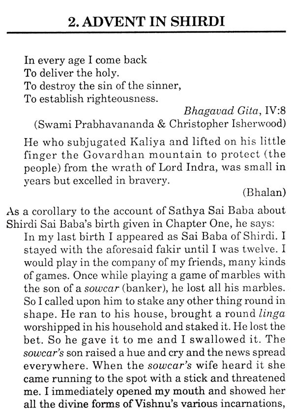 It is eighteen years since India attained independence. The warped slavish mentality of Indians now shows the proper improvement. Ignorance about Truth, lack of faith in God or saints, and scepticism about incredible (supernatural) powers of the Poorna Jnanis, all resulting from wrong or incomplete Western education, are reduced to some extent. Dr Connan, Monsieur Coho and the researchers of the National Laboratory of Psychical Research show that a divine Master or adept can exercise control over matter and living beings. This was recognised by our ancestors from time immemorial, but the belief was lost in the sands of time, and is now regaining ground. I wish to tell the readers that the living personification of this belief was Sai Baba who had attained union with the Brahman. Going one step beyond even the dicta propounded by scientists and by researchers, I have attempted to establish that the individual who attains this state never perishes. On the other hand, he manifests himself even now for those with firm faith and also for the world-weary, the seeker of knowledge, the seeker of something he treasures and the man of vision or spiritual discrimination, and helps them.