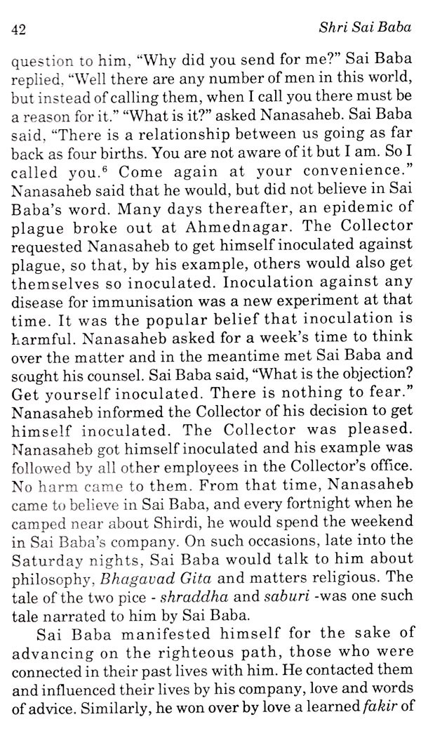 In June 1974, when I visited Shirdi for the second time, I was in search of a Mahatma who was closely associated with Sai Baba. There, I heard from K.S. Pathak, the then Court Receiver of Shirdi Sansthan, the name of Swami Sai Sharan Anand of Ahmedabad, a living link with Sai Baba. So, my wife and I went to Ahmedabad in November 1974, in pursuit of our objective. We called on Swamiji, then eighty-four plus, who received us warmly and with loving kindness. In our morning and afternoon sessions with him lasting for three days, he answered all our queries candidly and with utter frankness, and removed all our doubts and misconceptions. He also enlightened us about the true nature, mission and powers of Shri Sai Baba.