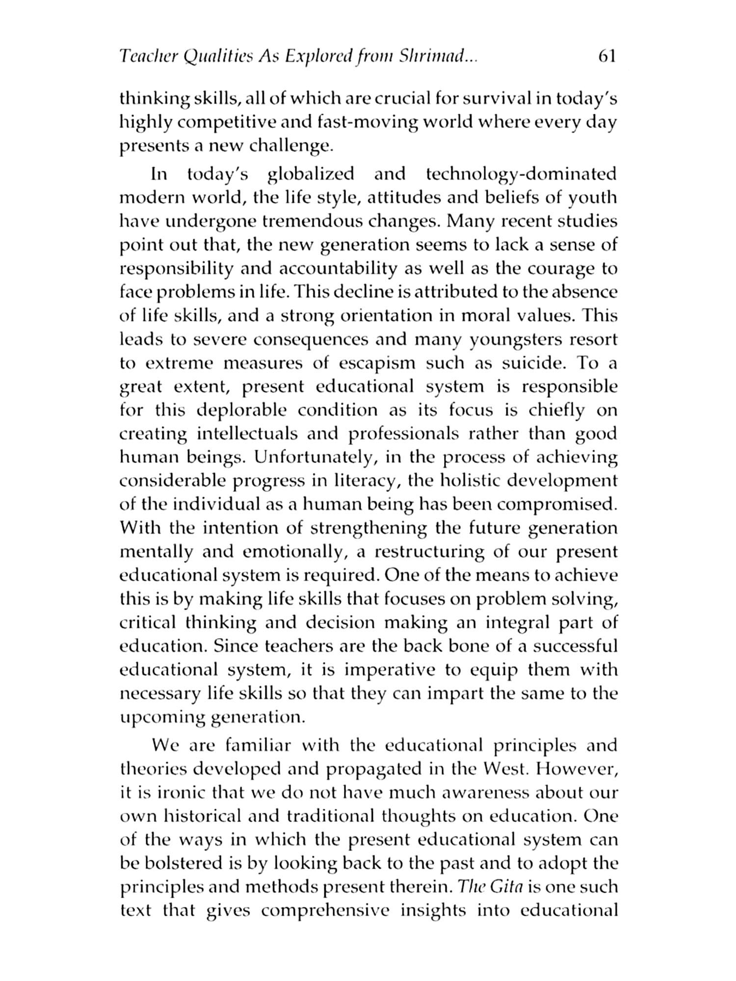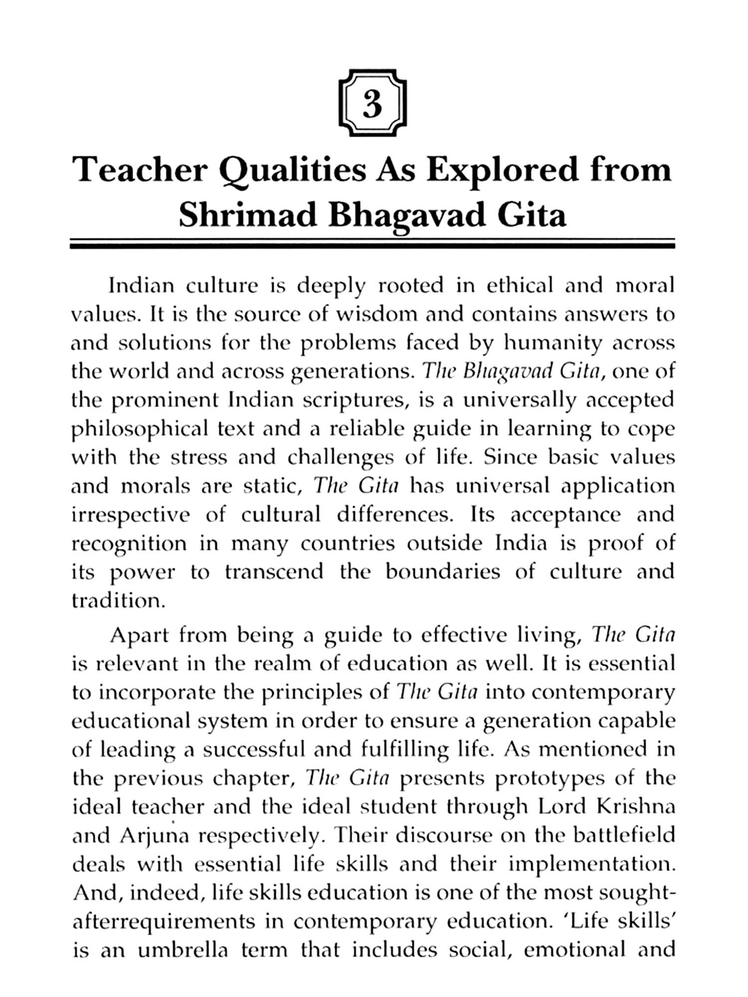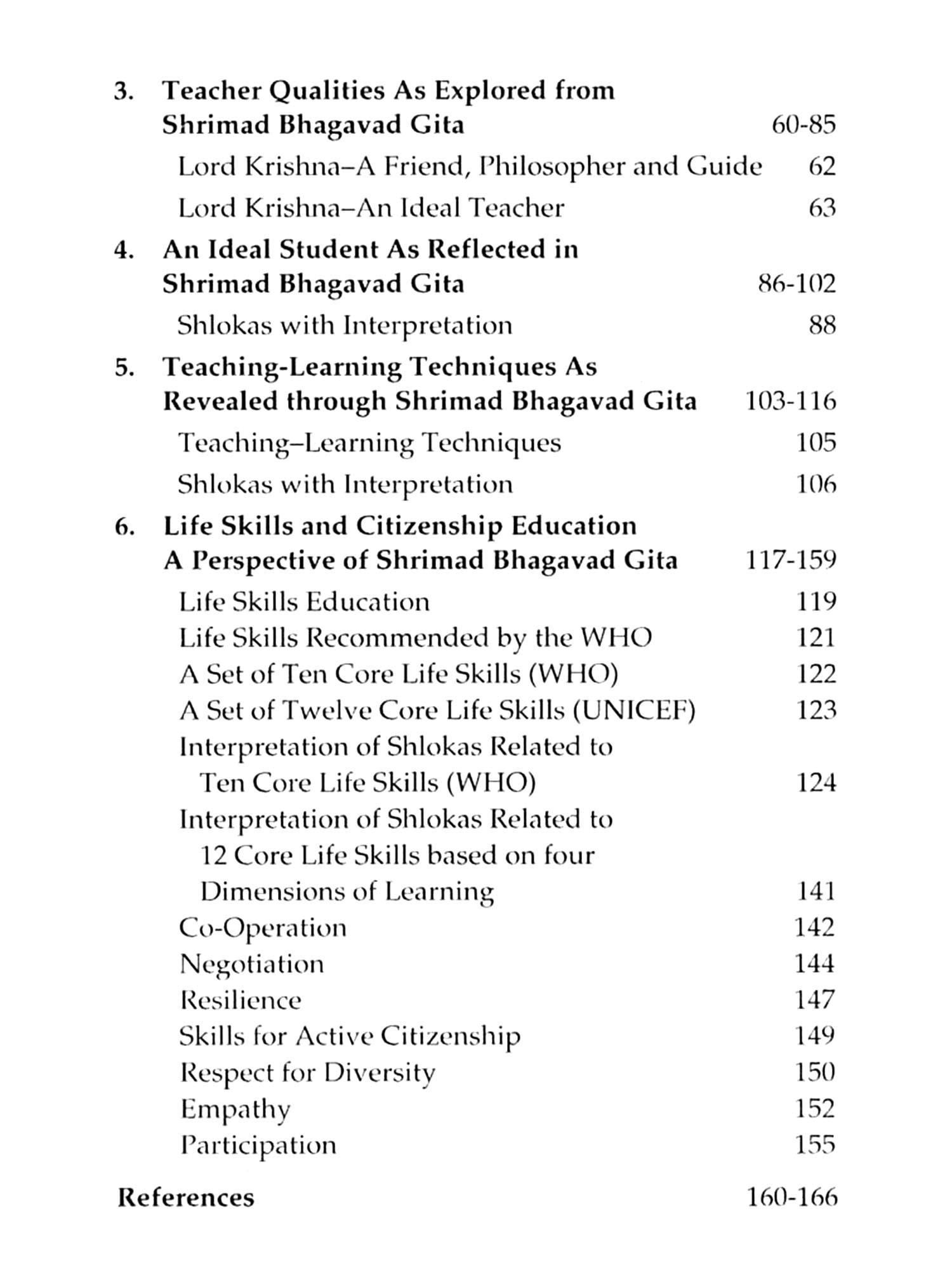 This book studies The Gita from the perspective of education, especially life skills education. It offers a selection of verses that clearly incorporate the various life skills along with their interpretation. It is intended to serve as a handbook or ready reckoner not only by educators but by laymen as well.