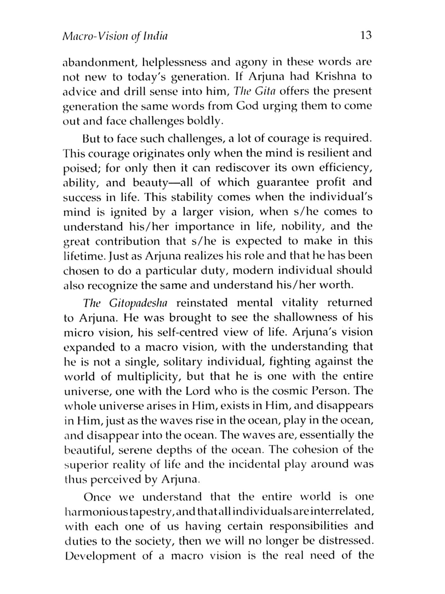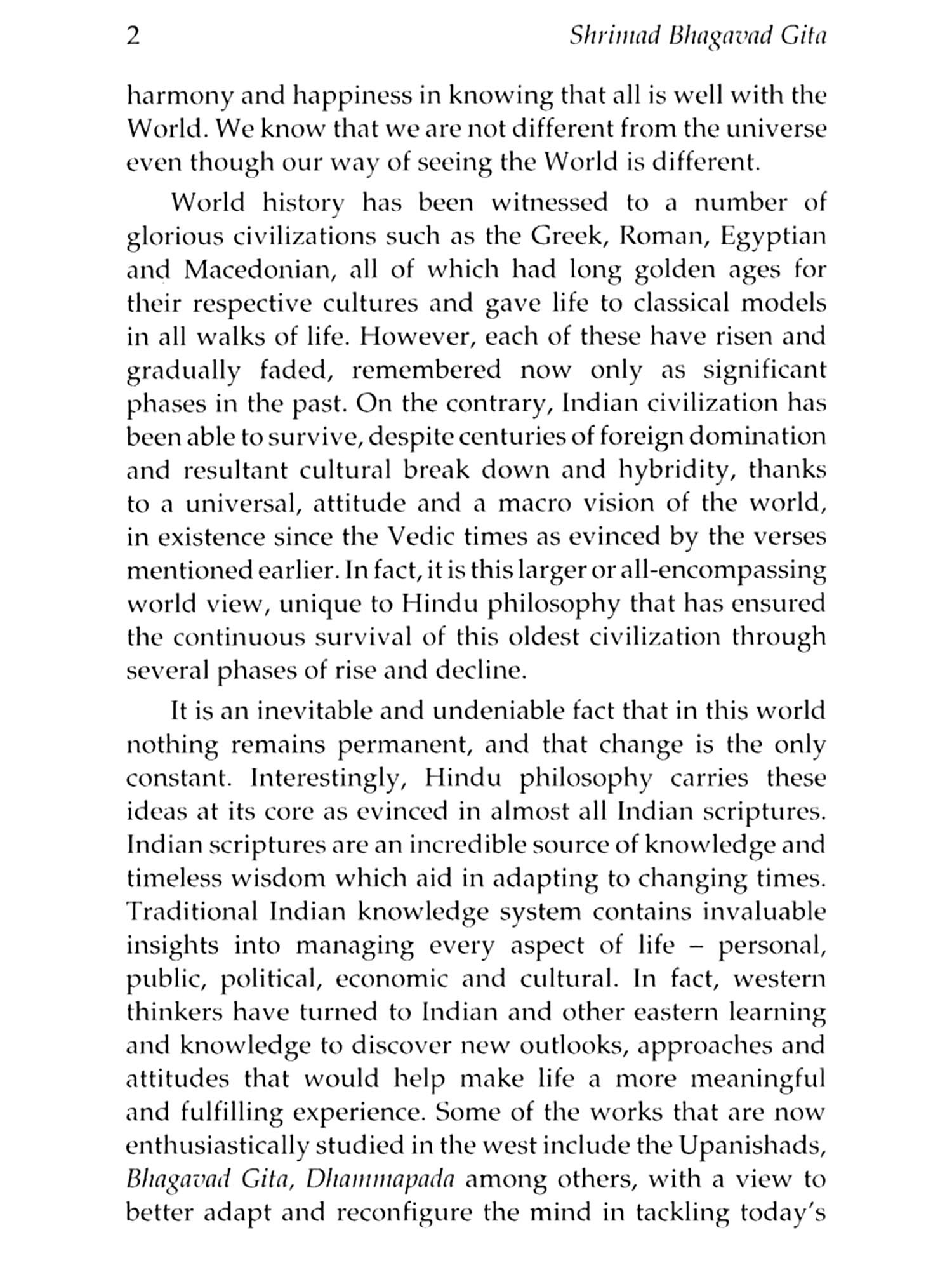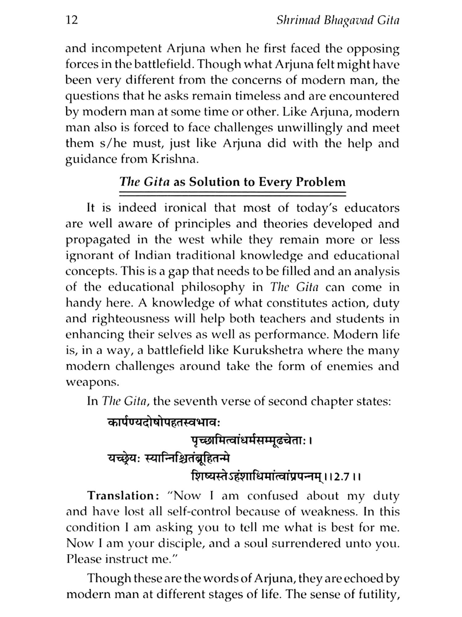 This work is also a sincere attempt to invite more attention on Indian traditions of life and education. There is no need to go in search of inspiration and motivation when there is plenty of it within our own tradition. The Gita offers solutions for any challenge, any crisis an individual may face, be it personal or professional, a fact that has been endorsed by many great philosophers across the world. It is hoped that this book would enable the readers to realise their true potential and to lead a happy and fulfilling life, understanding that setbacks or failures are only short lessons in dealing with life.