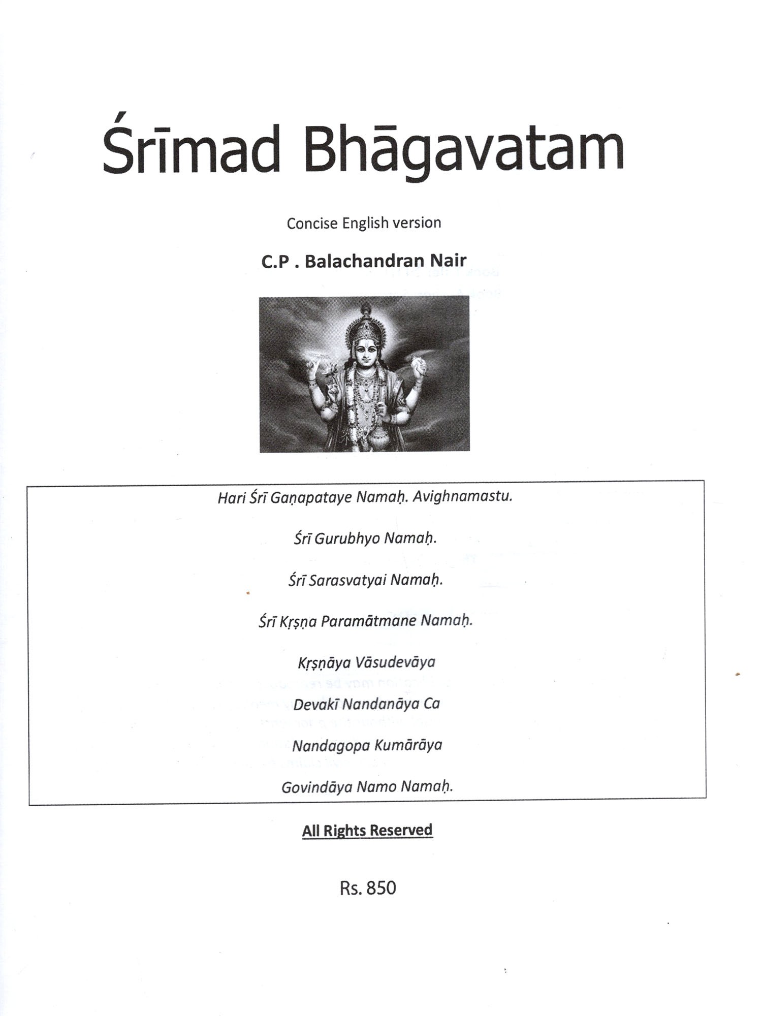 This book, a terse English version of Srimad Bhagavatam, is the priceless product of the perseverance and painstaking efforts of the last three years of Mr. Balachandran Nair, my bosom friend. Translating this spiritual classic rendered in Sanskrit, a language not known to many, into English, without losing the lustre of its contents, is no small task.