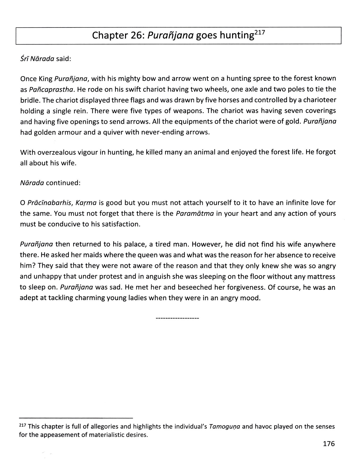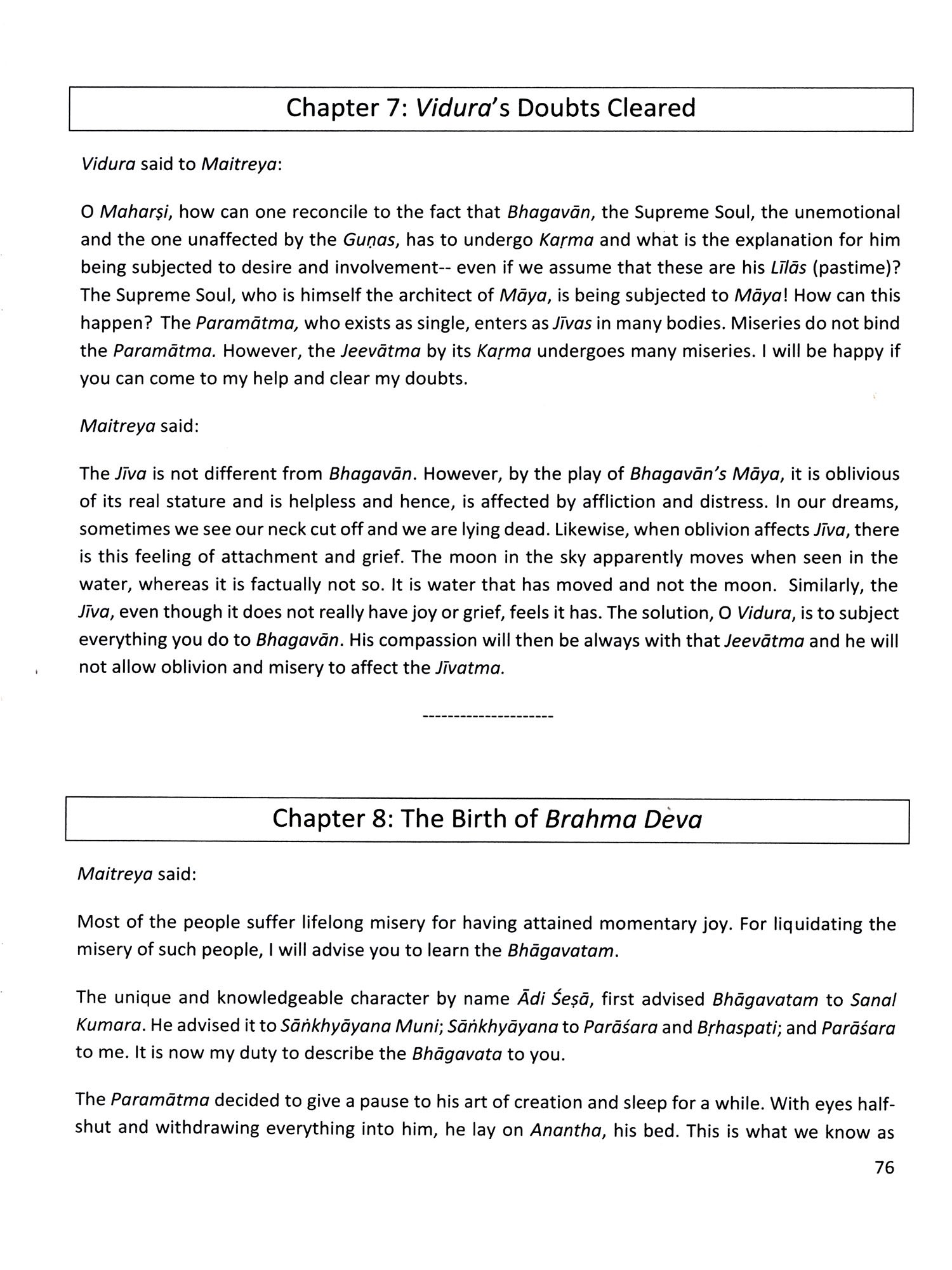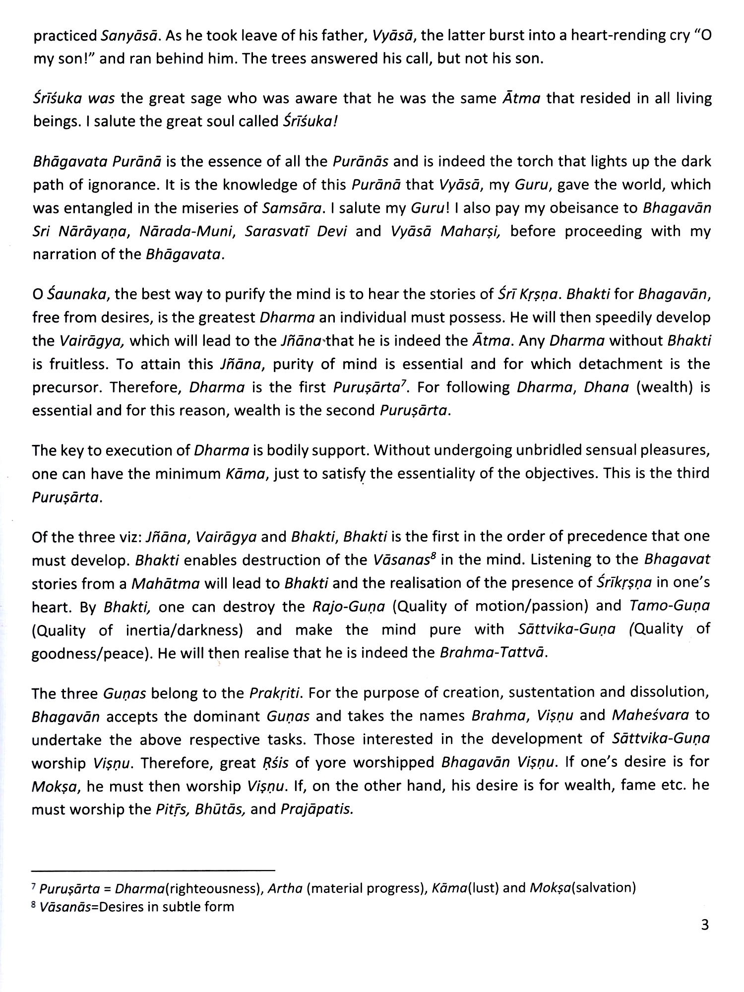 If not in schools, the parents are duty bound to instill spiritual values in their children at home, for which they themselves must be aware of the richness of values as taught in the Puranas. The awareness of the gems of advice enunciated in the religious texts is found wanting in them-a lack of understanding of the Hindu Purands Unfortunately, the parents and children who have not mastered Sanskrit/regional languages, find it difficult to understand the Puranas, which are mostly written in Sanskrit/ Hindi or regional languages. Having completed their education in English-medium schools they may not evince much interest in reading these spiritual texts, which are also very voluminous. Therefore, they tend to go along with the bandwagon of atheists, who call the highly moral stories and the characters therein as myths. It is for them, who have totally not lost all the religious fabric, that I have made this effort of bringing out the Srimad Bhagavatam in a concise form.