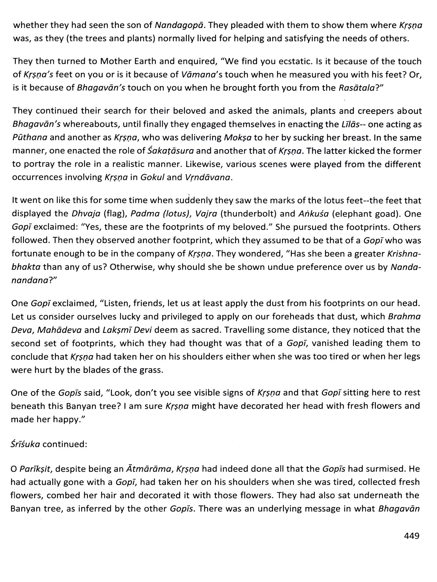 Bhagavatam preaches simple and practical guidance for attaining the highest knowledge of the Self and the Absolute Truth, who is none other than Bhagavan Srīkrsna. He lives everywhere in full consciousness and in full possession of his complete energy. He is therefore logically accepted as the Supreme Person or the Brahman, Bhagavan is Bhagavatam and vice versa. By reciting the name of the Perfect Personality, addressed in Srimad Bhagavatam as Võsudeva, even people who led lives of depravity like Dhundukori and Ajamila got salvation. Sage Sanaka and his brother ascetics narrated the Bhagavatam to Sage Narada on the banks of the river Ganges to liberate Bhakti, Jnana and Vairagya from their stupor and debility. Later Sage Saunaka and others conducted a 1000 year Bhagavatam Satra for the good of all world's people in the Kaliyuga. tales from the Bhagavatam to the Rishis present there and quenched their thirst for spiritual knowledge.