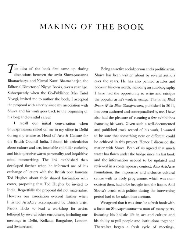 This volume features Shuvaprasanna's multifaceted work, be it painting, drawing, portraiture, printmaking, illustrations, installations, sculpture and murals, through his artistic timeline, and his contributions as a socio-political activist in building cultural institutions. Shuva-da, as he is popularly known, was actively involved with the Calcutta Painters Group in the 1970s; he founded the College of Visual Arts in 1975 and thereafter the vibrant and internationally known ArtsAcre Foundation in 2008.