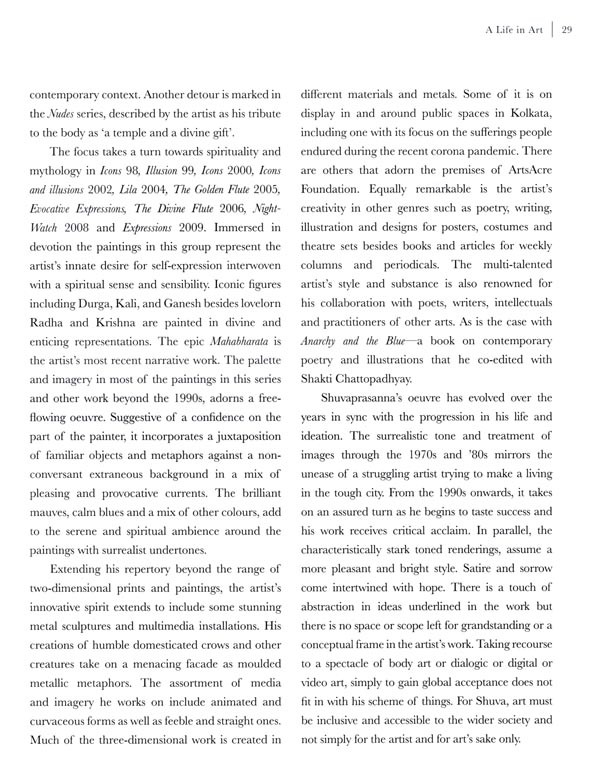 The in-depth textual description of the artist's creative evolution is accompanied by images of over 80 of Shuvaprasanna's impactful artworks from different phases of his career, including paintings of the city of Kolkata, to his signature charcoal drawings of birds, to his latest collection, 'The Mystique of the Epic', which comprises striking depictions of characters and episodes from the Mahabharata.