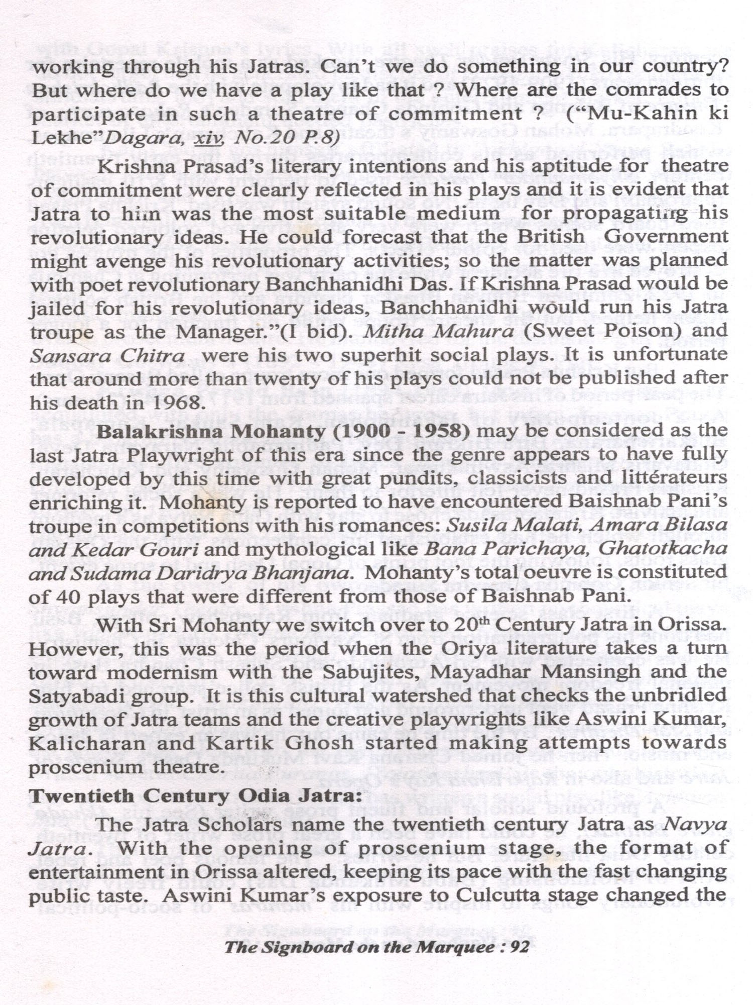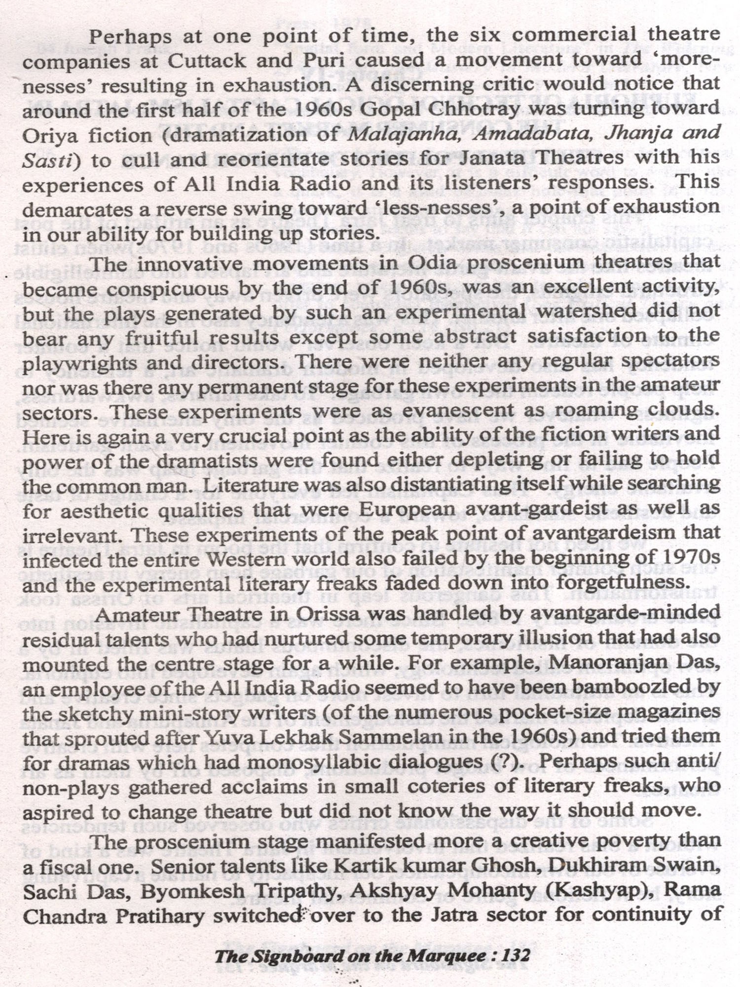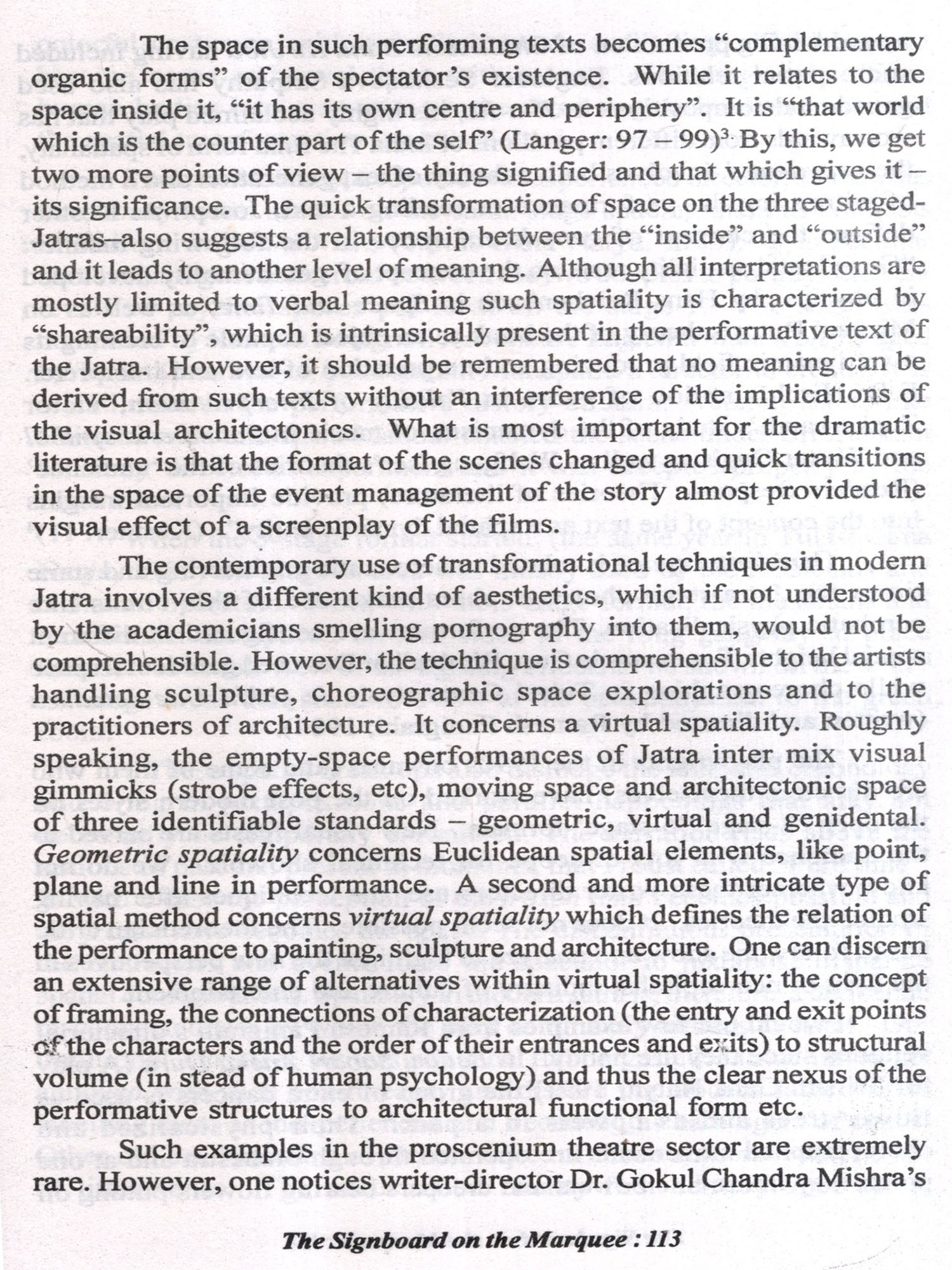 This author does not intend to find an access to such grace. He has personally worked as a playwright and a director in the Jatra Theatre from 1983 to 1992. These ten seasons of explorative involvement, after working with the painters, sculptors, musicians and choreographers for two decades in the past, was quite profitable in another direction of this writer's exposure to theatre experience. Besides, it has given this writer a sprawling vista of new relationships and adventure: moving on truck boards to remote parts of Orissa, trekking on the forsaken parts of our countryside and feeling the emotional rhythm of Odia folks on different patches of ground, under different marquees. Going on leave without pay from the college, disappearing from the monotony of scholarly studies and teaching to the same unwilling, stupid lot who search for trivia and entertainment from the class room course, fixed long ago by a languishing Board of Studies that prescribed out dated books on which cheap guide books are available, was like a refreshing escape.