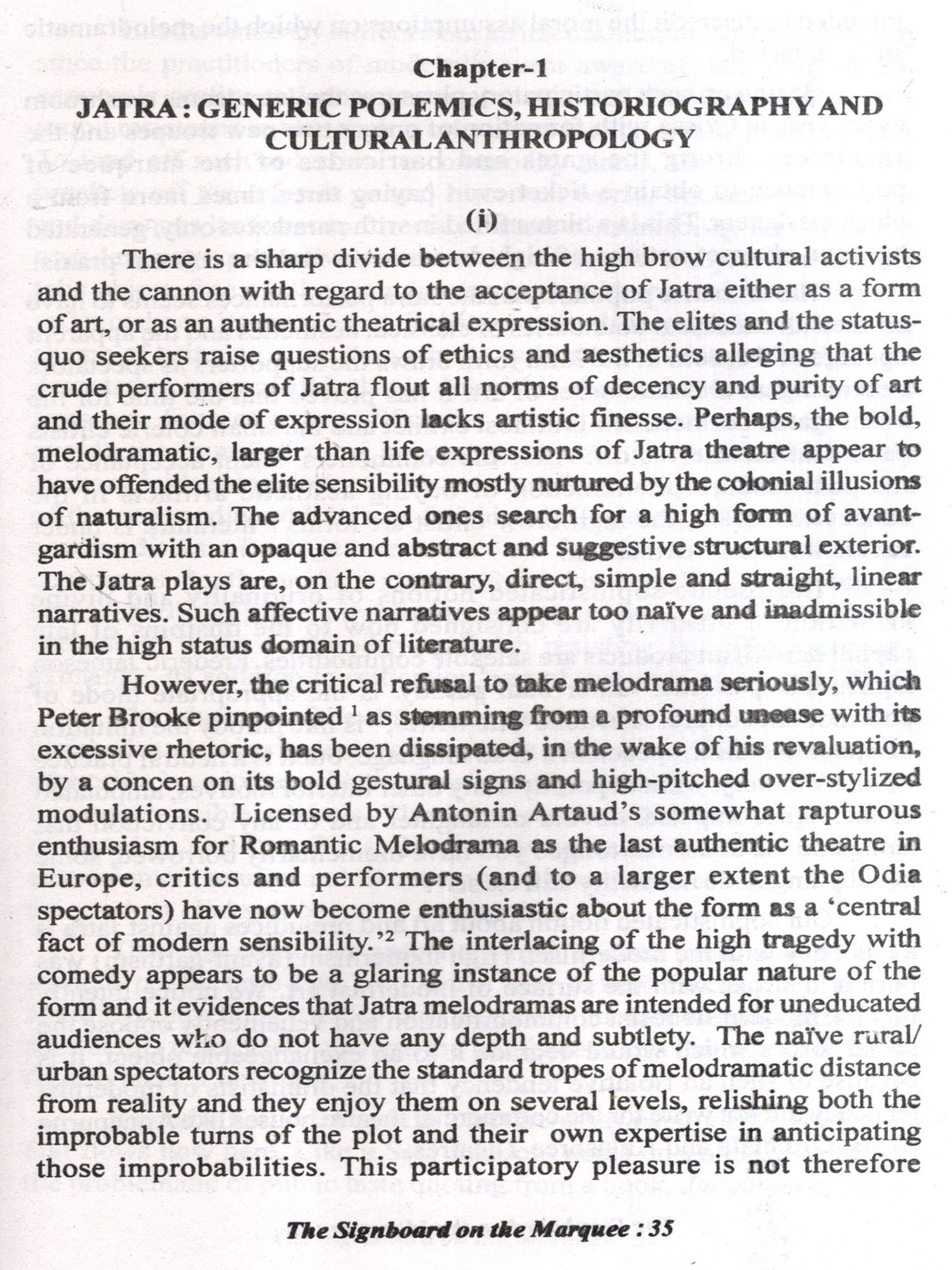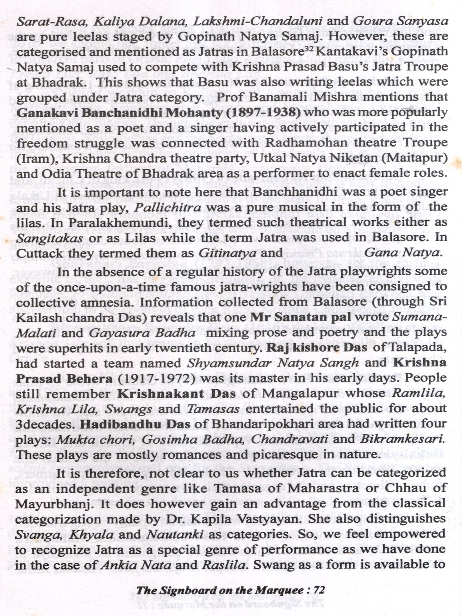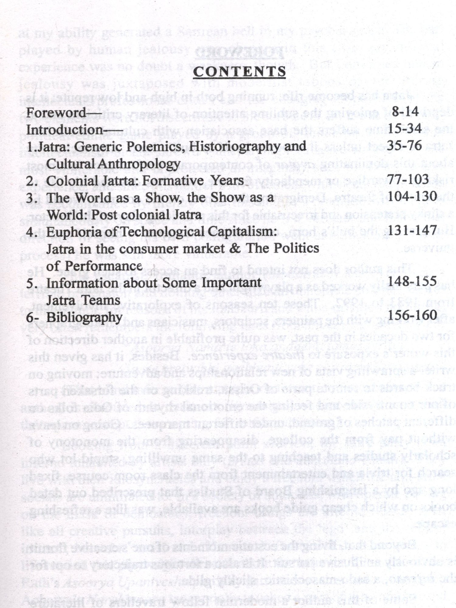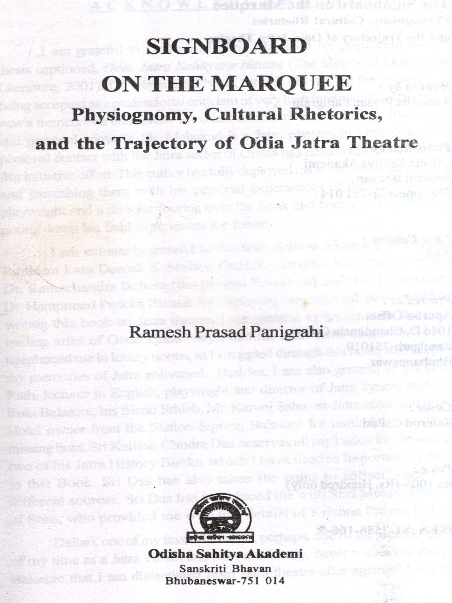 This author does not intend to find an access to such grace. He has personally worked as a playwright and a director in the Jatra Theatre from 1983 to 1992. These ten seasons of explorative involvement, after working with the painters, sculptors, musicians and choreographers for two decades in the past, was quite profitable in another direction of this writer's exposure to theatre experience. Besides, it has given this writer a sprawling vista of new relationships and adventure: moving on truck boards to remote parts of Orissa, trekking on the forsaken parts of our countryside and feeling the emotional rhythm of Odia folks on different patches of ground, under different marquees. Going on leave without pay from the college, disappearing from the monotony of scholarly studies and teaching to the same unwilling, stupid lot who search for trivia and entertainment from the class room course, fixed long ago by a languishing Board of Studies that prescribed out dated books on which cheap guide books are available, was like a refreshing escape.