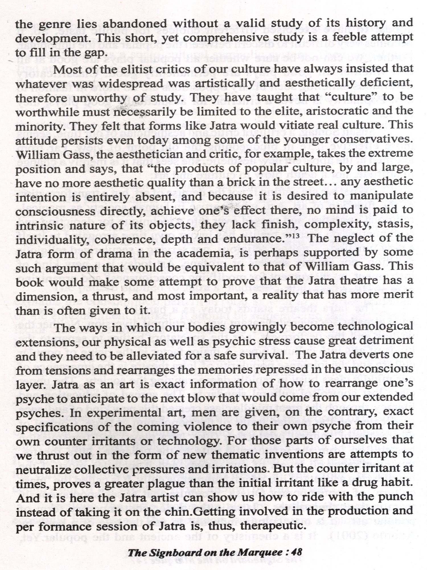 But seen from the reverse point of view, there is an unprecedented resurgence of Jatra literature and our orthodox critics have nothing to do with the qualities of the merchandise sold in the entertainment market. The publicity department of the Jatra sector, including the Jatra-journalists could be able to smother and kill the critical capacities of the customer-spectators like an opiate or outright hypnosis. The consumers of the Jatra market, however, do not admit this. The captains of promoting Jatra consciousness "educate" the masses into an unappeasable appetite not only for the theatrical goods but for new experience and personal fullfillment. It upholds Jatra consumption as the answer to the age-old discontents of loneliness, weariness, lack of sexual satisfaction; at the same time, it creates new forms of discontent peculiar to our global commercialism. It plays seductively on the malaise of industrial civilization. Is your life boring? Do you feel that the award maffia in literature have marred your career? Do you feel that your literary avant-gardism is futile at your family frontiers? Jatra consumption promises to fill the aching void. Hence, they attempt to surround their theatrical commodities with an aura of romance, even with images of female breasts and thighs from which all blessings flow.