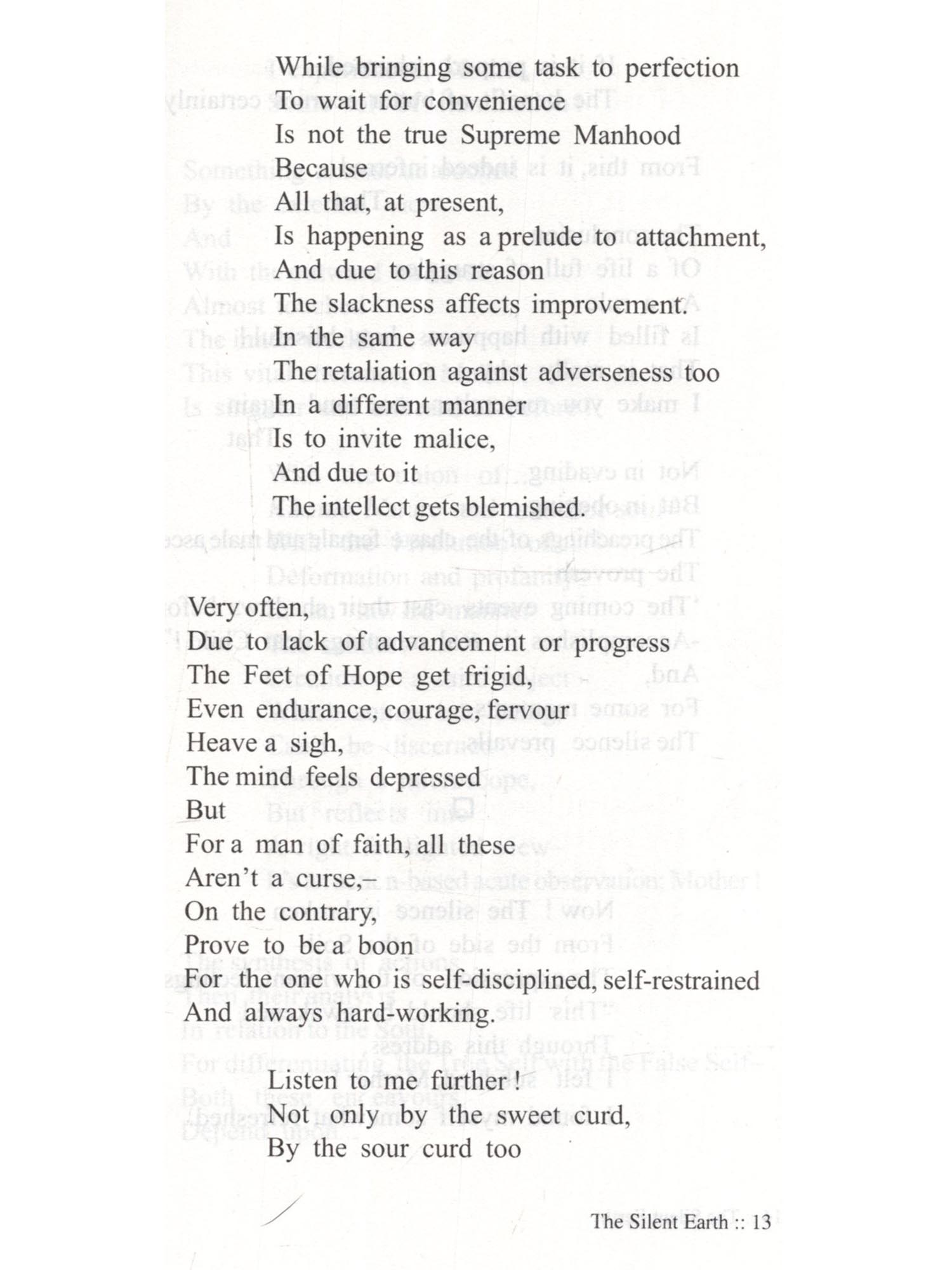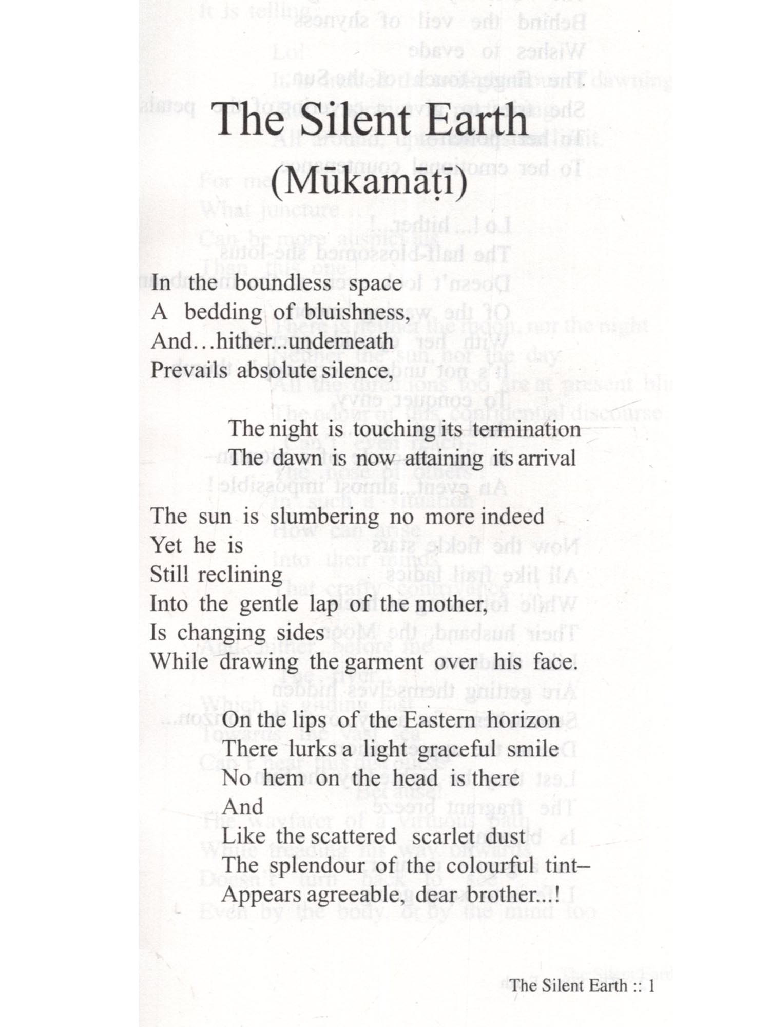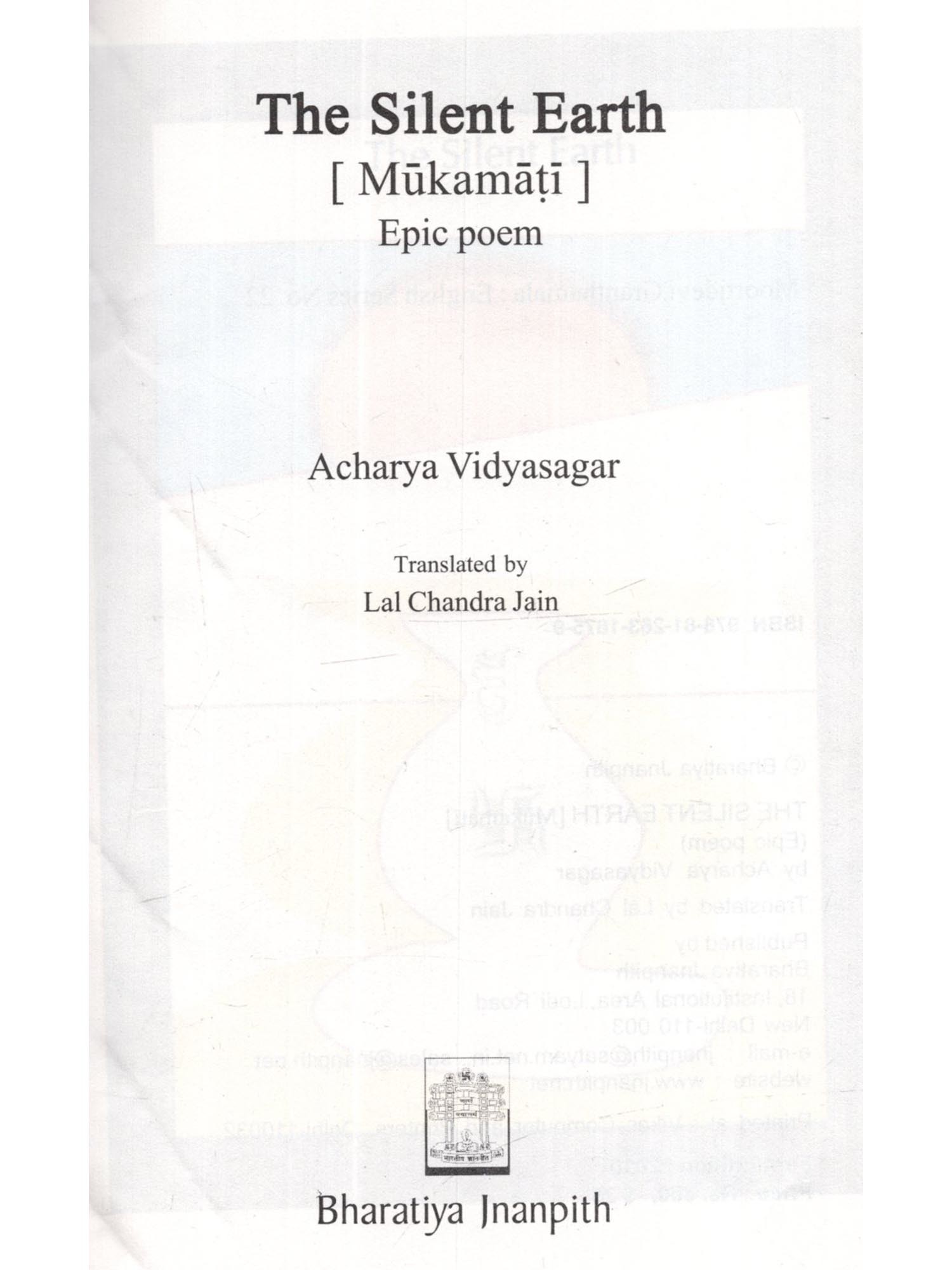 The Silent Earth Mukamati An incomparable literary creative work, The Silent Earth (Mukamati) presents essentially the religious philosophy and spiritualism in a graceful poetic style, endowing a new dimension to poetic creativity. It is the splendour of the poetic genius of the saint-poet Acharya Vidyasagarji, that he has adopted the submissive, trampled and troubled thing like 'Soil' (Mati) as the subject matter of his Epic poem 'Mokmati'. He has bestowed a voice to its silent painfulness and its eagerness to achieve emancipations. Having recognized the eternal and magnificent existence of the 'Soil', the Potter-artisan (Kumbhakara), after crushing and sifting it and removing all the impurities makes it worthy of creating his crafts. The potter provides shape to the lump of 'Soil' in his wheel and burns the craft in a furnace in such a way so as to make it a 'Sacred Pitcher' worthy of worship and adoration. This Epic poem is a grand metaphor of the journey of 'liberation of soul' from the karmic bondage while advancing towards the stage of perfect purification. The graceful figures of speech, the art of story-telling, the dramatic effects of the living and soul-searching conversations by the 'characters', which are supposed to be lifeless, the establishment of the desired spiritual sense by piercing through the layers of word-usage are all instilled within the folds of this magnificent creative work. This English translation 'The Silent Earth' of the Epic poem 'Mukamati' is thus presented to our esteemed readers.