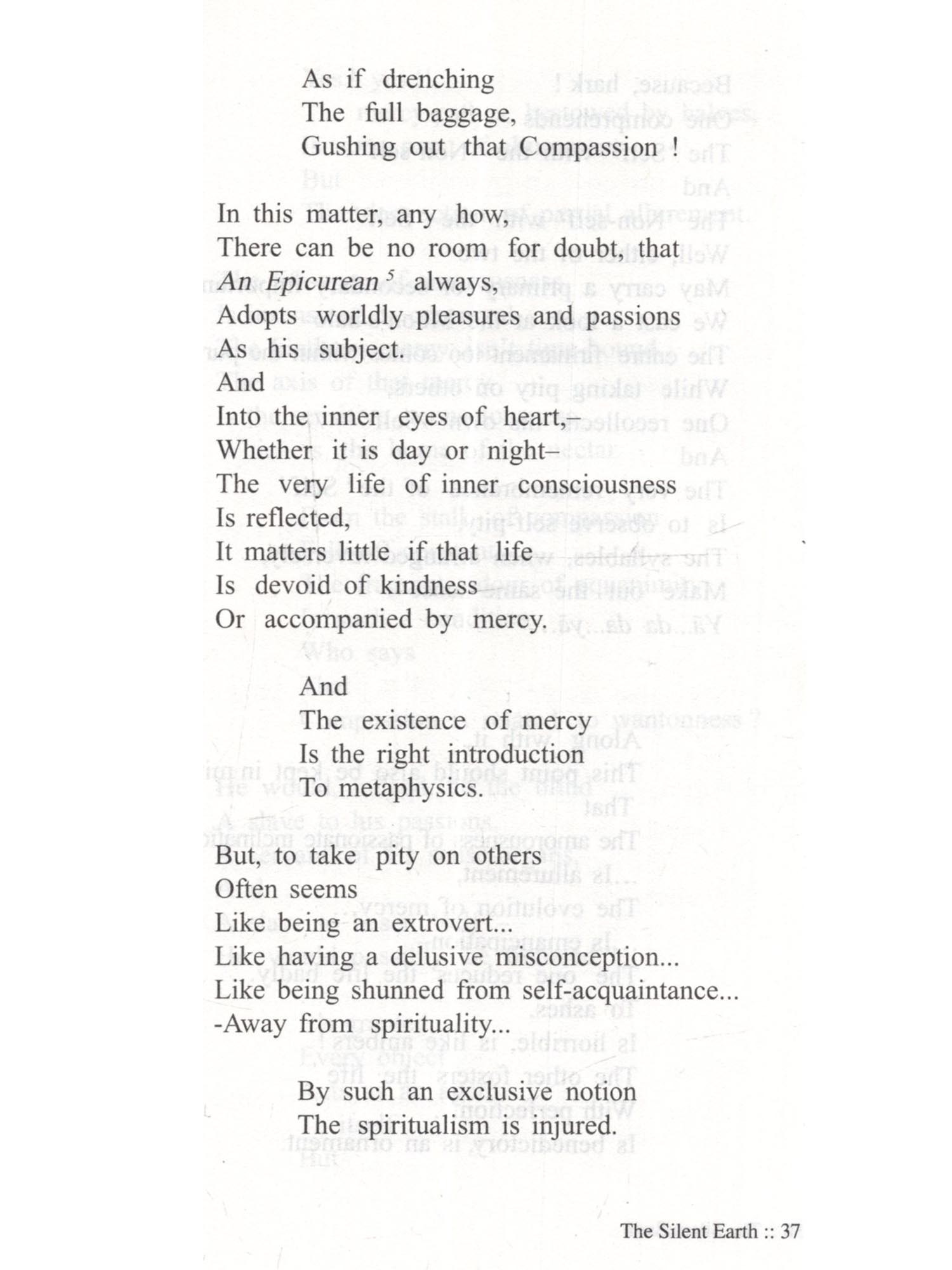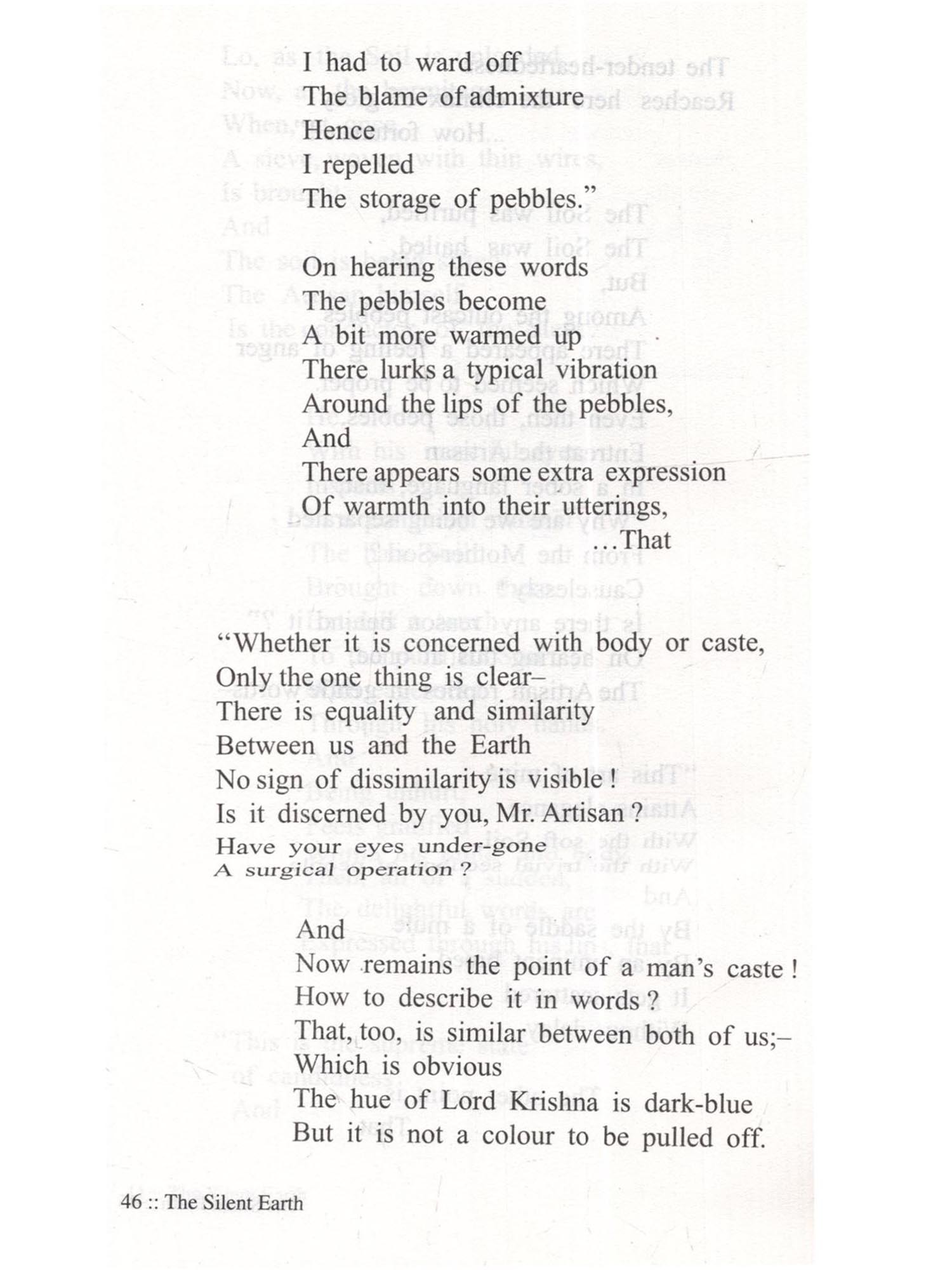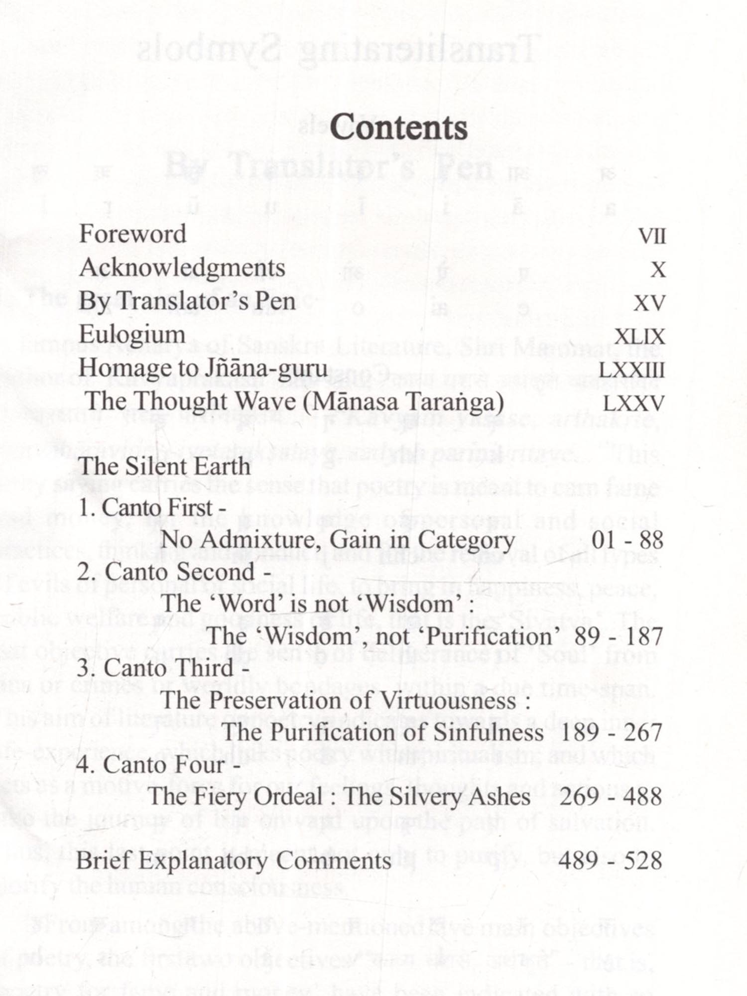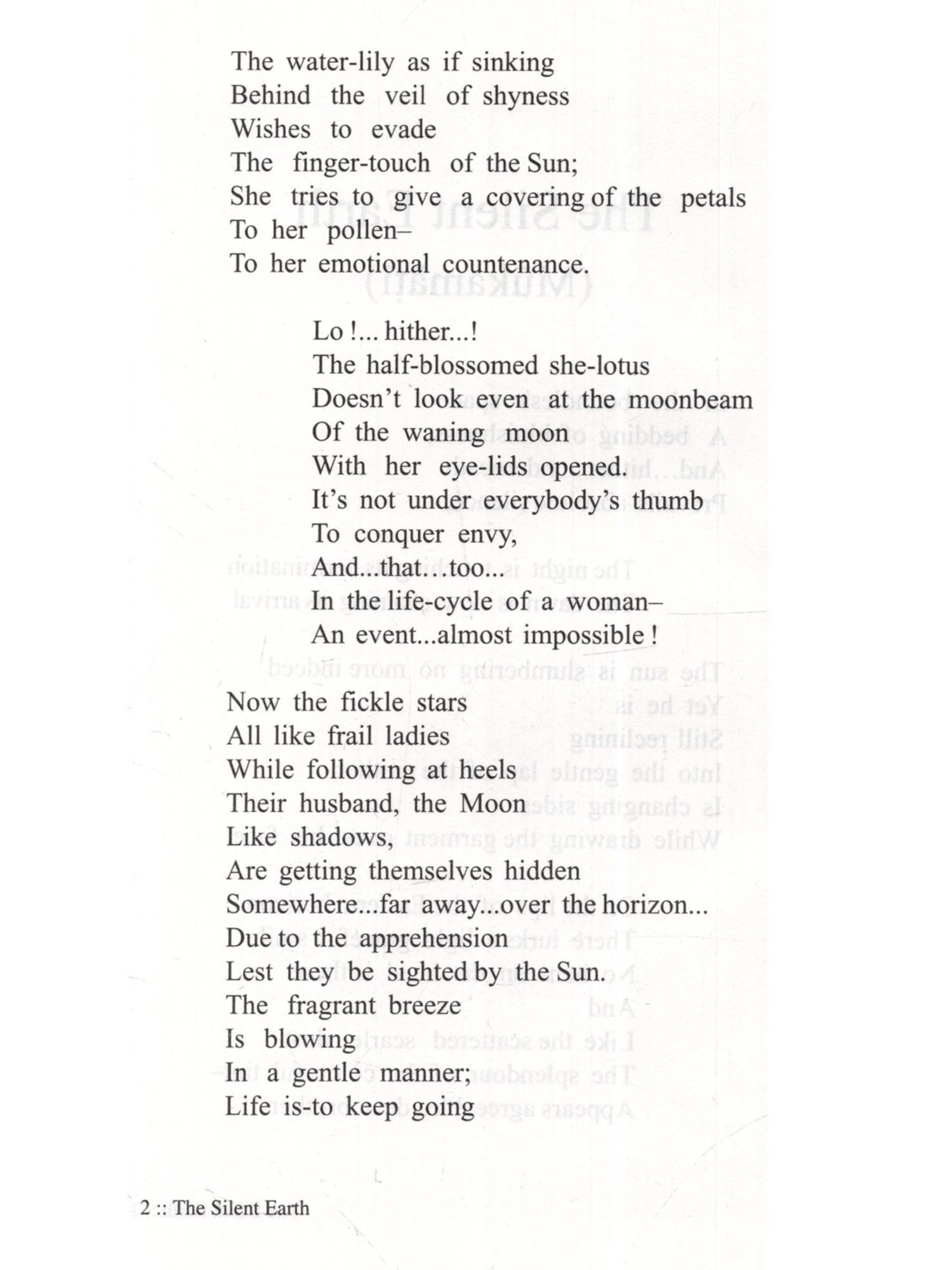 The Silent Earth Mukamati An incomparable literary creative work, The Silent Earth (Mukamati) presents essentially the religious philosophy and spiritualism in a graceful poetic style, endowing a new dimension to poetic creativity. It is the splendour of the poetic genius of the saint-poet Acharya Vidyasagarji, that he has adopted the submissive, trampled and troubled thing like 'Soil' (Mati) as the subject matter of his Epic poem 'Mokmati'. He has bestowed a voice to its silent painfulness and its eagerness to achieve emancipations. Having recognized the eternal and magnificent existence of the 'Soil', the Potter-artisan (Kumbhakara), after crushing and sifting it and removing all the impurities makes it worthy of creating his crafts. The potter provides shape to the lump of 'Soil' in his wheel and burns the craft in a furnace in such a way so as to make it a 'Sacred Pitcher' worthy of worship and adoration. This Epic poem is a grand metaphor of the journey of 'liberation of soul' from the karmic bondage while advancing towards the stage of perfect purification. The graceful figures of speech, the art of story-telling, the dramatic effects of the living and soul-searching conversations by the 'characters', which are supposed to be lifeless, the establishment of the desired spiritual sense by piercing through the layers of word-usage are all instilled within the folds of this magnificent creative work. This English translation 'The Silent Earth' of the Epic poem 'Mukamati' is thus presented to our esteemed readers.