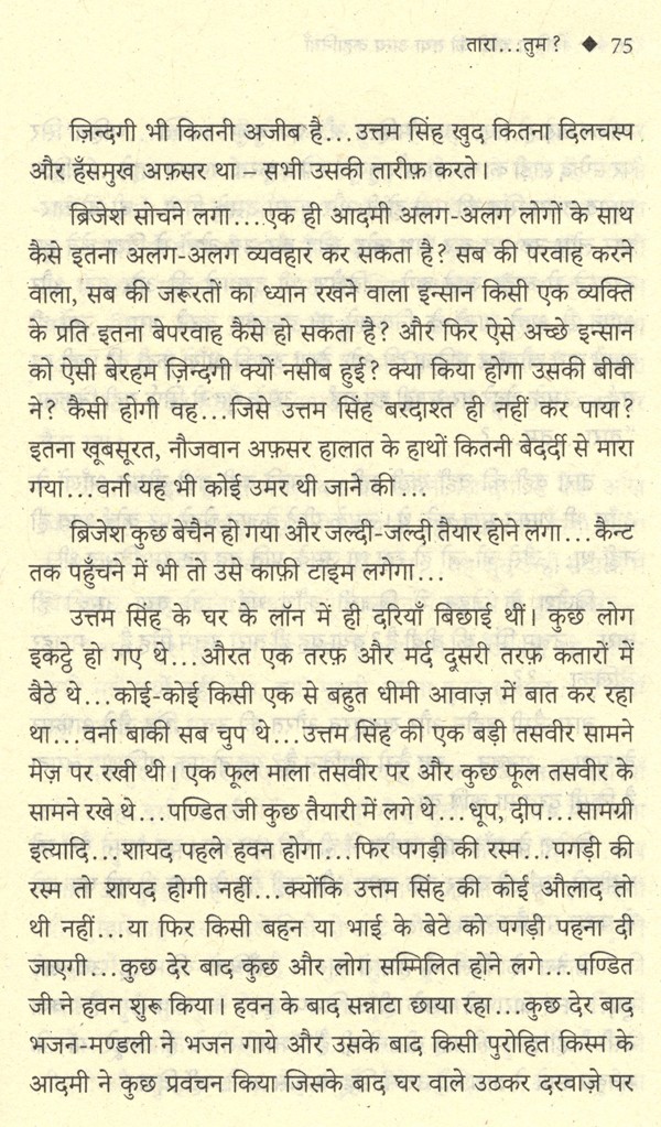 मानवीय सम्वेदना को और रिश्तों के वजूद को कहानी की कैद में लाकर अतीत के घरातल पर दिए गए ट्रीटमैन्ट से पाठक कहानी पढ़ता- पढ़ता कहानी जीने लगता है। ""तारा... तुम?"" तारा उत्तम सिंह की महज़ हाज़िरी से ही कहानी वजूद में आती है तारा उत्तम सिंह की खामोशी के नीचे गहरे उदास गलियारों में ब्रिजेश आज भी मौजूद है - यह है उमा जी का रूहानियत का 'टच' देने का अपना अन्दाज़ ।