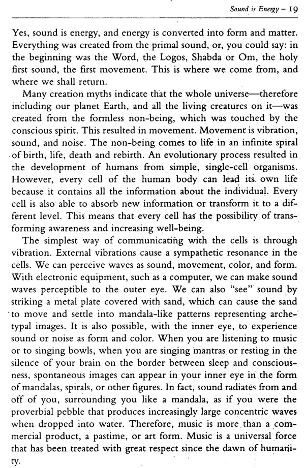 Everything in nature consists of vibrations. Sound consists of audible vibrations. You could therefore say that the whole of creation, including humanity, is music in a solid form. It is small wonder that people find it easiest to orient themselves through sound and music. Of all the senses, the ear is the most precise, and never sleeps. The effect of sound is independent of consciousness. The influence of sounds and noise on the body, mind, and soul has been seriously underestimated until_ recently. The negative side effects of industrial noise and machinery, household equipment, transportation and so on, are becoming more evident in increasing occurrences of irritation, aggression, depression, stress, and physical and emotional pain. Fortunately, in the face of all these developments, or perhaps in response to them, we are becoming more aware of the harmonizing potential of sound, and more of us are using instruments and techniques to achieve harmony between ourselves and our environment. Sound massage is primarily a process of inner depth, inviting a person listen to him- or herself and bringing him or her into con-tact with an inner quality of trust. It helps one to regain a sense of self-worth, and promotes processes of physical recovery.