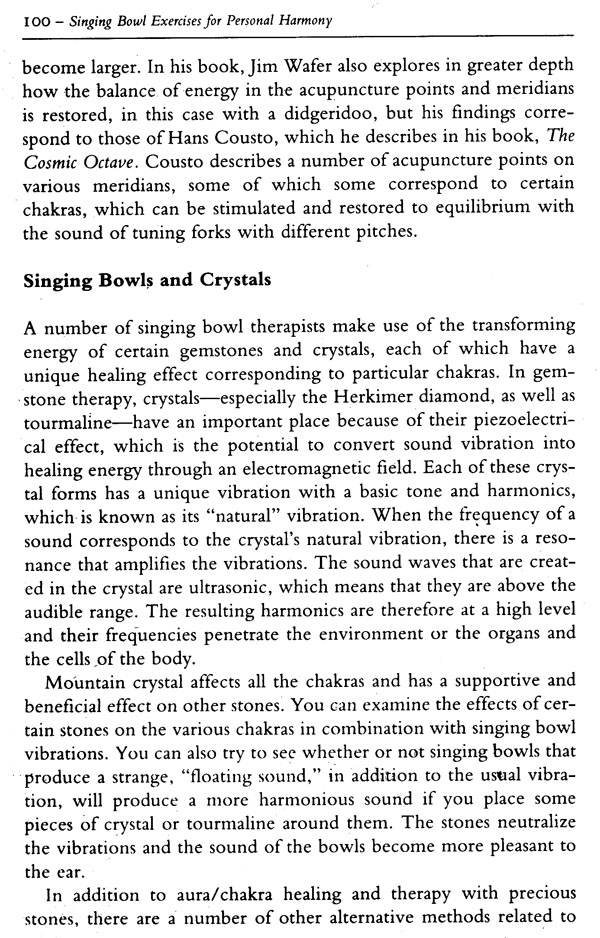 Perhaps guessing about and digging into the origin of singing z..DwIs is not very important. They exist and they have found their way to the Western world; we can make use of them and experience their transforming energy; this might be enough to know in our approach to the singing bowl. As instruments with a balanced and harmonious effect on our whole human existence, singing bowls could have a great influence-now and in the future-on our capacity for expanding consciousness, for transformation and healing. The only drawback to the increasing popularity of singing bowls in the West is that they are no longer made with the old, familiar shape and composition. With modern technology, which has also spread to the countries of the Himalayas, the craft of the of the singing bowls' original makers seems to have come to an end. All the original Himalayan bowls that are still in circulation appear to be at least forty-five years old. Occasionally, you'll come across new, factory-made bowls, which are a long way from producing the sound of the old, hand-crafted bowls, because they were cast, rather than beaten and hammered. Although they vibrate for a long time and can "sing," they lack a certain vitality; the spirit which is so characteristic of the old Himalayan bowls is missing. By playing them, you can increase the spirit and fullness of the sound; they have to be intensively played, so that the molecules of the bowls become rear-ranged in a certain way, just as a new guitar or a new piano has to be "broken in." In fact, this also applies to the old hammered bowls. It is only with use that the sounds are fully realized. In addition, crystal singing bowls were designed a few years ago in the United States. These have particular pitches that affect specific chakras. However, the original metal singing bowls are the only ones with the unique, full, warm, deeply penetrating sounds that affect every part of the body, mind and soul.