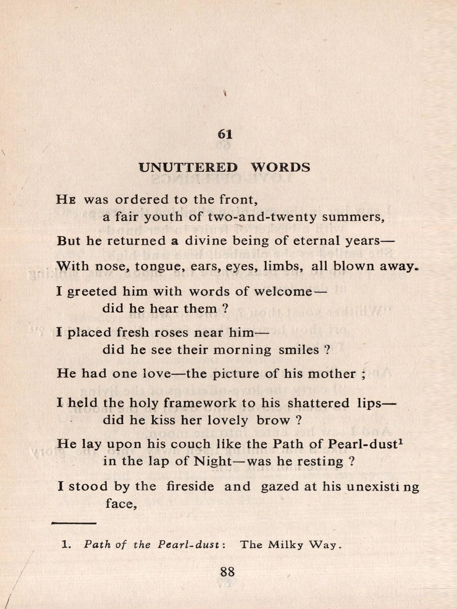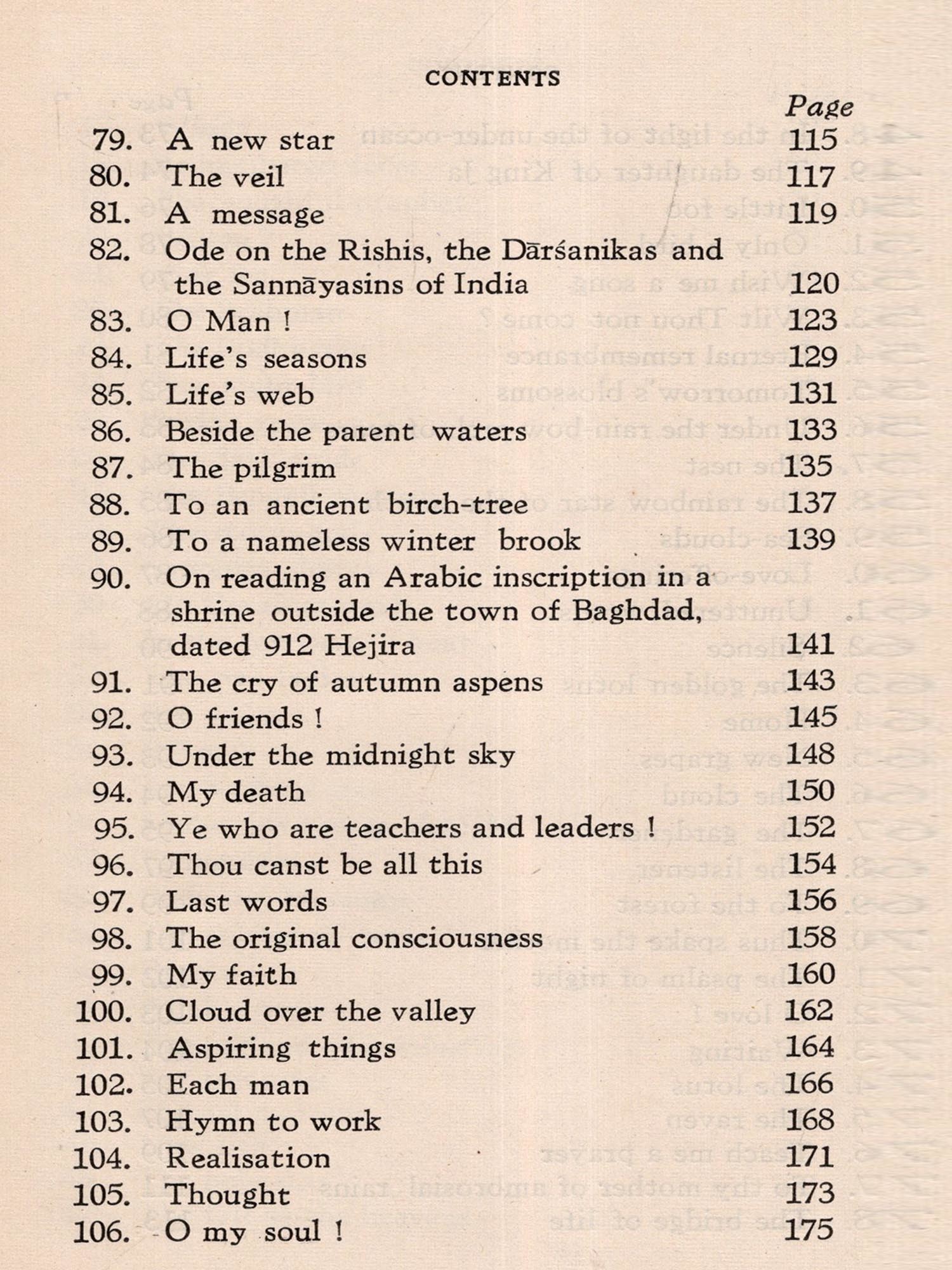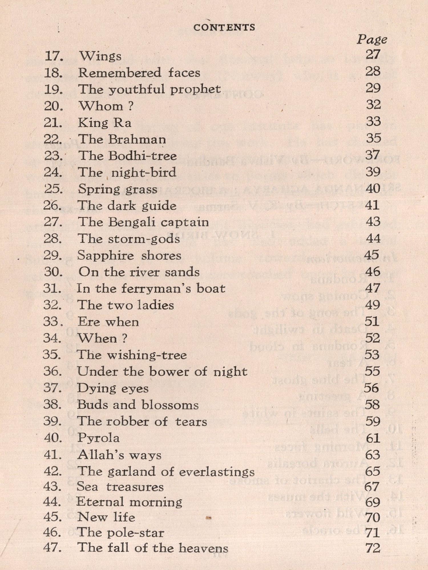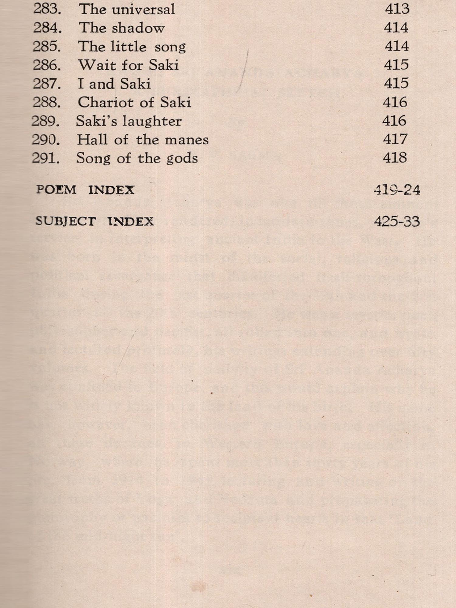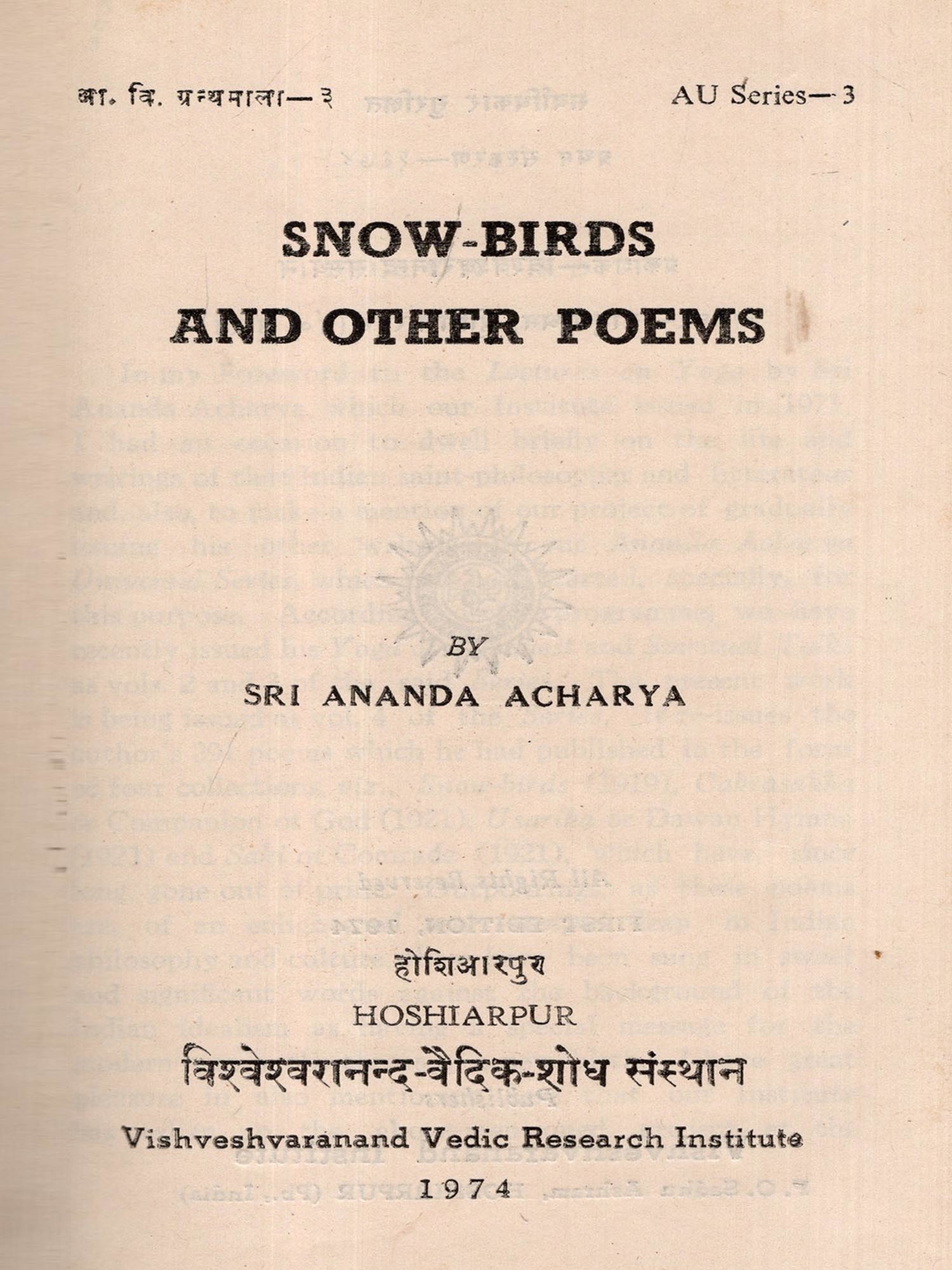 In my Foreword to the Lectures on Yoga by Sri Ananda Acharya, which our Institute issued in 1971, I had an occasion to dwell briefly on the life and writings of that Indian saint-philosopher and litterateur and, also, to make a mention of our project of gradually issuing his other writings in our Ananda Acharya Universal Series, which had been started, specially, for this purpose. According to this programme, we have recently issued his Yoga of Conquest and Spiritual Talks as vols. 2 and 3 of the said Series. The present work is being issued as vol. 4 of the Series. It re-issues the author's 291 poems which he had published in the form of four collections, viz., Snow-birds (1919), Cakrasakha or Companion of God (1921), Usarika or Dawan Hymns (1921) and Saki or Comrade (1921), which have, since long, gone out of print. Outpourings, as these poems are, of an enlightened soul, steeped deep in Indian philosophy and culture, these have been sung in sweet and significant words against the background of the Indian idealism as having a special message for the modern man in the throes of a new birth. I have great pleasure in also mentioning here that our Institute has taken up the above-mentioned project at the instance of and with the financial help so lovingly extended by Sri Einar Beer (Norway) who, is a most devoted disciple of the late Swamiji.v Shri K. V. Sarma of our Institute has put in strenuous labour in editing this work. He has checked up the entire matter, added diacritical marks to Sanskrit words, supplied suitable titles to poems which did not have them and made uniform the presentation of the poems which, on account of their having been originally issued by different agencies, had exhibited minor divergences. He has also added a useful Subject Index to the volume towards facilitating reference to the various matters touched upon in these poems.