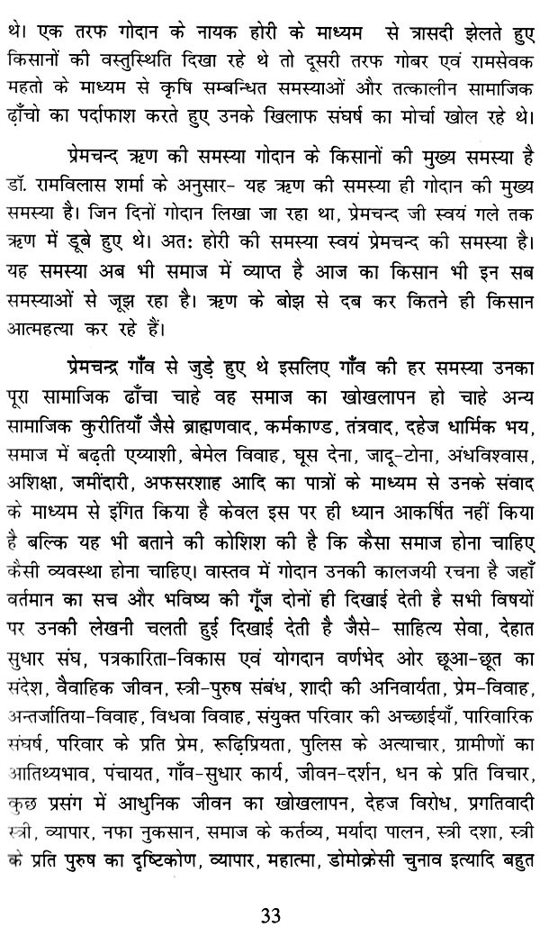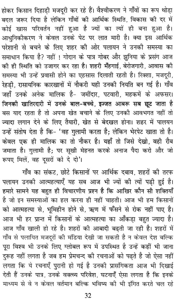 प्रेमचन्द्र के अनुसार साहित्य में तीन लक्ष्य हैं- परिस्कृति, मनोरंजन और उद्घाटन इन तीनों लक्ष्यों को पूरा करता हुआ गोदान उपन्यास है। प्रेमचन्द्र यथार्थवादी कथाकार थे और उन्होंने अपने साहित्य में कल्पना के स्थान पर भोगे हुए अनुभूत को महत्त्व दिया। उनकी दृष्टि में वह किसान जो समाज अर्थ-व्यवस्था की रीढ़ है। वही कमजोर है और दुःखी है क्योंकि किसानों का हर प्रकार से शोषण हो रहा है। कर्ज किसानों की मूल समस्या है कर्ज में ही जन्म लेना और कर्ज में ही मर जाना उनकी बिडम्बना है नियति है उनके जन्म का हर एक पल हर एक साँस जमीदार एवं महाजनो के यहाँ गिरवी है और कर्ज वहीं खत्म नही हो जाता वरन् पीढ़ी दर पीढ़ी चलता जाता है।