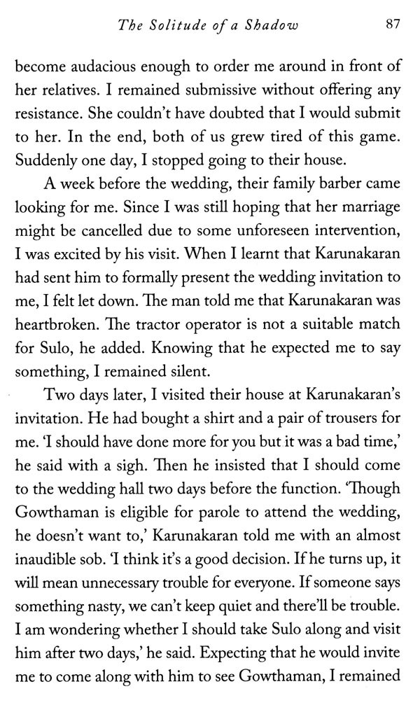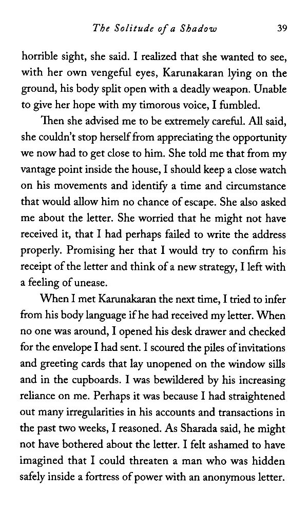 When the nameless protagonist of The Solitude of a Shadow unexpectedly encounters Karunakaran after nearly three decades, he is overwhelmed by a hitherto-dormant urge to wreak vengeance upon this man who had molested his sister and abused him all those years ago.