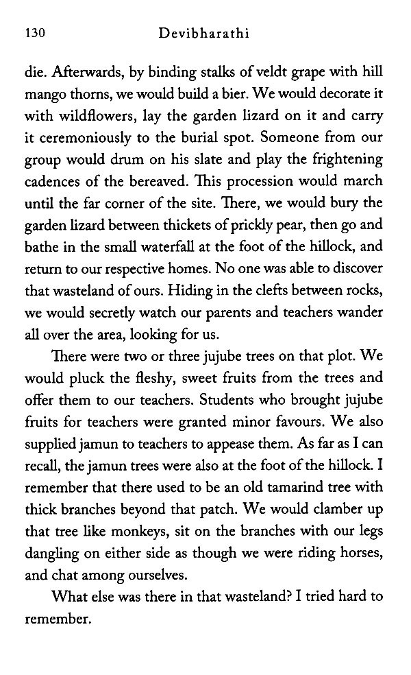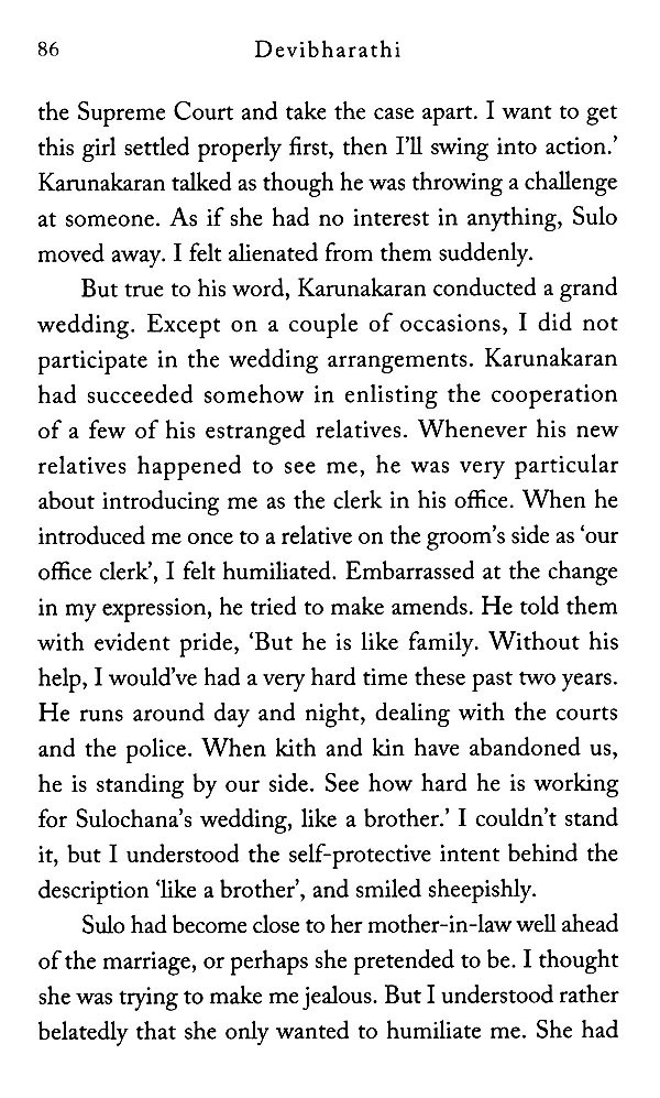 Devibharathi's novel - his first to be translated into English describes with painful clarity the poverty and isolation of obsession, while life flourishes all around the protagonist. Written in his trademark sharp, clear-eyed style, it is also an astutely observed narrative of our society and its overlapping hierarchies of caste, wealth and power.
