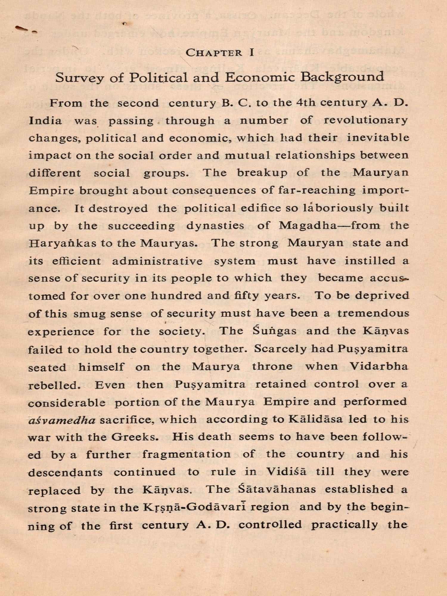 The following pages represent a modest attempt to study afresh the main features of the Indian social order, the forces that kept it together and influenced it most, of an exceedingly important period, roughly from the fall of the Mauryas to the rise of the Guptas. Exposed to the influences of startling political and economic changes, the Indian social order in the post-Mauryan period demonstrated both its elasticity and vigour, the capacity to respond to the needs of change and the ability to hold its own against external pressures. Our study which substantially represents the author's D. Phil. thesis accepted at the university of Allahabad in 1972, is an attempt to understand this interaction of the forces of change and stability vis-a-vis the social order.