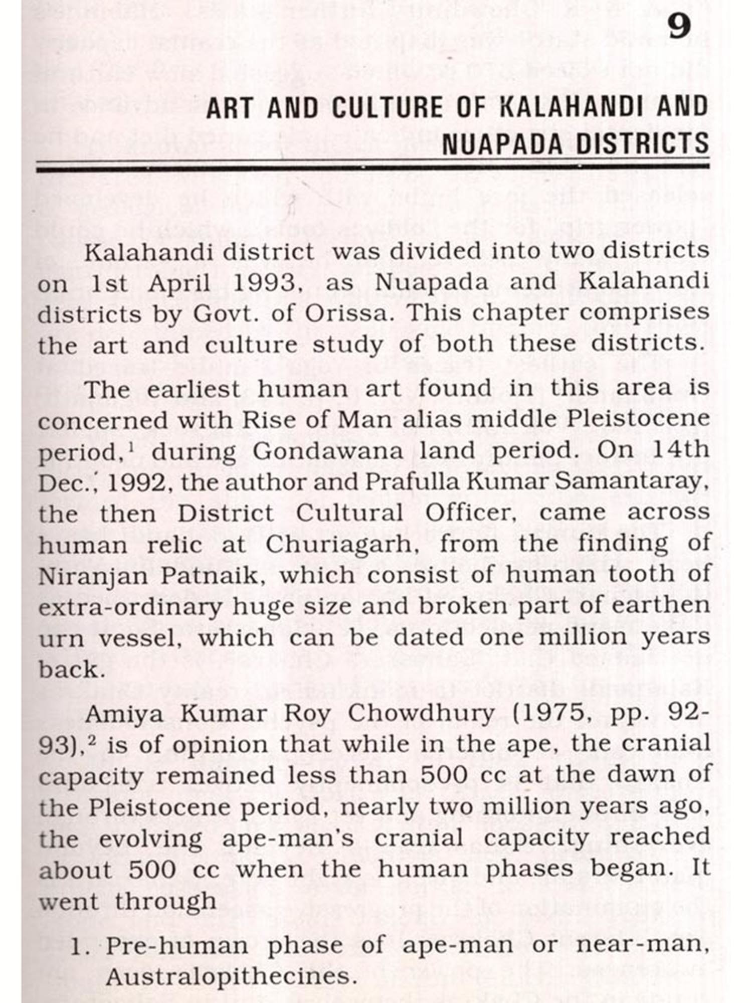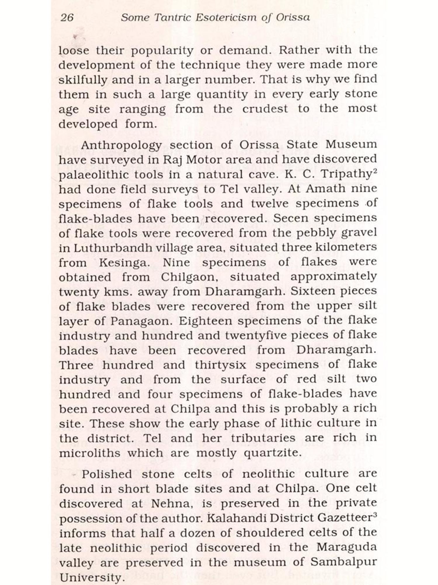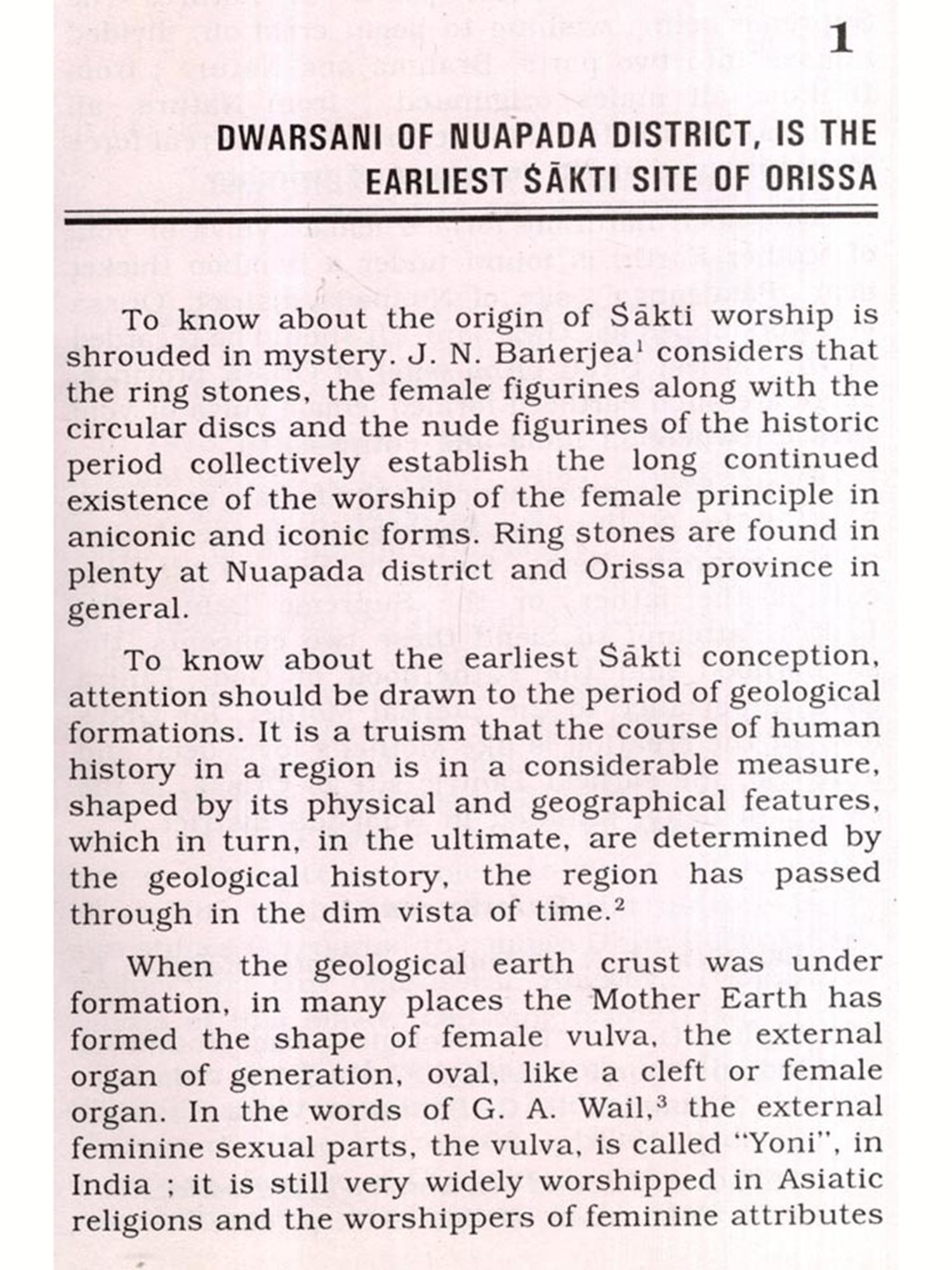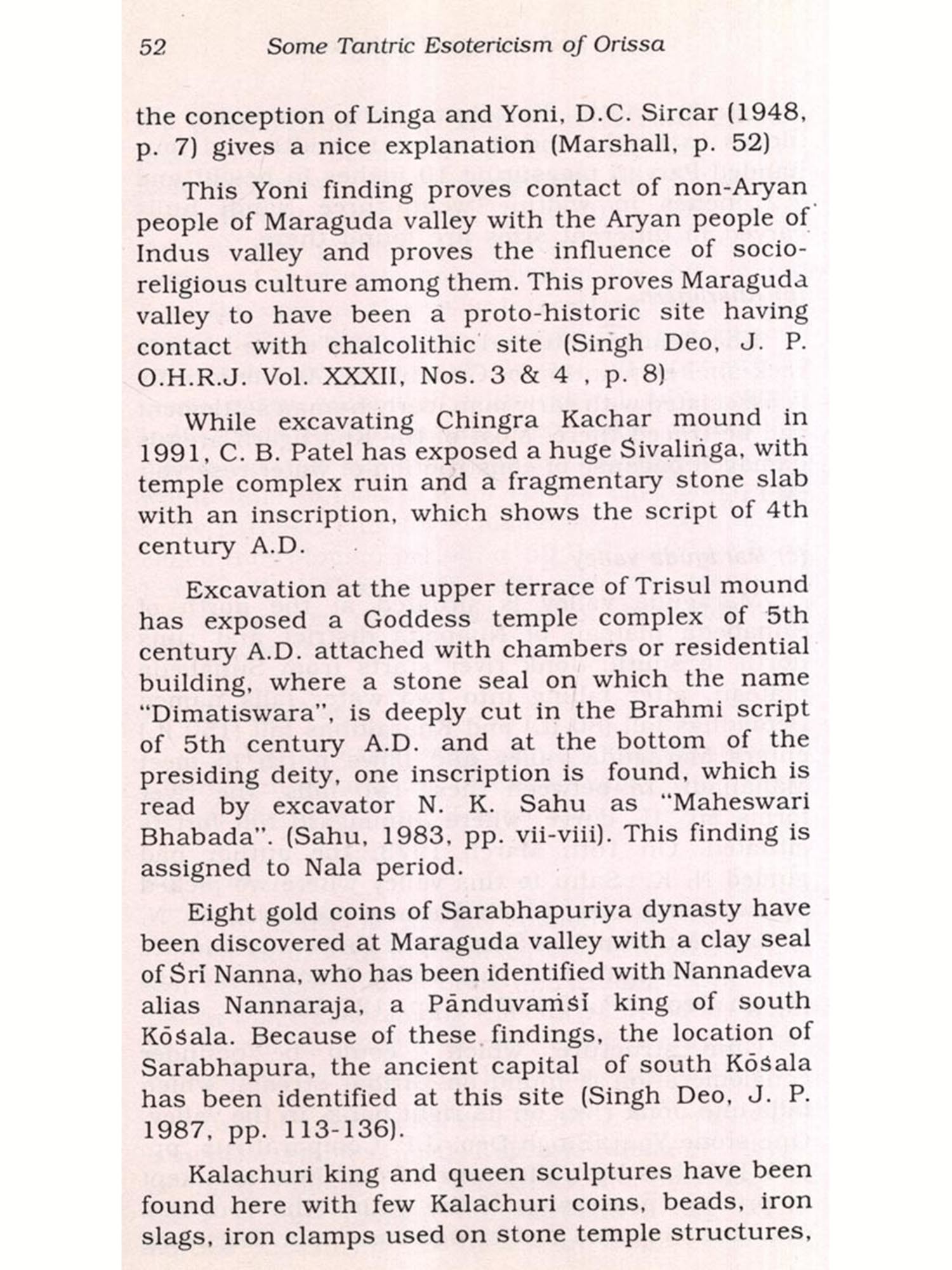 In total eight yonis are discovered in Nuapada district of Orissa province. One of these yonis, found from the Sand of Udanti river, has a triangle Yantra. Triangle Yantra belongs to the goddess Bhairavi. In general, the Yantra of Yoni itself is triangle. So, it can safely be mentioned that the Yoni worship and Bhairavi cult had originated from early historic period in this interland of Orissa. Bhairavi is a benign manifestation of Sakti, the 5th Goddess of Dasa-mahavidya and is the giver of knowledge, according to "Sākta Pramoda". ("Sakta Pramoda", ed. Sri Venkatesvara Press, Bombay, 1951, p. 262). So, it can be claimed that knowledge of human-beings has sparked out to entire globe from Nuapada district area of Orissa province. The rock area of Gurahandi shows the earliest trace of Kundalini's Sahasrara chakra, which is the gift of Tantra to Humanbeings. The discovery of Yogic conception of "Yogimath Rock shelter painting", Model stone plough, seated steatite figurine found at Khariar, ivory Babylonian Seal unearthed at Baripada and other findings discussed in this book, definitely proves that the hinterland of Orissa province had great cultures, both spiritual and material in early period. Hence the opinion of H. K. Mahatab, "Kalinga was the most prominent and advanced in all respects", as stated above, is a wrong opinion and cann't be accepted.