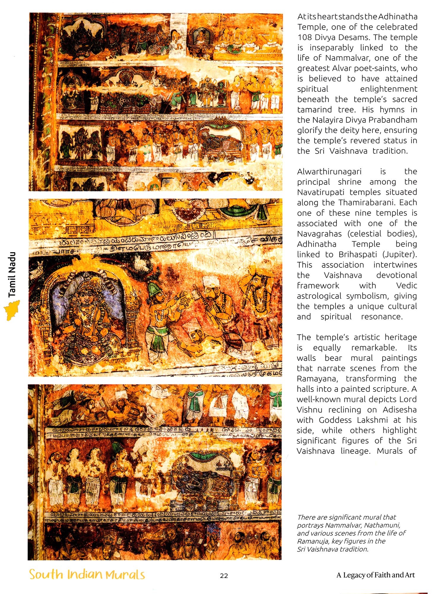 From the lotus-strewn caves of Sittanavasal to the monumental corridors of Thanjavur; from the Ramayana-wrapped Vasantha Mandapa of Alagar Kovil to the Divya Desam cycles at Srirangam and Kanchipuram, from Andal's tender devotion at Srivilliputhur to the cosmic theatre of Chidambaram; from Jain sanctuaries at Tirumalai to mercantile shrines at Illupakudi and the confluence temple of Suchindram each site is a chapter in a vast, painted scripture where pigment becomes prayer. Here, Chola finesse meets Nayaka exuberance, Pandyas, Vijayanagara rulers, Marathas, and Nagarathars left not only inscriptions but brushstrokes, carving their legacy in color as much as in stone. Even palace Ramanathapuram and Bodinayakkanur carry royal courts and caravans across their ceilings, proving that murals embraced both the sacred and the worldly with equal vitality.