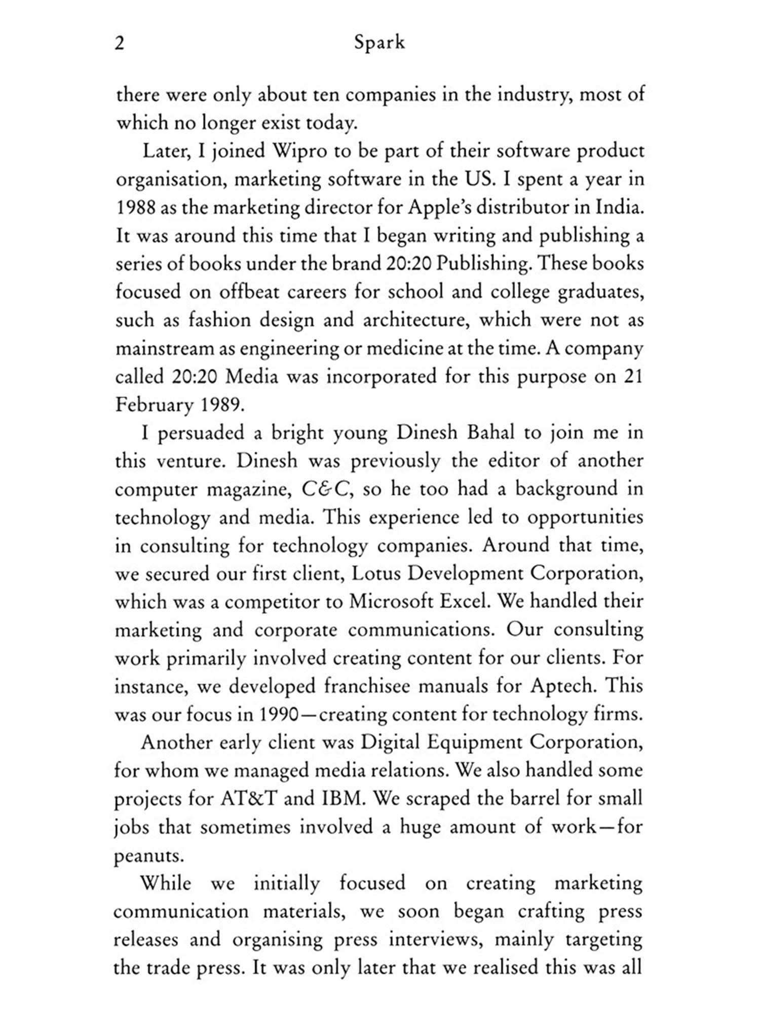 In Spark: Stories and Insights from India's Public Relations Pioneers, editors Amith Prabhu and Sarika Chavan have compiled the profiles of twenty-four senior professionals. Each essay describes their tryst with the profession, their take on the evolution of PR consultancy and what they see as the future of the business, as well as the skills and serendipity that led to their success. Through these hard-won insights and thoughtful observations, an intimate portrait of a dynamic and exciting field emerges.