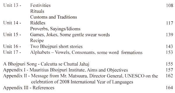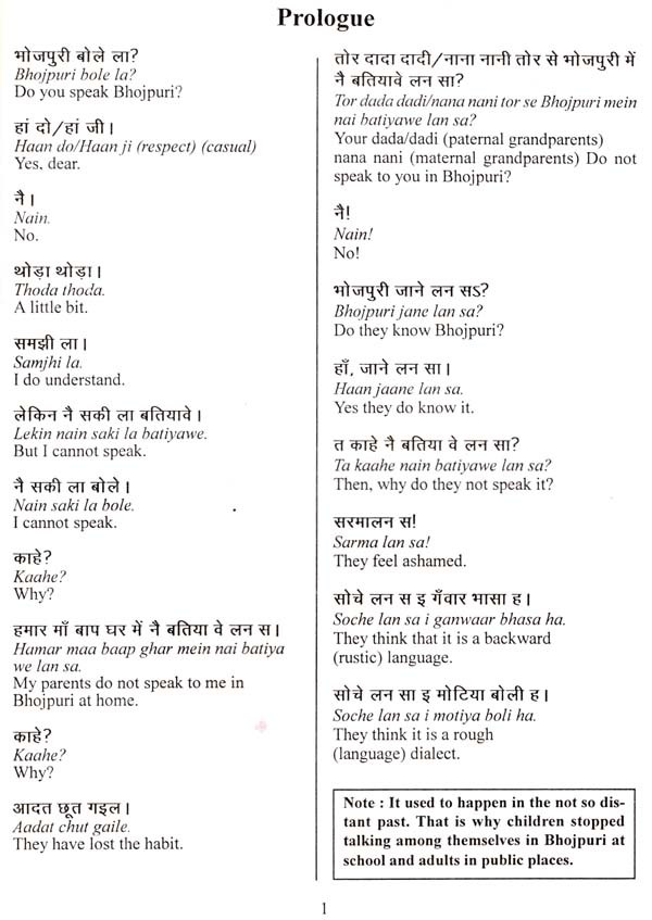 This book has been written with the intention to encourage and help readers to learn Bhojpuri with ease and pleasure and at their own pace. At the Nalanda Bookshop, people come daily looking for "Learn Bhojpuri" books. They are (1) people with Bhojpuri back-ground but who somehow have lost the habit of conversing in it or have been alienated from it for various reasons. But their love for the language is obvious and there is a fond nostalgia to go back to their linguistic roots. (2) the non-Bhojpuriphone or non-Indian origin people but living in a multi-cultural and linguistic society, they are daily exposed either to the language or to strong symbolical words which incite them to want to learn the language. Moreover, the popularity of the vibrant Bhojpuri songs is another strong magnet.