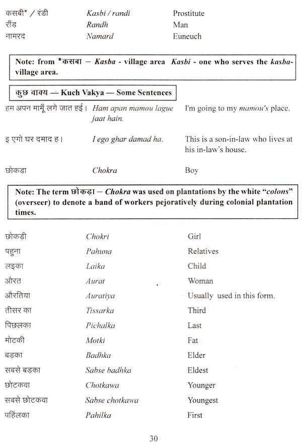 In the Indian tradition, language is speech rather than writing. I listen regularly to the various radio programmes in Bhojpuri presented by different ministries and institutions in their awareness campaigns. The presenters do try their best to utilize Bhojpuri and they do convey the message. Apart from a few exceptions, many grope for the appropriate words, which do not come to them easily, instantly. It is not that they do not know the word. But, perhaps because they do not use them regularly, therefore, it be-comes easier to use a Creole or French word e.g. pays wa mein instead of saying des wa mein, La Sante is used commonly instead of swasth or tabiyet. Even in India, one hears Indians using English words, for example life mein instead of jeewan mein. This is a new tendency. It is a lack of practice that leads to this situation. I have seen even in the far removed areas of the Bhojpuri belt in India ladies who are completely dessi and unlettered in the formal sense, saying Time ka ba? instead of the usual ketna bajal ba? Here it is a question of globalization. Therefore, in this book I am providing the appropriate vocabulary that such resource persons who make regular public presentations in Bhojpuri may find useful. It is also useful for mass education programmes e.g. health, road traffic on T.V. and radio and for social centres, policemen in general, doctors, lawyers, teachers, businessmen, advertisers, media people and journalists, village and district councilors and politicians in general who have to address the gathering in Bhojpuri.