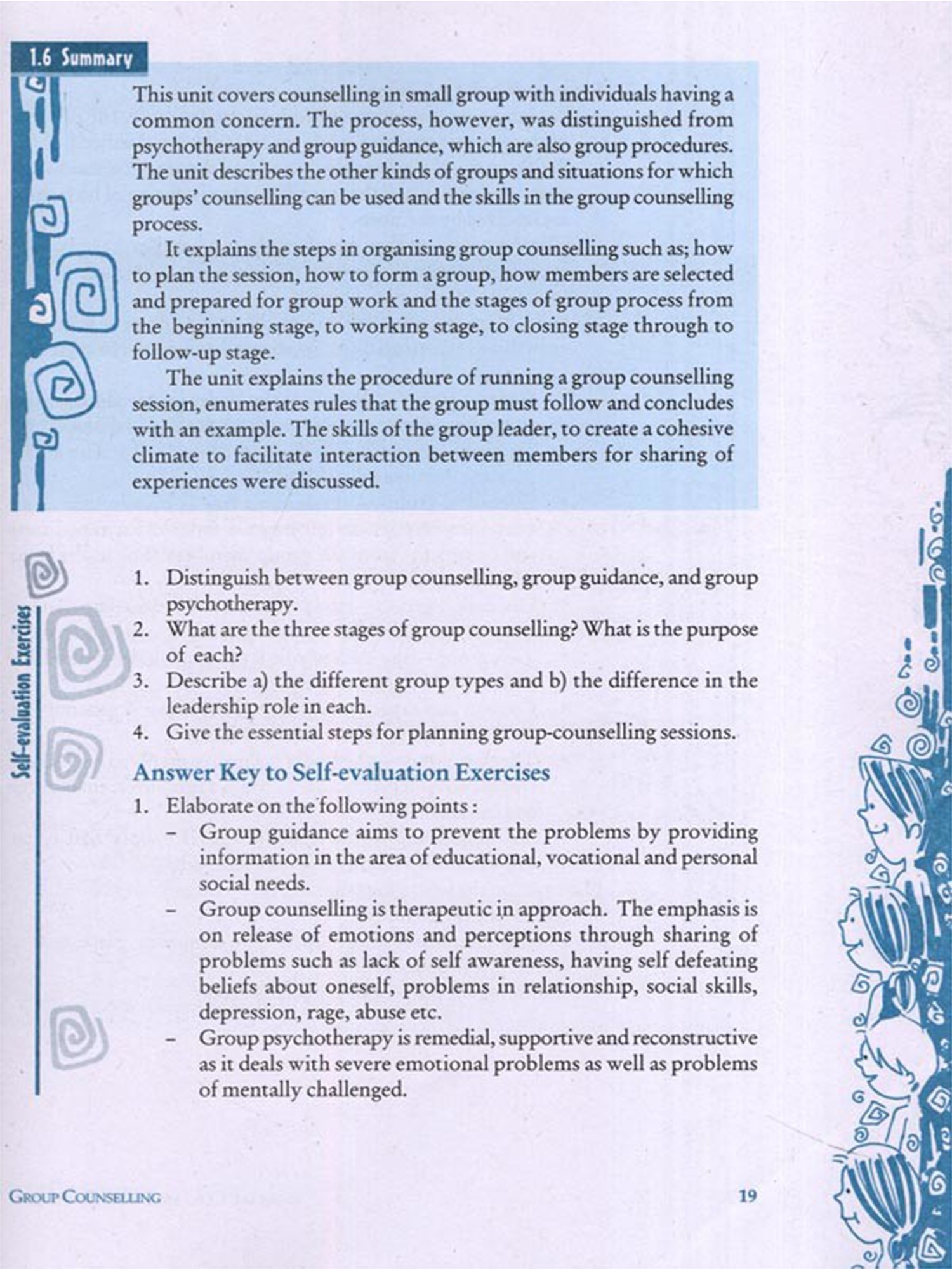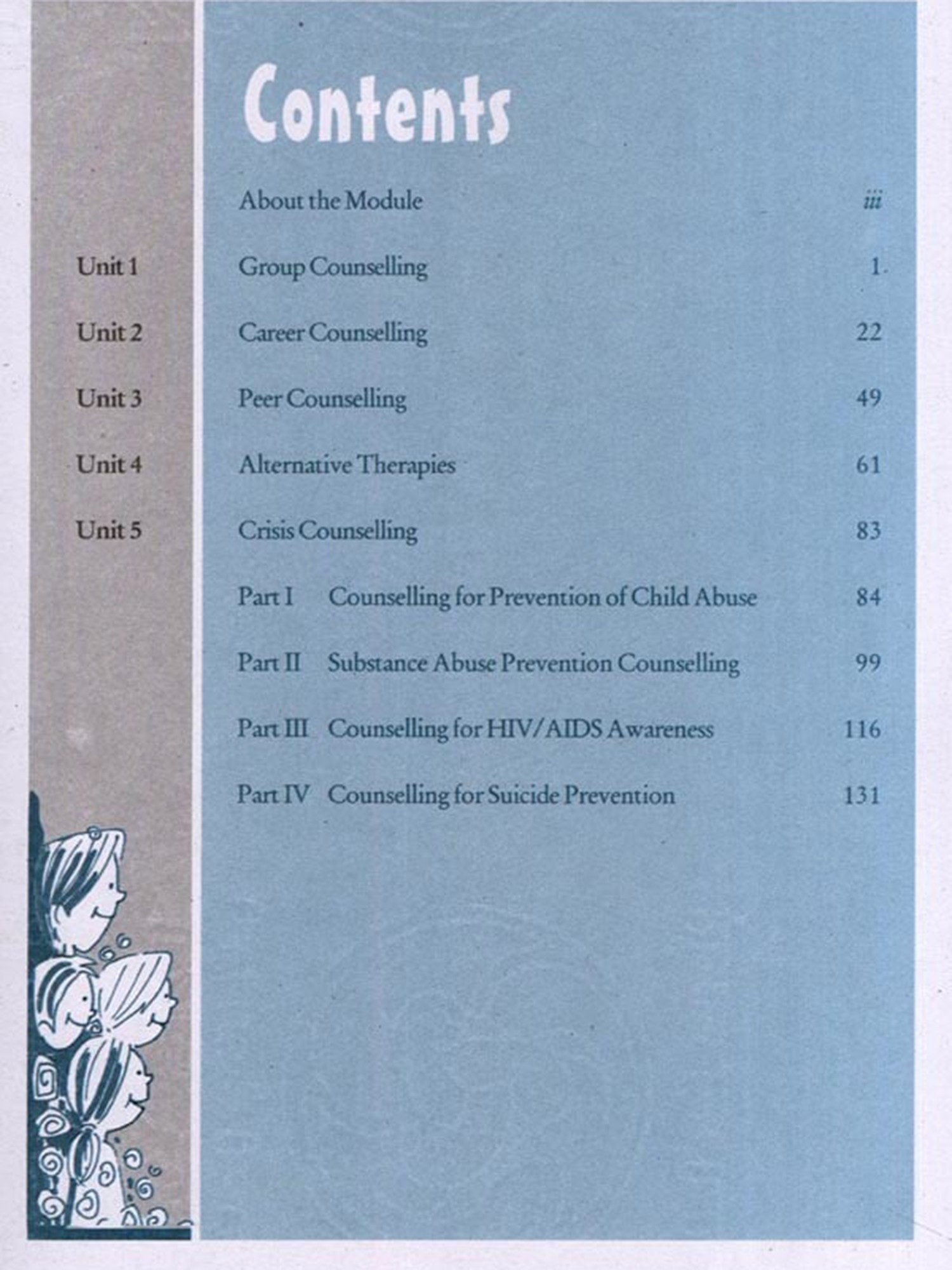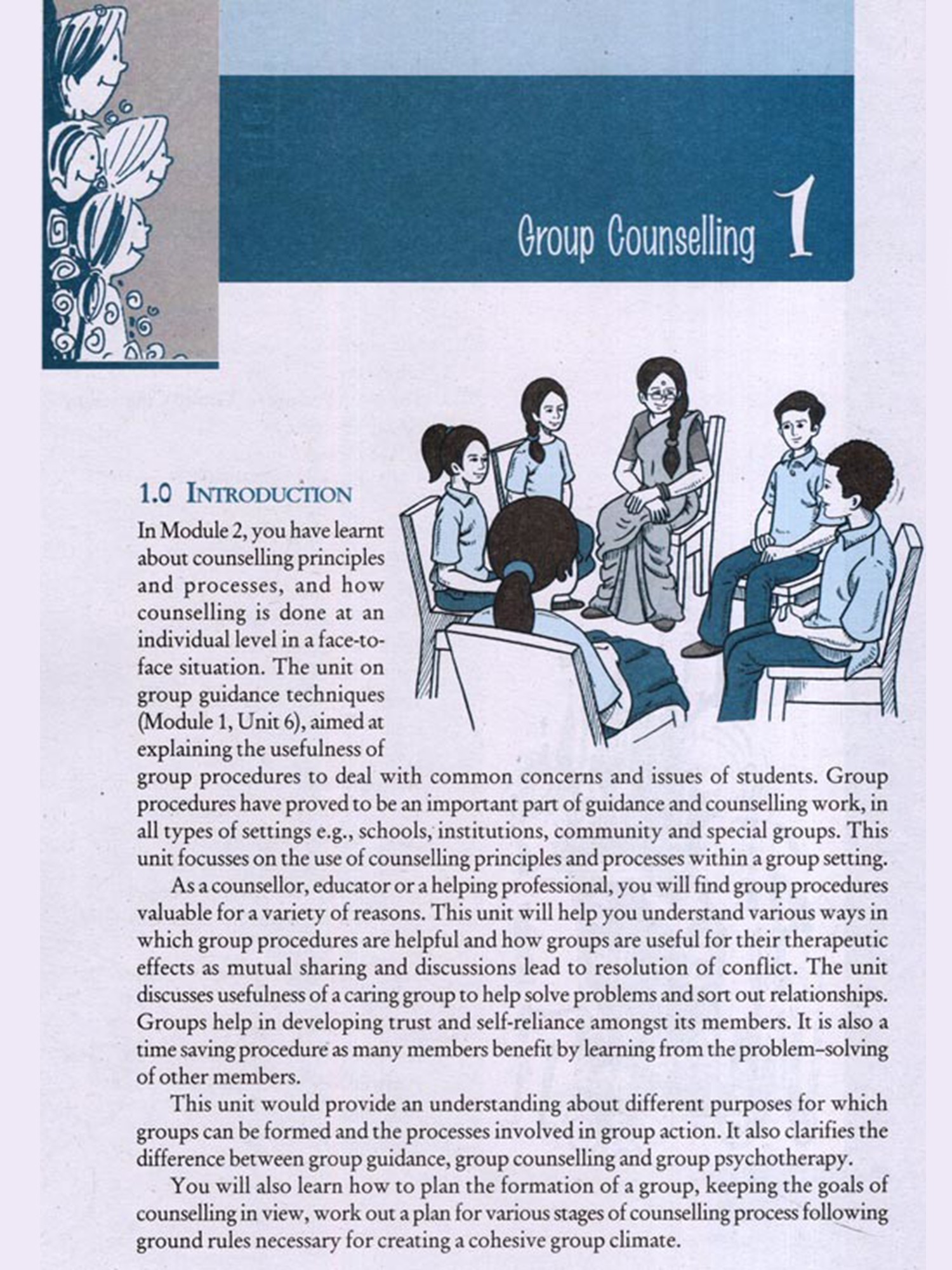 Based on the concept that guidance and counselling are needed by all, this module discusses strategies to provide counselling to as many students as possible in small and large groups. Unit 1 of this module discusses one such strategy known as group counselling which has emerged as a popular therapeutic technique to meet the immediate needs and concerns common to a group of students. The skills of the counsellor lie in empowering the group to use its own resources for problem solving.