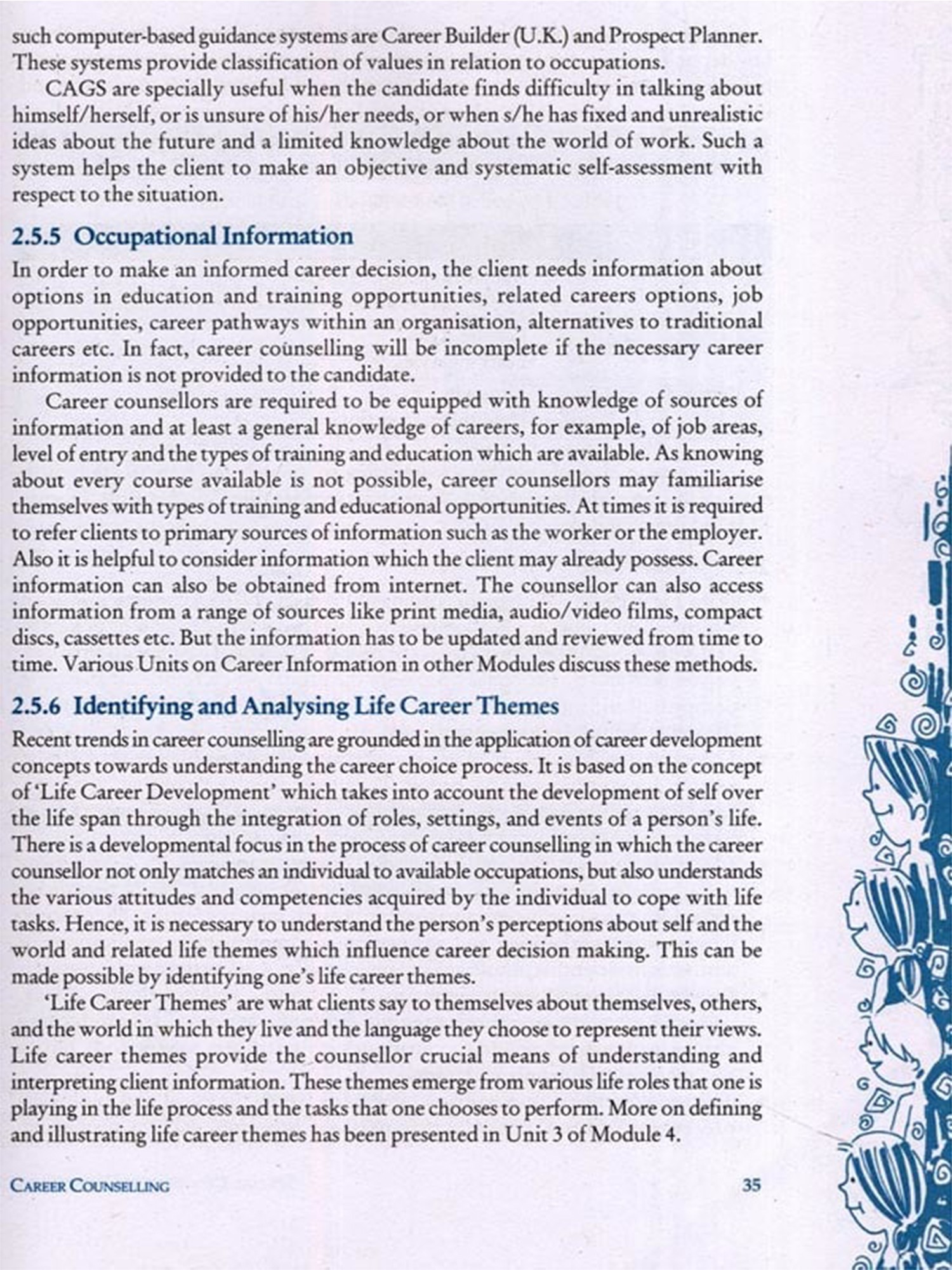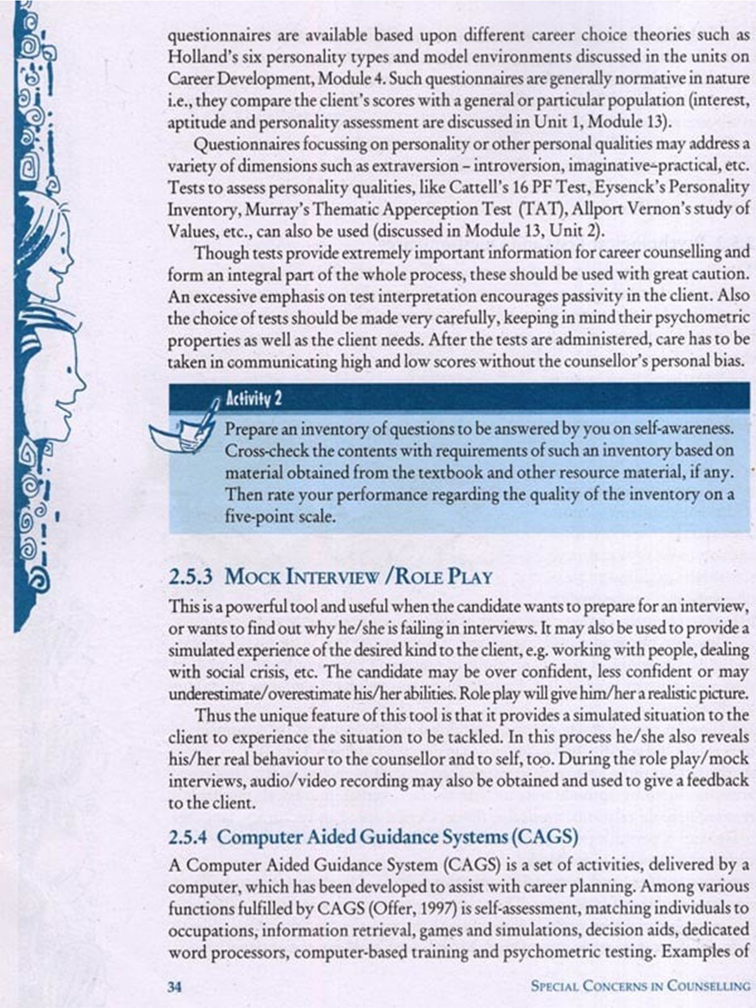 Counselling is generally understood as a therapeutic strategy to deal with issues and concerns of emotional and social nature. Career counselling has emerged as a specialised intervention to help clients deal with career choice related issues. In a fast growing and competitive world, such interventions can help in facilitating self and occupational awareness, exploring opportunities, developing career planning skills and making career related decisions etc. Unit 2 on 'Career Counselling addresses issues related to helping students develop career planning and career management skills.