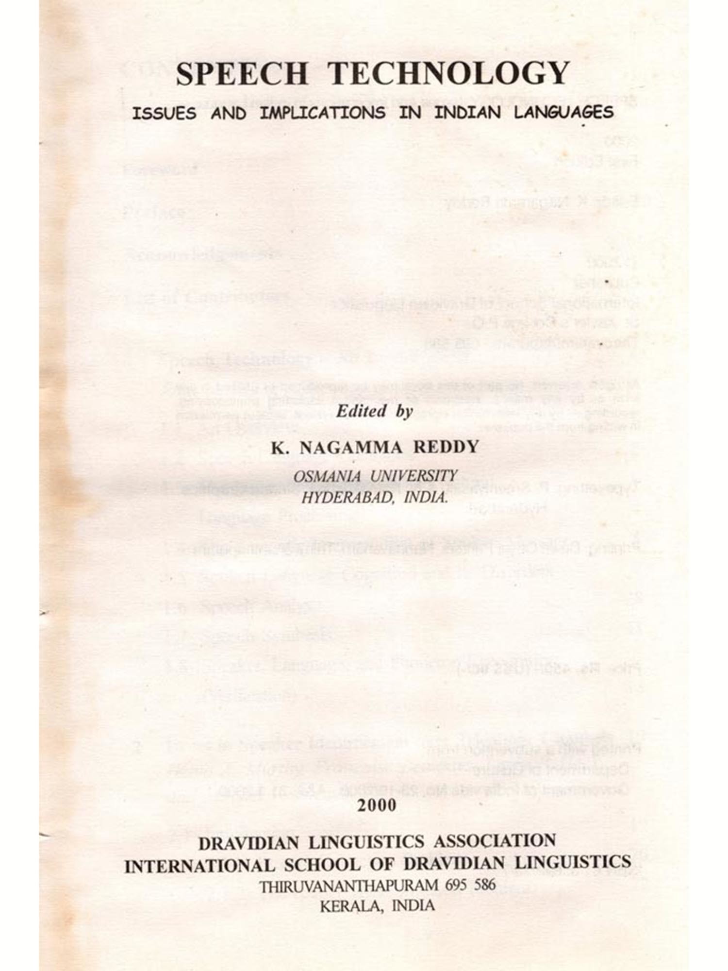The papers presented by a score of professionals on Speech Technology in the 26 All India Conference of Dravidian Linguists which met at Potti Sreeramulu Telugu University, Hyderabad are now collected by Dr. K. Nagamma Reddy and presented to the world of scholarship.
