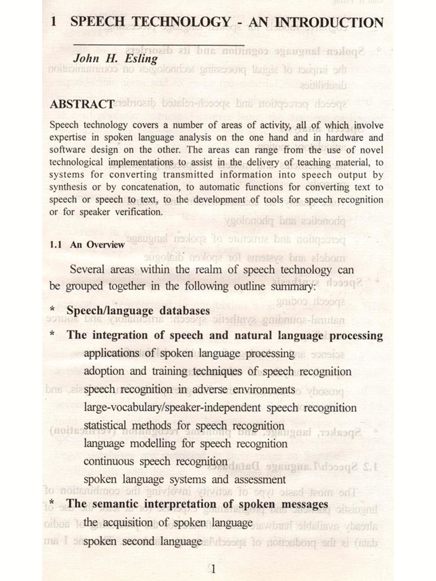 The introductory article on "Speech Technology" by John Esling is an invited paper which outlines several areas of speech technology such as speech language databases, integration of speech and natural language processing, semantic interpretation, language cognition and its disorders, speech analysis, speech synthesis, speaker/language/phoneme recognition and verification as some of the potential areas of research. Esling suggests that speech technology can grow as a productive research area and it will continue to be a multidisciplinary endeavour. An interesting coincidence has emerged in that almost all of the research areas identified in the introductory paper by Esling are explored in the contributions submitted in and discussed at this Symposium.