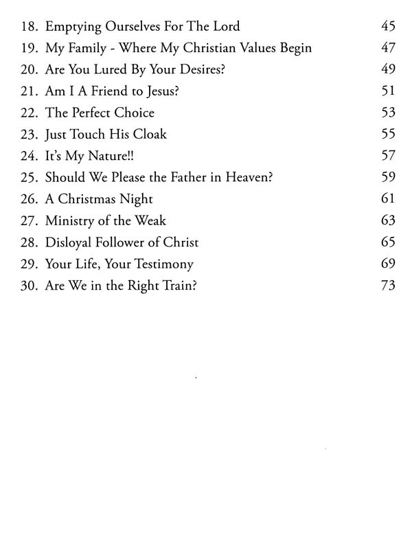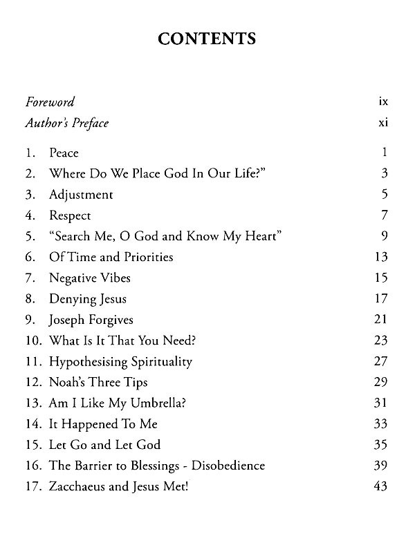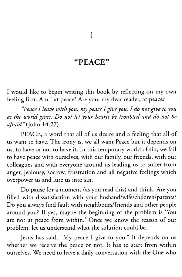 There are also some lessons shared from the author's personal experiences which people very often encounter in their personal life yet fail to overcome by themselves. The writer, who has been born and brought up in a devoted and committed Christian family has her own way of dealing with certain life's challenges and overcoming with the help of the Holy Spirit and by pondering and reflecting from Scripture.