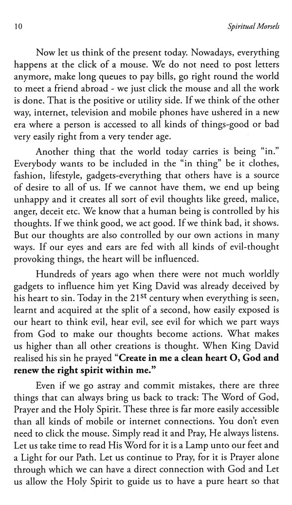 Further, reading Spiritual Morsels will also strengthen their personal spiritual life as it deals with some Bible truths in the form of simple sermons as well as lessons from Bible figures that can be understood even by an adolescent yet with a powerful message.