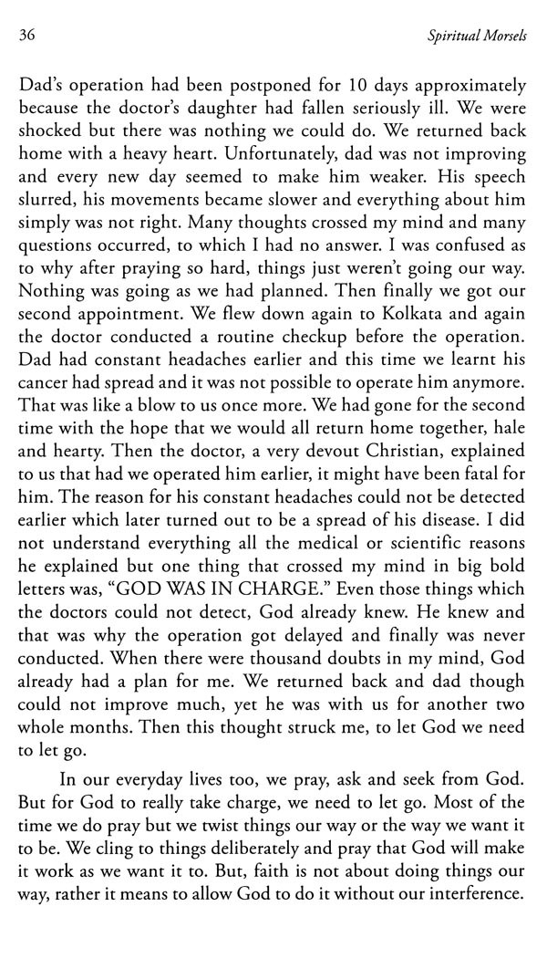 Spiritual Morsels is the right receptacle or palatable for hungry and empty souls. It will provide nutrients with a balanced proportion of ingredients and make it a desirable taste and easy for digestion. Spiritual Morsels deals with a suitable and relevant topic beginning with peace which is the need of the hour for every heavy heart. The Hebrew word Shalom which is translated as Peace can be used idiomatically to mean 'Hello.' Therefore, 'Hello' to everyone who feel empty and hungry, who need to fill their emptiness with God. Only God can fill up the gaps of the emptiness of life and I could see that the youth of today bluntly try to sync themselves with the rising modern technologies without realising the consequences for their personal spiritual life. In the process of attempting to sync with the fast changing trend, they find it hard to adjust themselves with their personal life and gradually lack their self-esteem and thereby resulting in disrespectful manner and ultimately move on to different negative thoughts. For such kind of people, Spritual Morsels, I believe will rekindle their personal values and create an opportunity to re-examine themselves and to come back and streamline their personal lives with the normal Christian Life.
