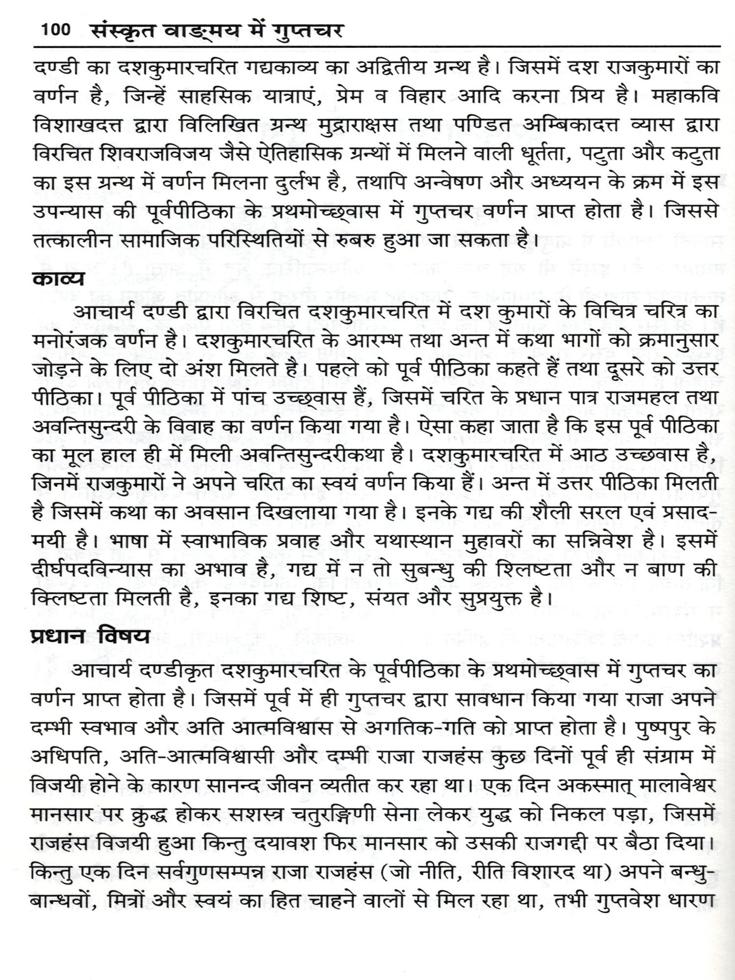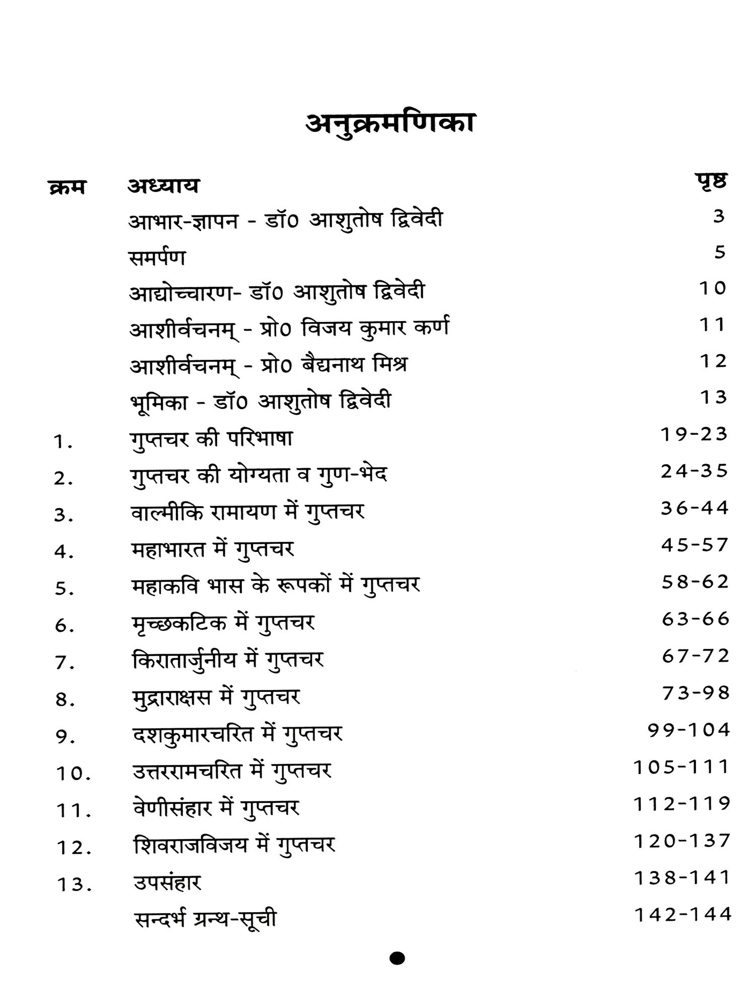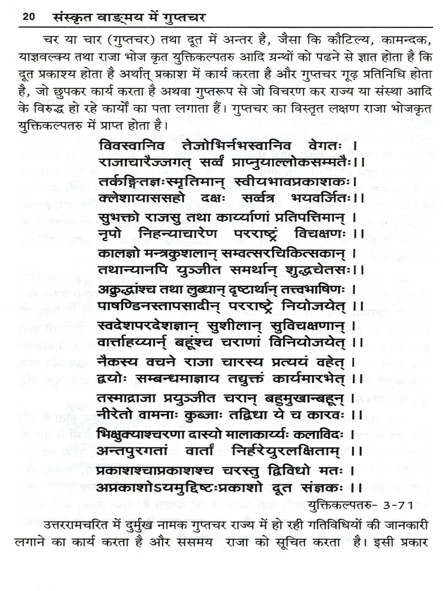 इस पुस्तक में आदिकाव्य वाल्मीकि रामायण से अम्बिकादत्त व्यास विरचित शिवराजविजय पर्यन्त सभी ग्रन्थों में वर्णित गुप्तचर के अलग-अलग स्वरूप दिखाई पड़ते है। जो विभिन्न विधाओं से अपने स्वामी सहित सम्पूर्ण प्रजा की रक्षा की जिम्मेदारियाँ निभाते है तथा प्रतिवेशी राजा के दुष्ट योजनाओं का भेदन करते है।