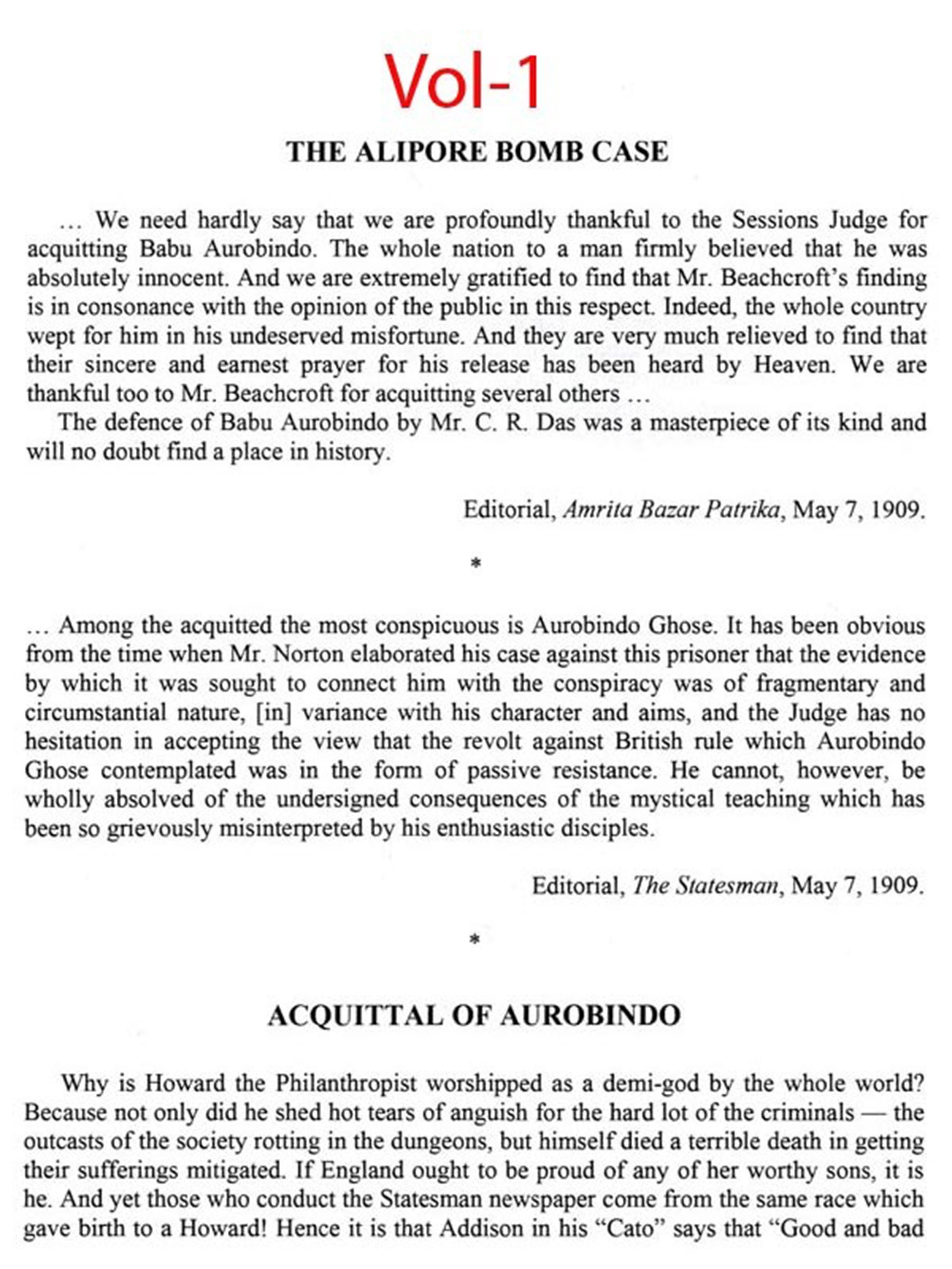 The speeches of Sri Aurobindo which he had delivered in 1909 after his acquittal from the Alipore Bomb Trial had appeared in the Bengalee and the Karmayogin (of which he was the editor) Since the texts of his speeches have been published by Sri Aurobindo Ashram Publication Department as a separate book entitled Speeches as well as included in the volume Karmayogin: Political Writings and Speeches 1909-1910, these have not been incorporated in the present volume with the exception of two speeches the texts of which had appeared in the Times of India on 11th and 15th October 1909 respectively.