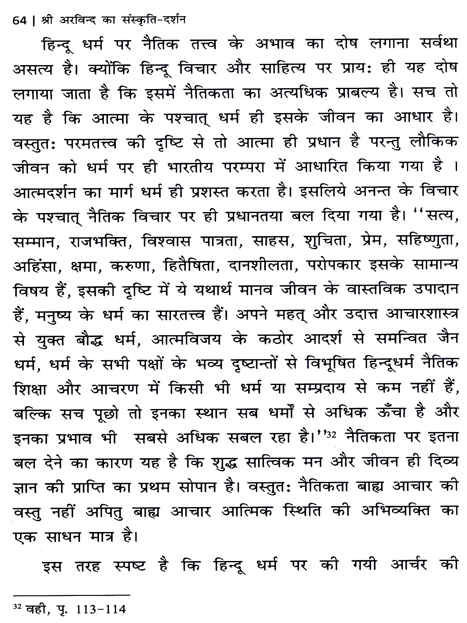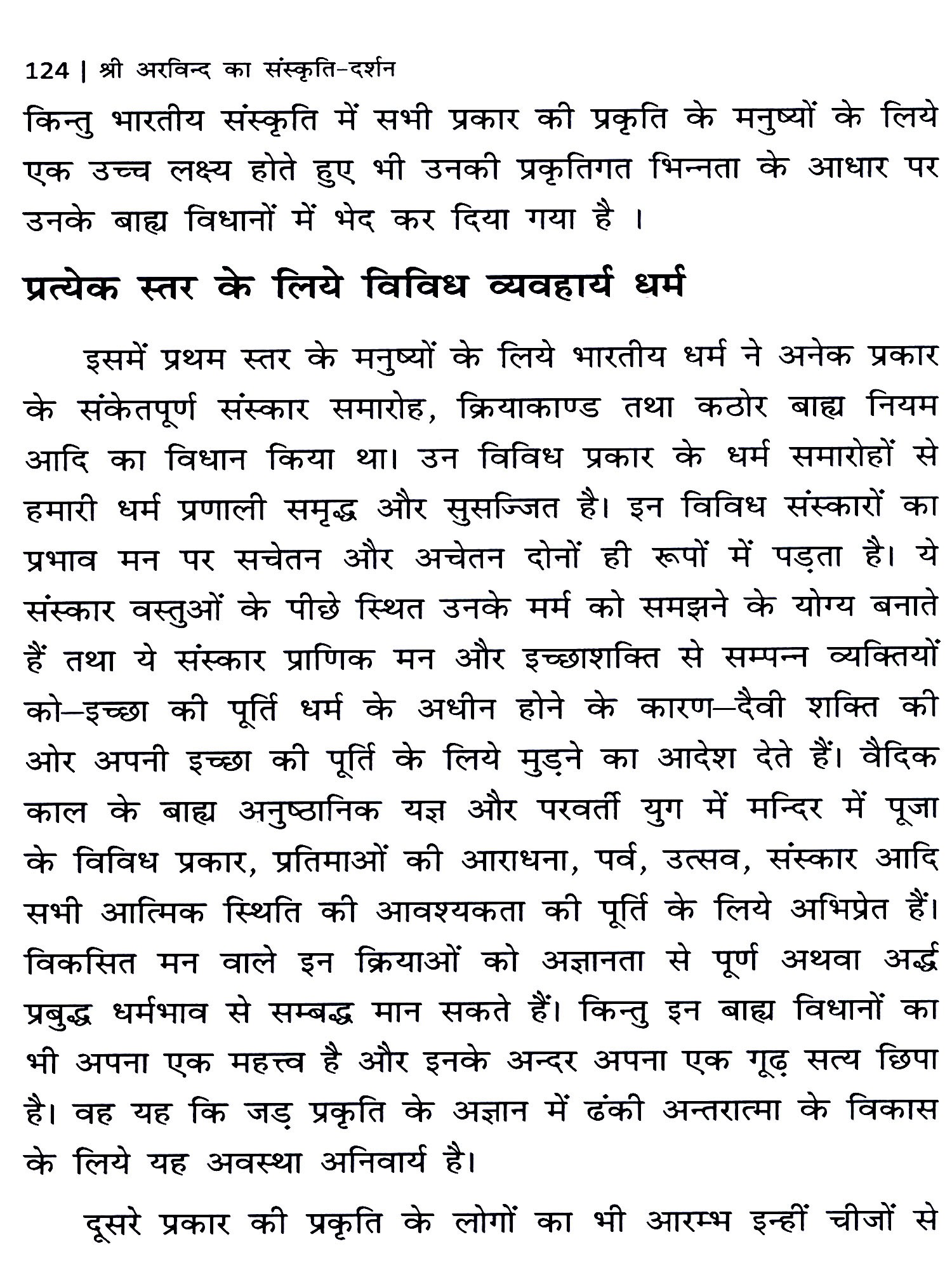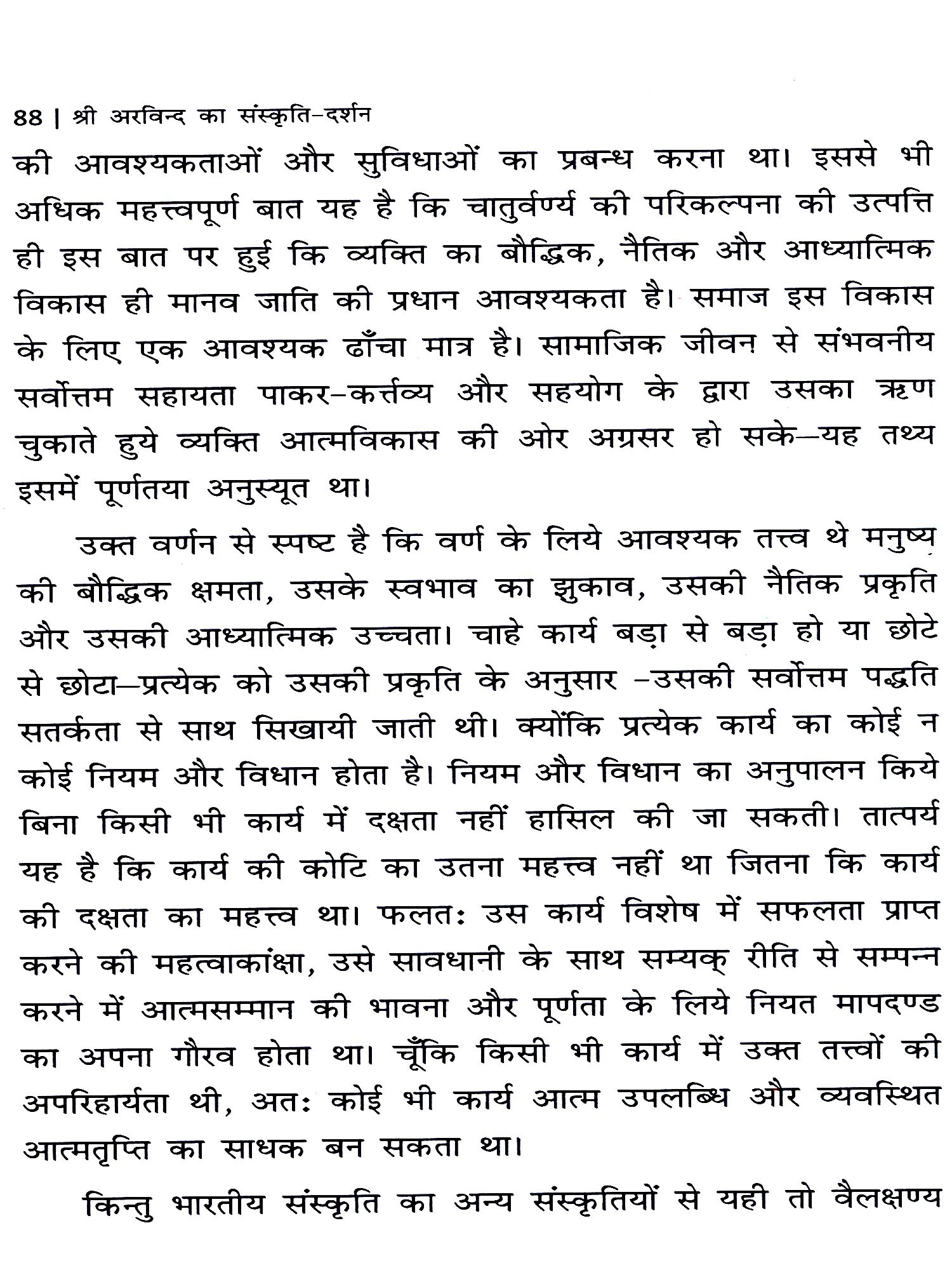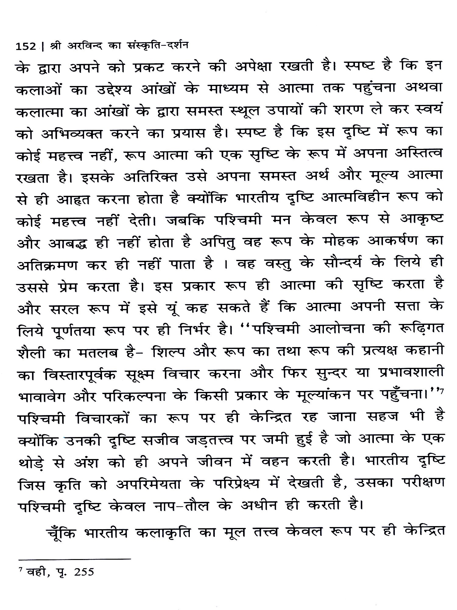 प्रस्तुत पुस्तक में संस्कृति के विविध पक्षों यथा धर्म, दर्शन, काव्य, कला, समाज आदि का निरूपण किया गया है। पाश्चात्य संस्कृति के आलोक में की गयी भारतीय संस्कृति की आलोचना की आधारहीनता को प्रस्तुत करने के साथ ही भारतीय संस्कृति के लक्ष्य को भी इस ग्रंथ में प्रतिपादित किया गया है। भारतीय संस्कृति में मनुष्य की सान्त चेतना के अधिकाधिक विकास पर बल दिया गया है। इस संस्कृति में जीवन को ही सर्वस्व मानकर विचार प्रस्तुत नहीं किया गया है अपितु इस जीवन से परे भी देखने की चेष्टा की गयी है। इस प्रकार इस संस्कृति में सनातन और सांसारिक का अद्भुत समन्वय है। साथ ही यह ग्रंथ श्री अरविन्द दर्शन के सर्वथा अनालोचित पक्ष का उद्घाटन करता है।