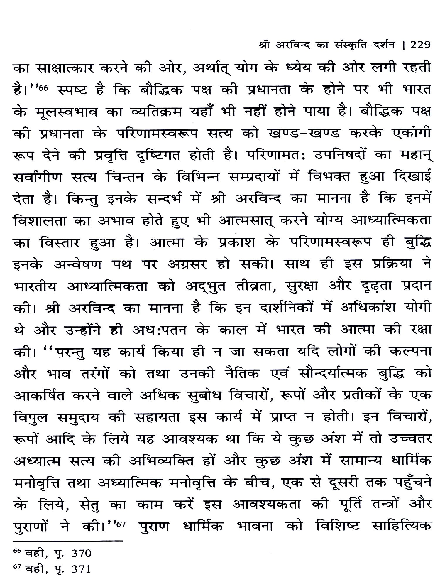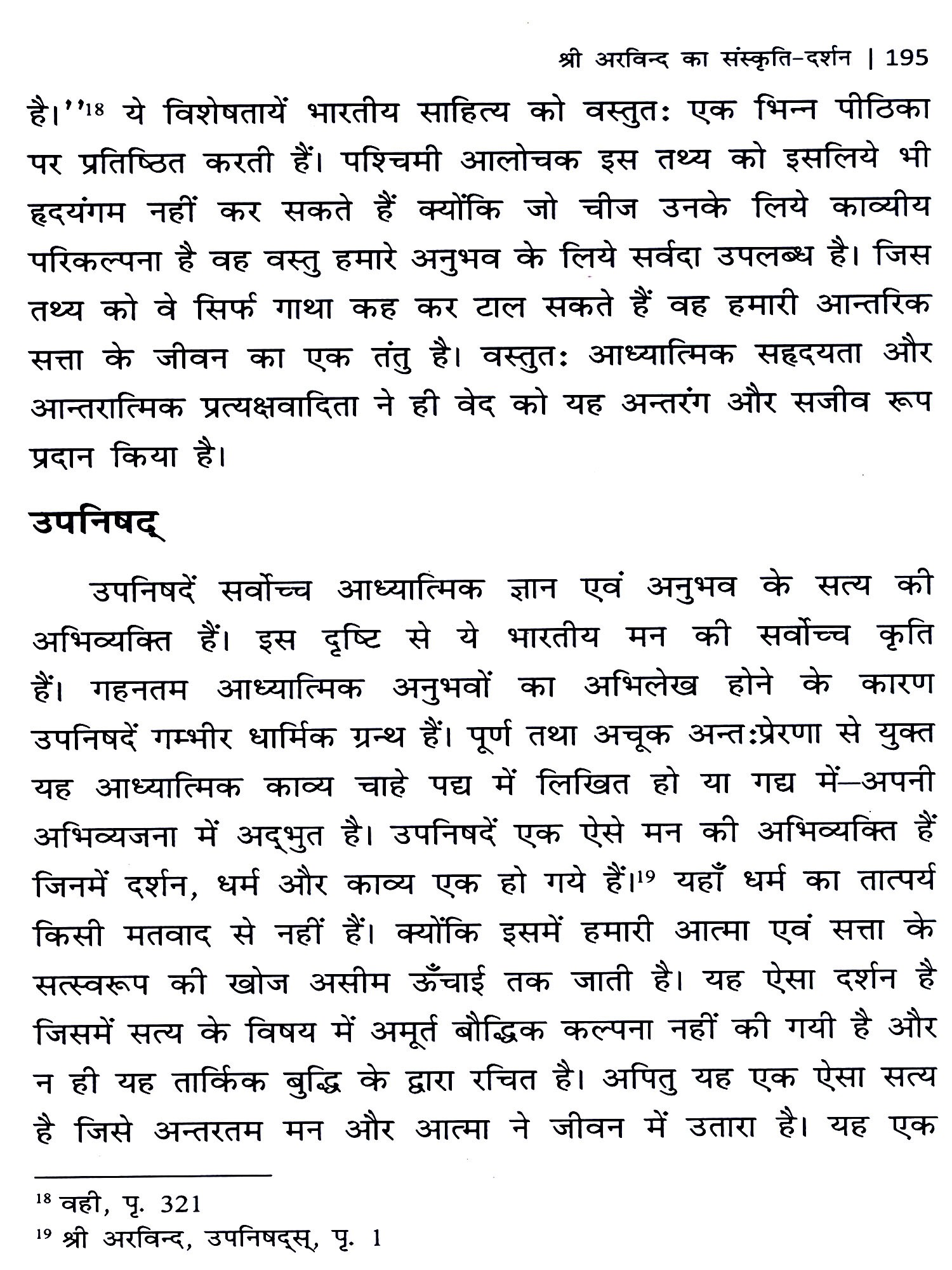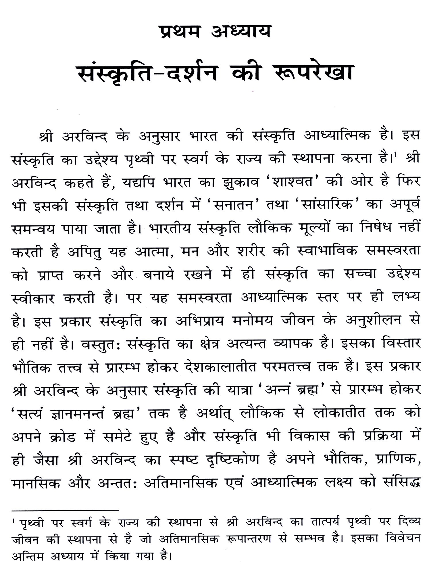 प्रस्तुत पुस्तक में संस्कृति के विविध पक्षों यथा धर्म, दर्शन, काव्य, कला, समाज आदि का निरूपण किया गया है। पाश्चात्य संस्कृति के आलोक में की गयी भारतीय संस्कृति की आलोचना की आधारहीनता को प्रस्तुत करने के साथ ही भारतीय संस्कृति के लक्ष्य को भी इस ग्रंथ में प्रतिपादित किया गया है। भारतीय संस्कृति में मनुष्य की सान्त चेतना के अधिकाधिक विकास पर बल दिया गया है। इस संस्कृति में जीवन को ही सर्वस्व मानकर विचार प्रस्तुत नहीं किया गया है अपितु इस जीवन से परे भी देखने की चेष्टा की गयी है। इस प्रकार इस संस्कृति में सनातन और सांसारिक का अद्भुत समन्वय है। साथ ही यह ग्रंथ श्री अरविन्द दर्शन के सर्वथा अनालोचित पक्ष का उद्घाटन करता है।