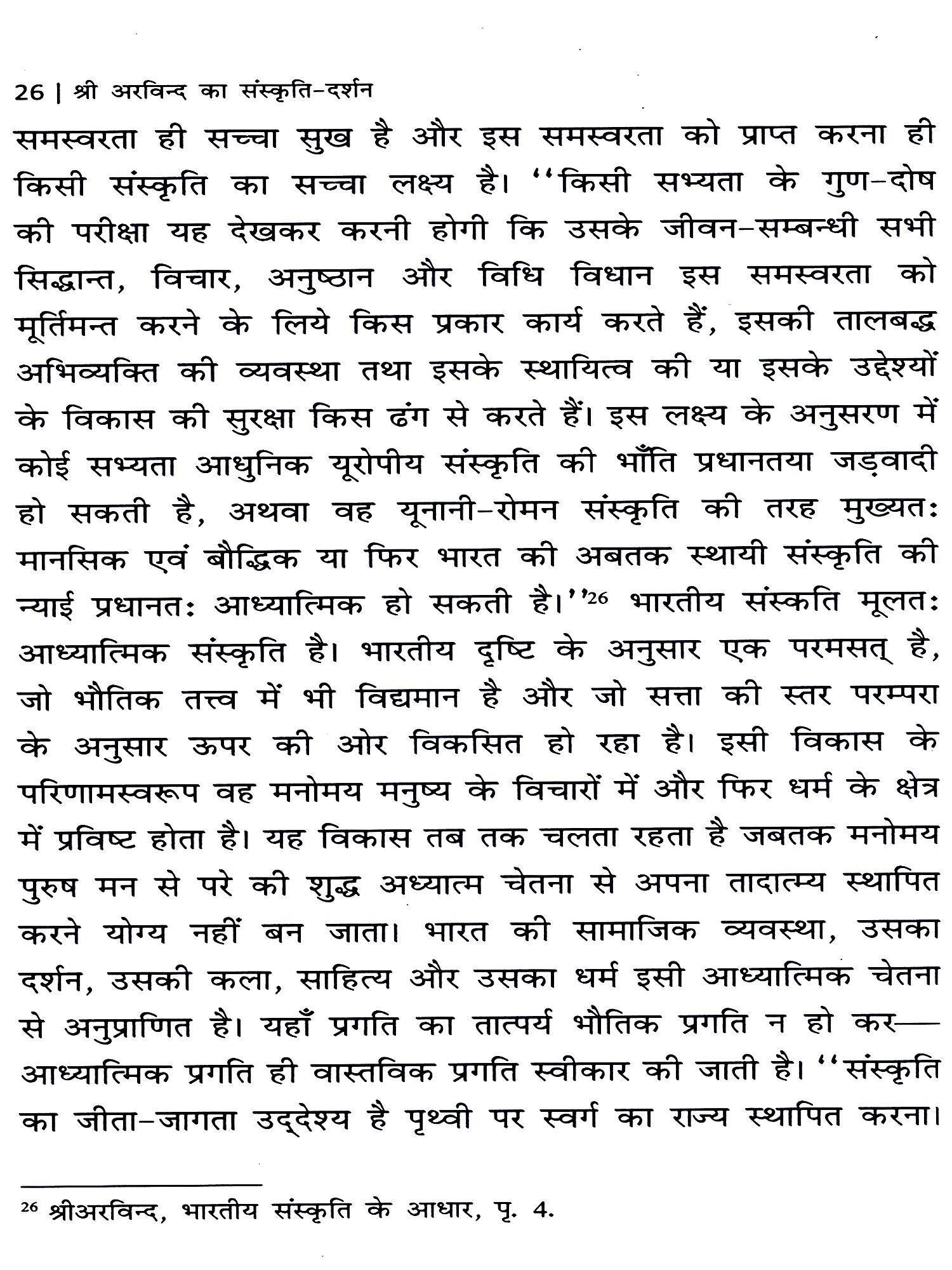 श्री अरविन्द के अनुसार भारतीय संस्कृति की महानता इस बात में है कि इसने मनुष्य की सान्त चेतना के अधिकाधिक विकास पर बल दिया है। उसने इस जीवन को ही सर्वस्व मानकर विचार नहीं किया है अपितु इस जीवन के परे भी देखने की चेष्टा की है। उसका आदर्श है असत् से सत् की ओर गमन, अन्धकार से प्रकाश की ओर गमन तथा मृत्यु से अमरत्व की ओर गमन। संक्षेप में उसका लक्ष्य ईश्वर. सुपूर्णता, सत्य, आनन्द, अमृतत्व की प्राप्ति के रूप में प्रकट हुआ है। इस प्रकार मानव पूर्णता की पराकाष्ठा मरणशील मनुष्यत्व नहीं अपित अमरता, स्वतंत्रता और दिव्यता भी उसकी अवाप्ति की सीमाओं में ही है- और इस अन्तर्दृष्टि ने जीवन विषयक यहां के सम्पूर्ण विचार को अनुप्राणित किया है। भारतीय संस्कृति ने आत्मा को ही मनुष्य की सत्ता का सत्यस्वरूप स्वीकार किया है और मानव जीवन का सर्वोच्च लक्ष्य अध्यात्म-चेतना की प्राप्ति को ही माना है। यह लक्ष्य सिर्फ आदर्श के रूप में ही नहीं रहा अपितु इस लक्ष्य को सम्मुख रख कर वर्णाश्रम व्यवस्था के माध्यम से सम्पूर्ण सामाजिक ढांचे को आध्यात्मिकता की ओर मोड़ देने का प्रयास भी किया गया। यही कारण है कि भारत में धर्म जीवन से भिन्न कोई तत्त्व नहीं अपितु भारतीय संस्कृति के अनुसार धर्म हमारे जीवन के सभी अंगों के कार्य व्यापार का यथार्थ विधान है। यद्यपि धर्म अपने सार-रूप में एक स्थिर वस्तु है परन्तु फिर भी यह हमारी चेतना में विकसित होता है और उसकी कुछ क्रमिक अवस्थायें होती हैं और अन्ततः विकास की प्रक्रिया में आध्यात्मिकता या विज्ञानमयी चेतना की अवाप्ति ही इसका लक्ष्य है। यद्यपि भारत का प्रबल झुकाव 'शाश्वत' की ओर है क्योंकि वह सदा ही उच्चतम वास्तविक तत्त्व रहा है तथापि उसकी संस्कृति में 'सनातन' तथा 'सांसारिक' का अद्भुत समन्वय पाया जाता है परन्तु इस समन्वय को, उसे कहीं बाहर से नहीं प्राप्त करना है क्योंकि श्री अरविन्द के अनुसार बाह्य रूप आत्मा का ही गतिच्छन्द है और विशुद्ध आत्मा की तरह ही महत्त्वपूर्ण है। इसीलिये श्री अरविन्द आत्मा, मन और शरीर की स्वाभाविक समस्वरता को प्राप्त करने और बनाये रखने में ही संस्कृति का सच्चा उद्देश्य स्वीकार करते हैं। अतः यहां आत्मा की सर्वोच्च सत्ता स्वीकार करके भी जीवन का निषेध नहीं किया गया है।